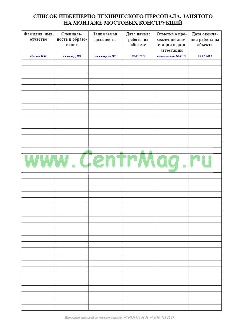Список инженерно-технического персонала, занятого на монтаже мостовых конструкций