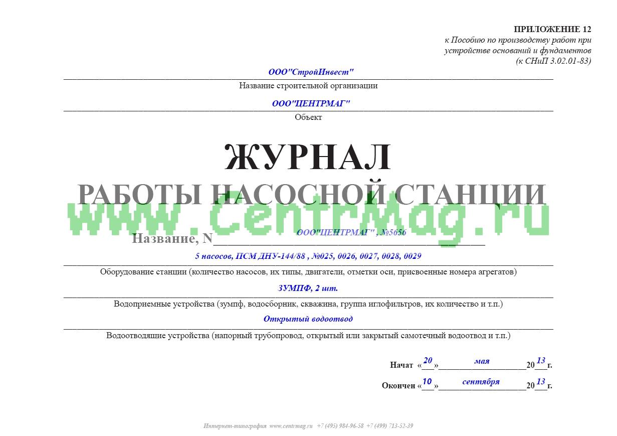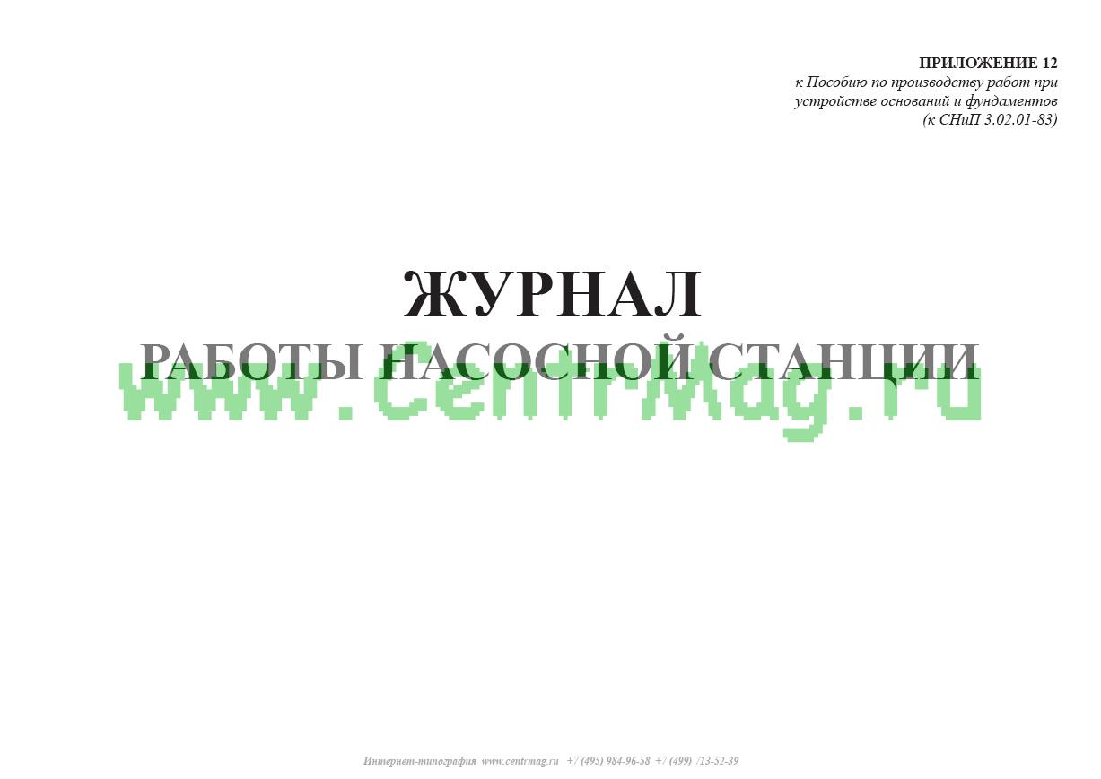 Форма журнала работы насосной станции соответствует Приложению 12 к Пособию по производству работ при устройстве оснований и фундаментов (к СНиП 3.02.01-83), которое утратило силу.