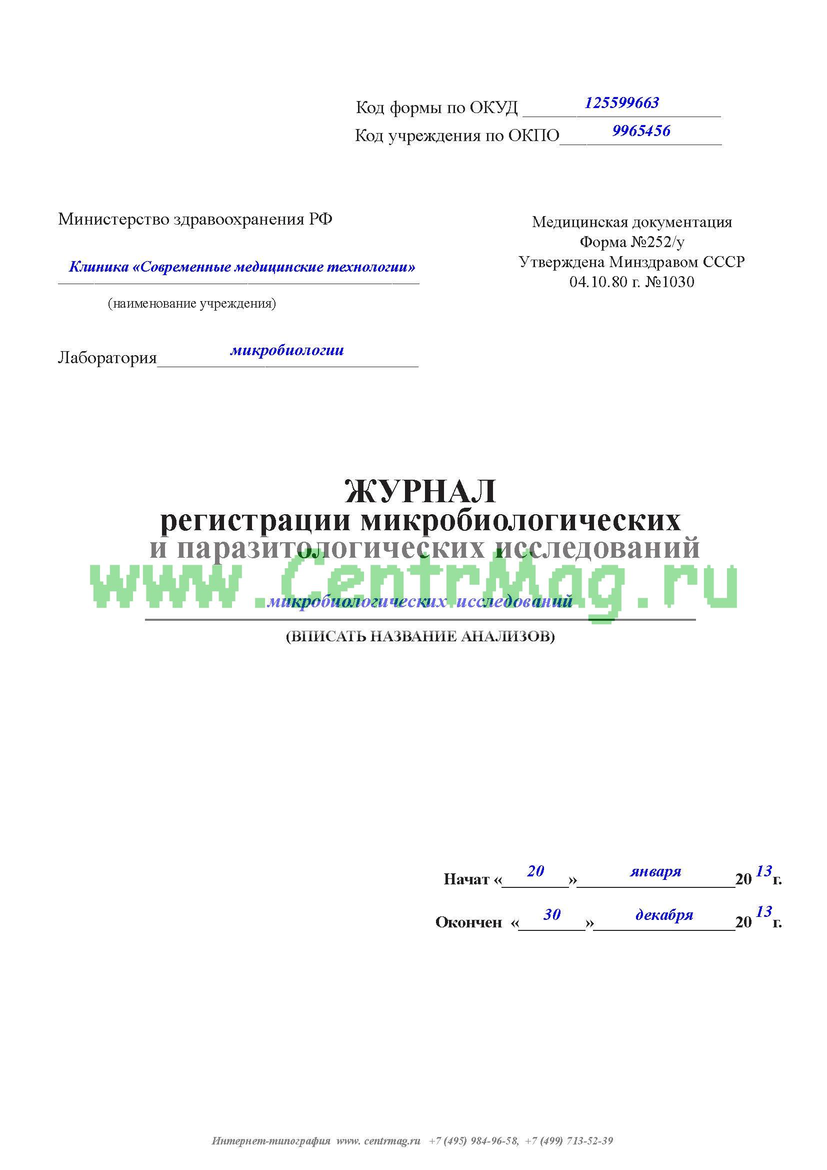 Форма журнала регистрации микробиологических и паразитологических исследований (Форма 252/у) утверждена Приказом Минздрава СССР № 1030 «Об утверждении форм первичной медицинской документации учреждений здравоохранения» от 04 октября 1980 (с изменениями на 31 декабря 2002 года)., который утратил силу.