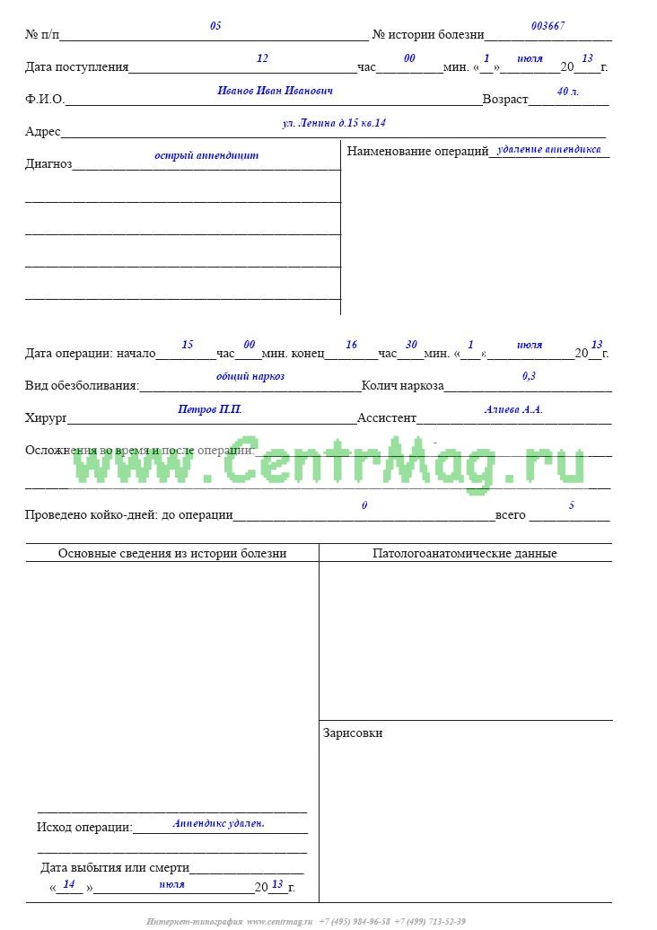 В журнале регистрируются все произведенные в клинике хирургические вмешательства, при этом кратко описывается ход операции, указывается вид обезболивания, записывается фамилия оперирующего хирурга и операционной сестры.