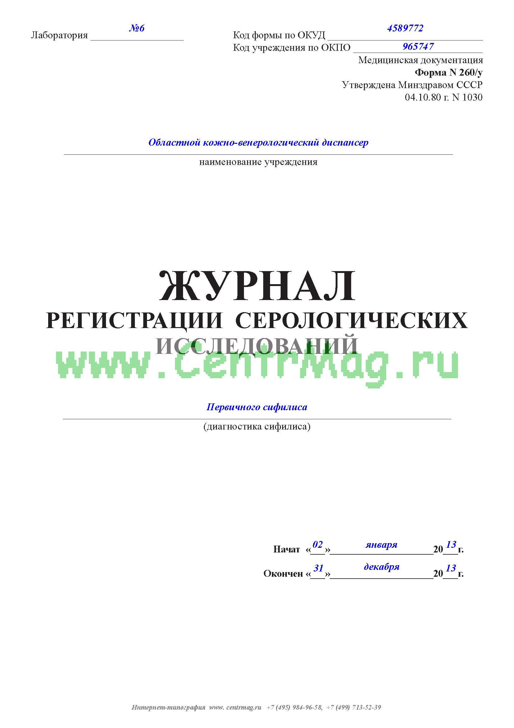Форма журнала регистрации серологических исследований (диагностика сифилиса) форма 260/у утверждена Приказом Минздрава СССР №1030 «Об утверждении форм первичной медицинской документации учреждений здравоохранения» от 04 октября 1980 (с изменениями на 31 декабря 2002 года)., который утратил силу.