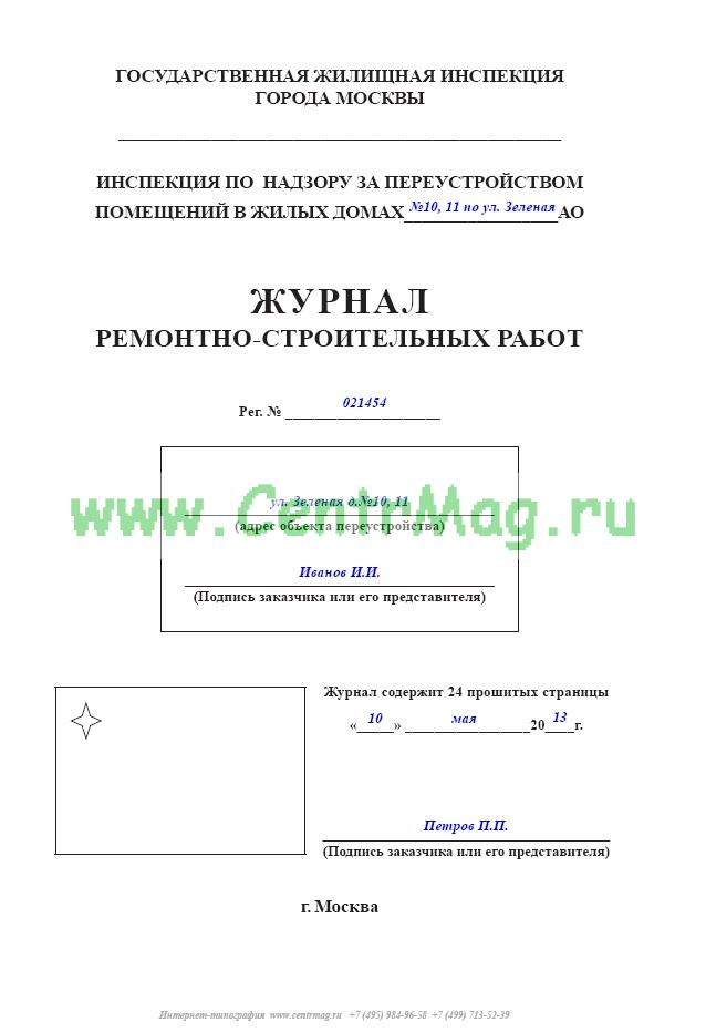 Одновременно с получением разрешения жилищной инспекции на перепланировку, собственнику выдается журнал ремонтно-строительных работы. В данный документ вносятся все этапы производства ремонтно-строительных работ. Обычно его заполняет прораб, однако если ремонт ведется собственными силами, то заполнять журнал ремонтно-строительных работ обязан владелец квартиры.