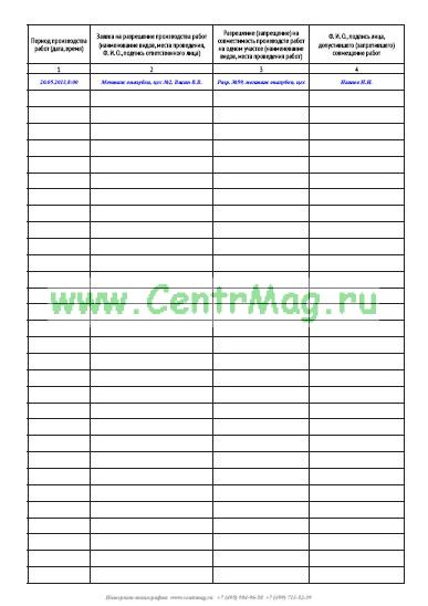 2. Заявка на разрешение производства работ (наименование видов, места проведения, Ф. И. О., подпись ответственного лица)