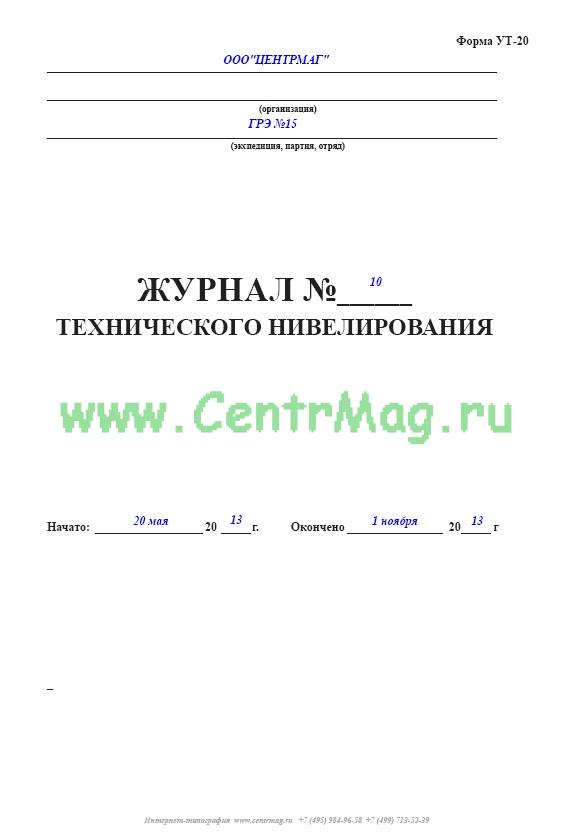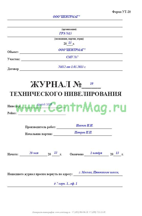 Форма журнала технического нивелирования соответствует Приложению 21 к "Пособию по составлению и оформлению документации инженерных изысканий для строительства. Часть1. Инженерно-геодезические изыскания (к СНИП ||-9-78)" (Форма УТ-20), которое утверждено приказом по ПНИИИС от 20 сентября 1984 г. № 268.