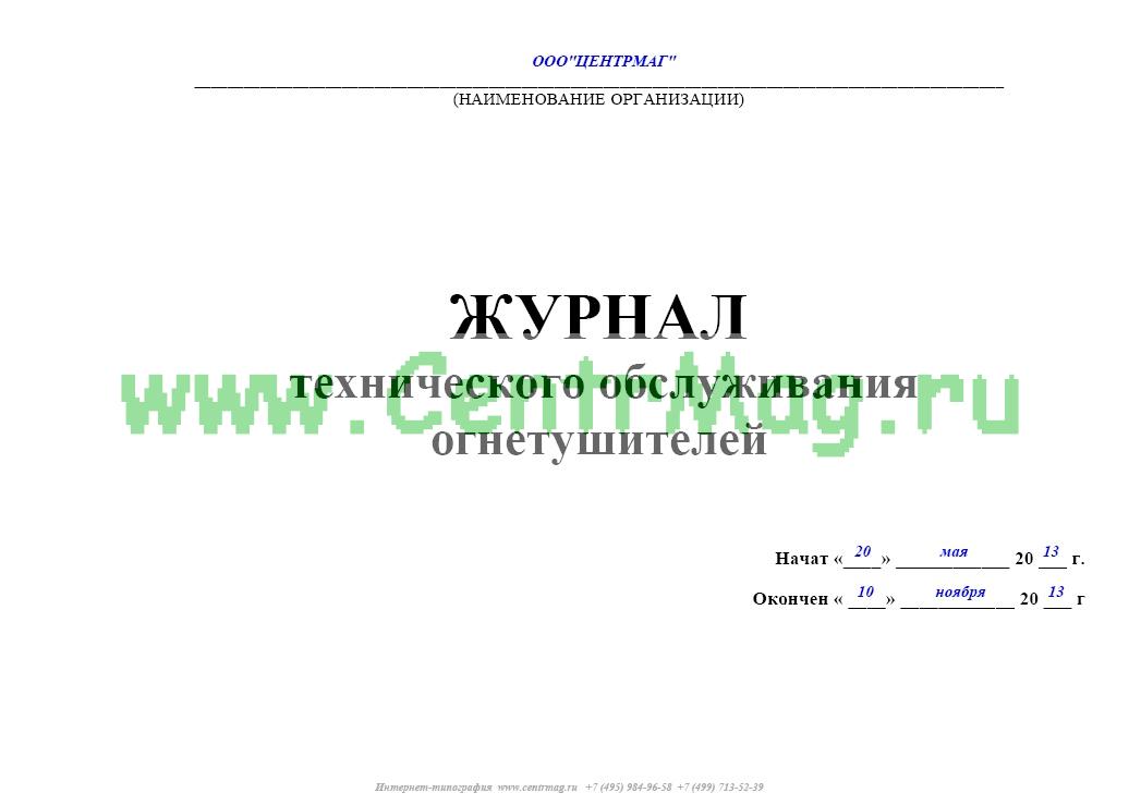 Форма журнала технического обслуживания огнетушителей соответствует Приложению Г.2 к "СП 9.13130.2009. Свод правил. Техника пожарная. Огнетушители. Требования к эксплуатации", а также Приложению 5 к НПБ 166-97 Пожарная техника. Огнетушители. Требования к эксплуатации, который утратил силу.