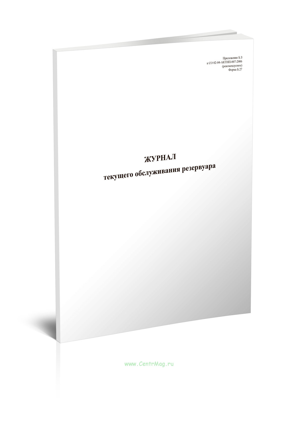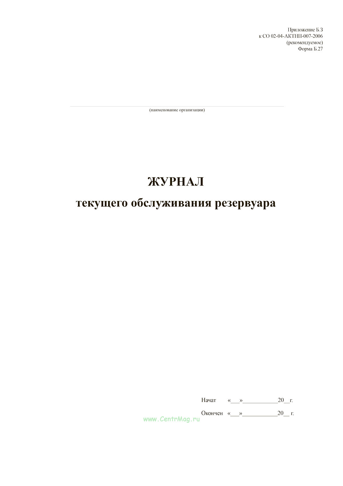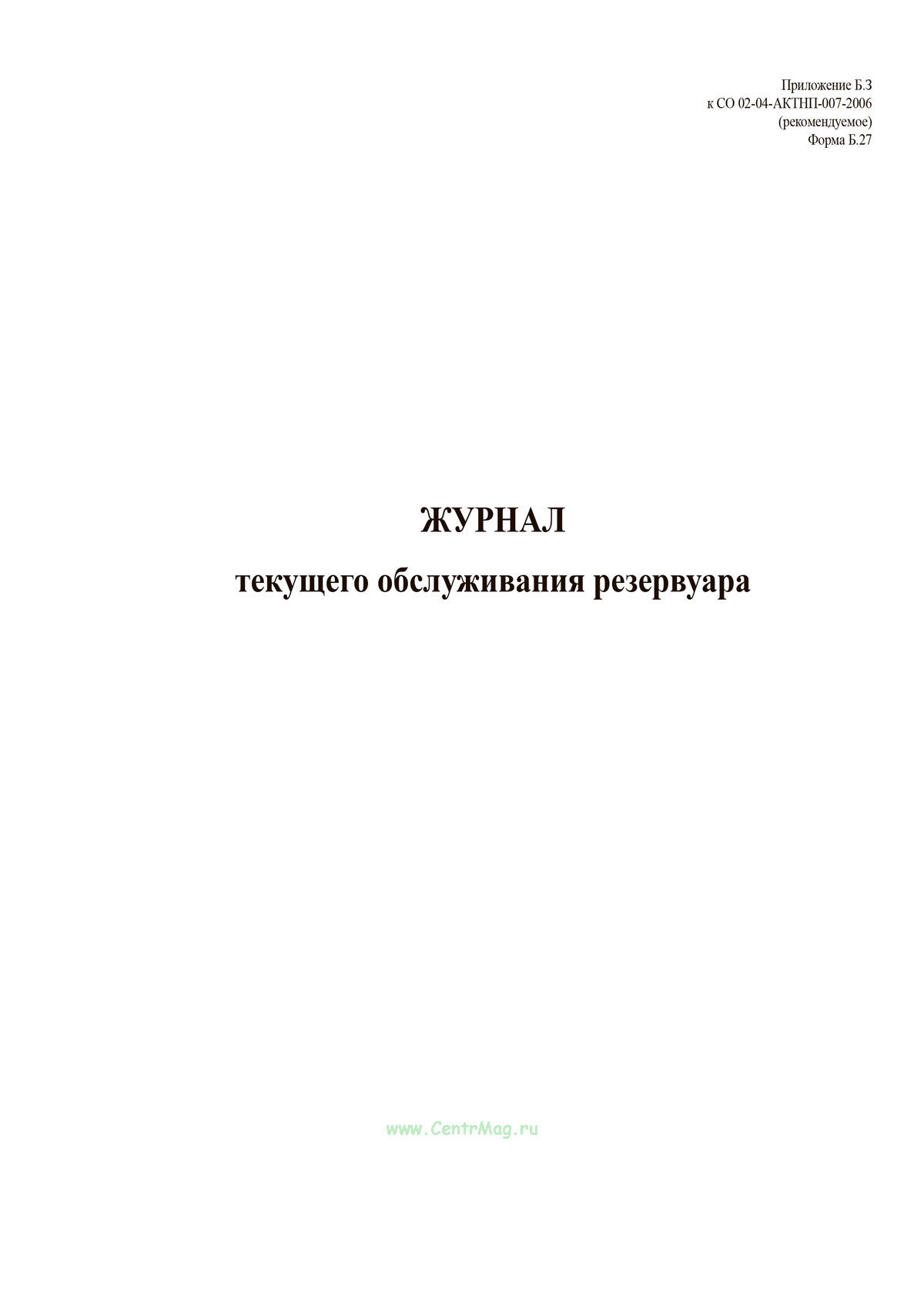 Форма Журнала текущего обслуживания резервуара (Форма Б.27) соответствует Приложению Б.З к СО 02-04-АКТНП-007-2006.
