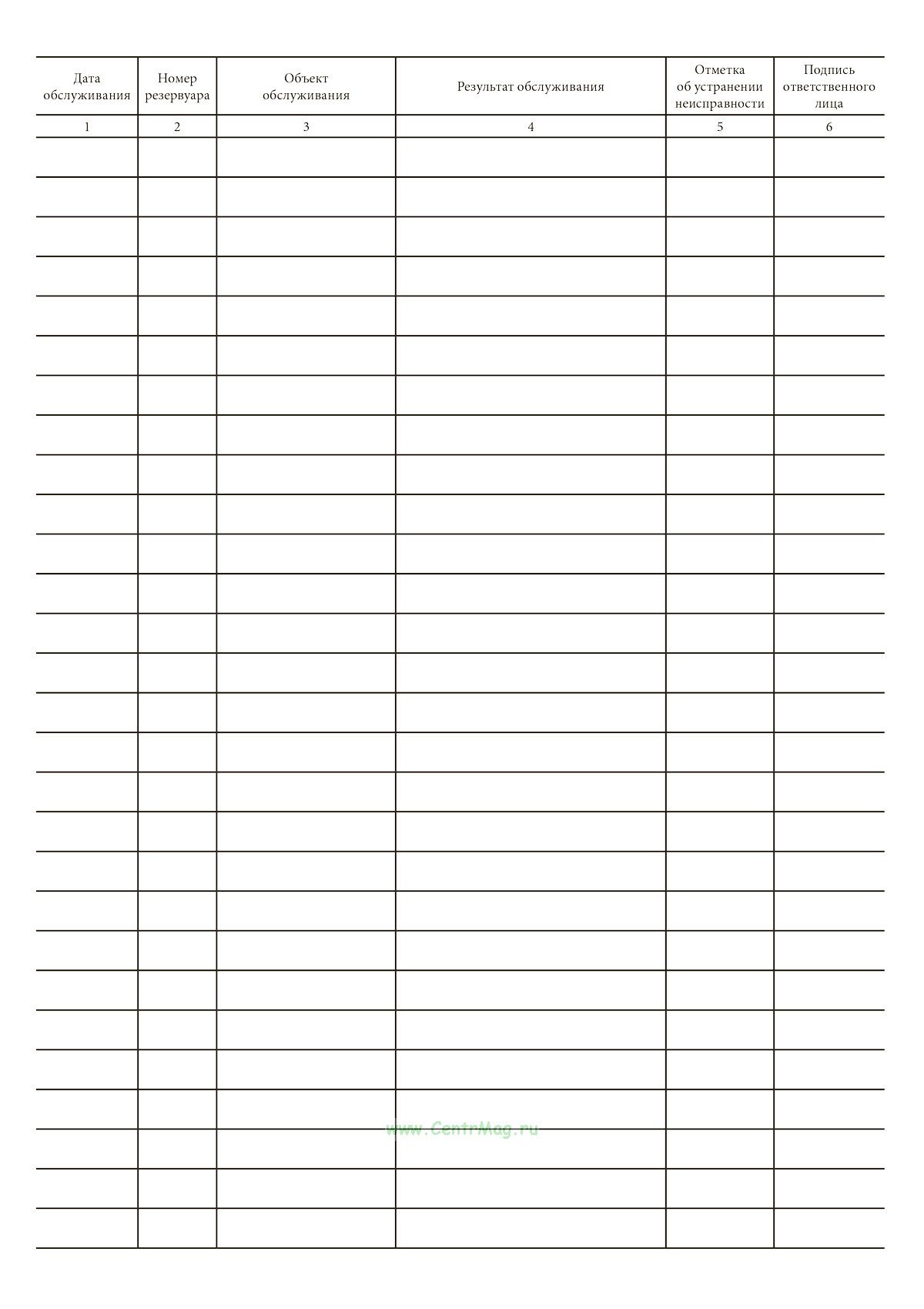 Журнал предназначен для систематической регистрации всех операций по техническому обслуживанию резервуаров, включая плановые осмотры, мелкий ремонт, проверку состояния оборудования и другие мероприятия, направленные на поддержание резервуара в исправном состоянии.