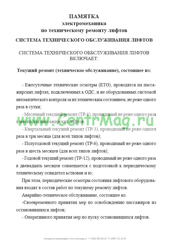 - Месячный текущий ремонт (ТР-1), проводимый не реже одного раза в месяц для пассажирских лифтов;