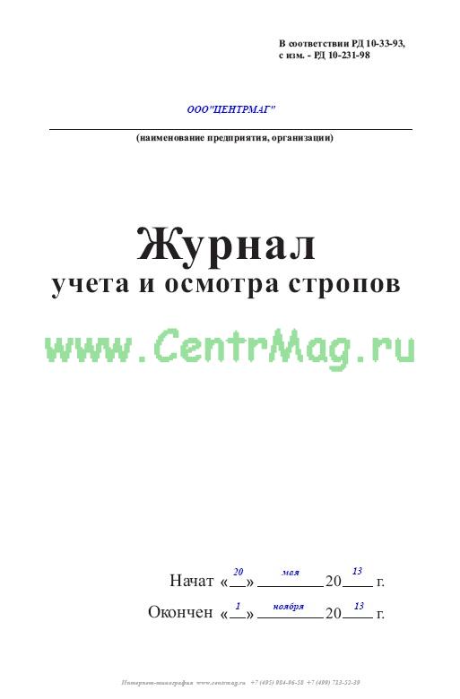 Форма журнала учета и осмотра стропов соответствует Приложению 5 к РД-10-33-93 Стропы грузовые общего назначения. Требования к устройству и безопасной эксплуатации, Приложение Б к Типовой инструкции по безопасной эксплуатации текстильных ленточных стропов (РД 220-14-98), ТИ Р М-007-2000. Типовая инструкция по охране труда для стропальщиков и некоторым др. нормативным документам.