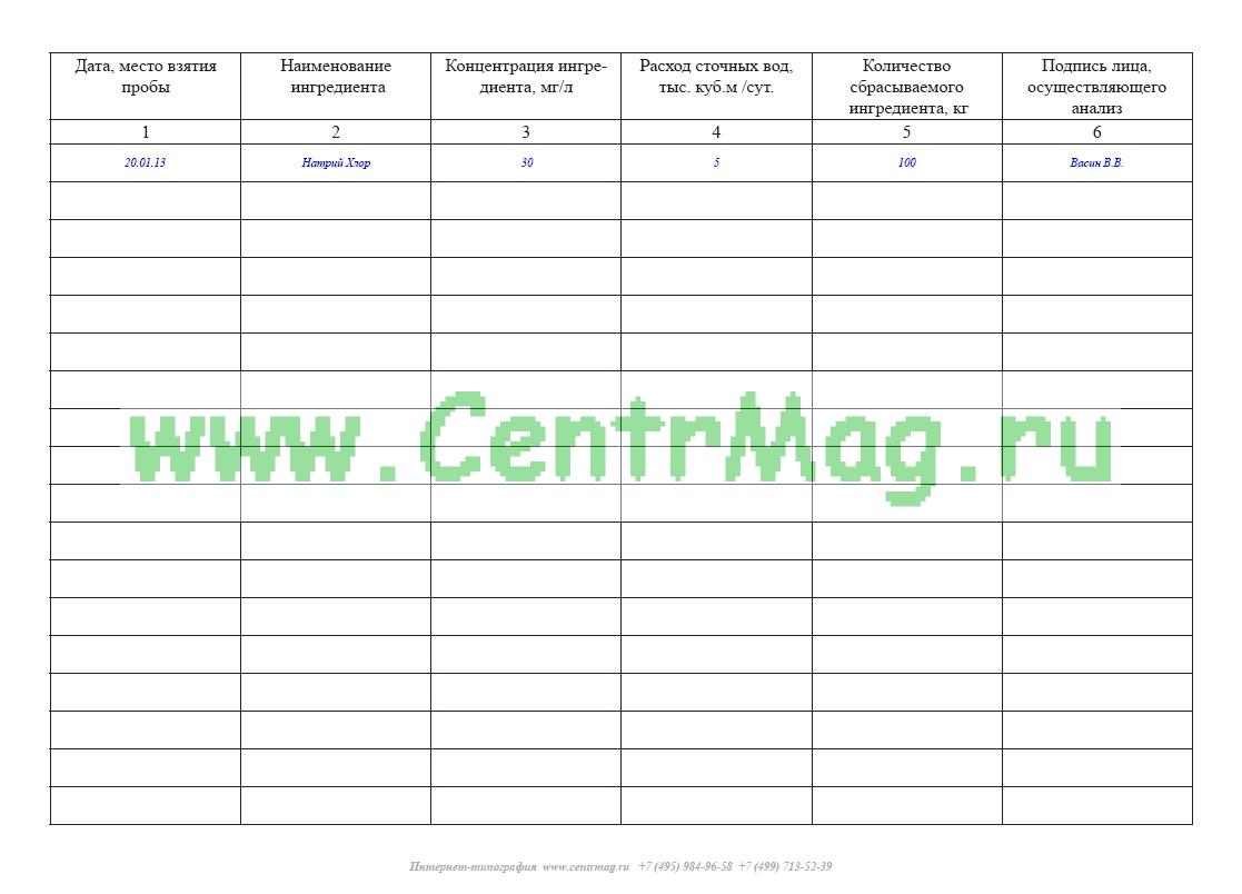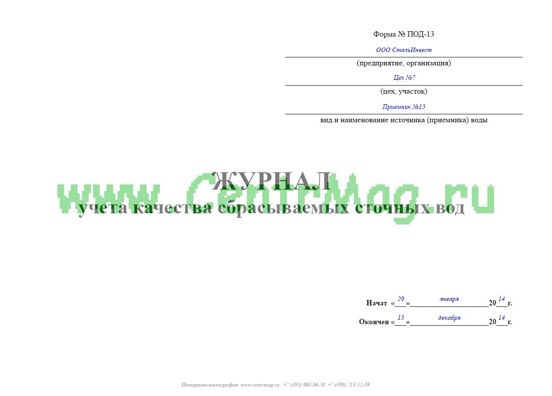 Форма применяется для учета количества ингредиентов, поступающих в водные объекты в составе сточных вод на каждом выпуске. Записи в журнале по форме ПОД-13 ведут на основании и по мере проведения физико-химических и биологических анализов сточных вод, результаты которых заносятся в графу 2.