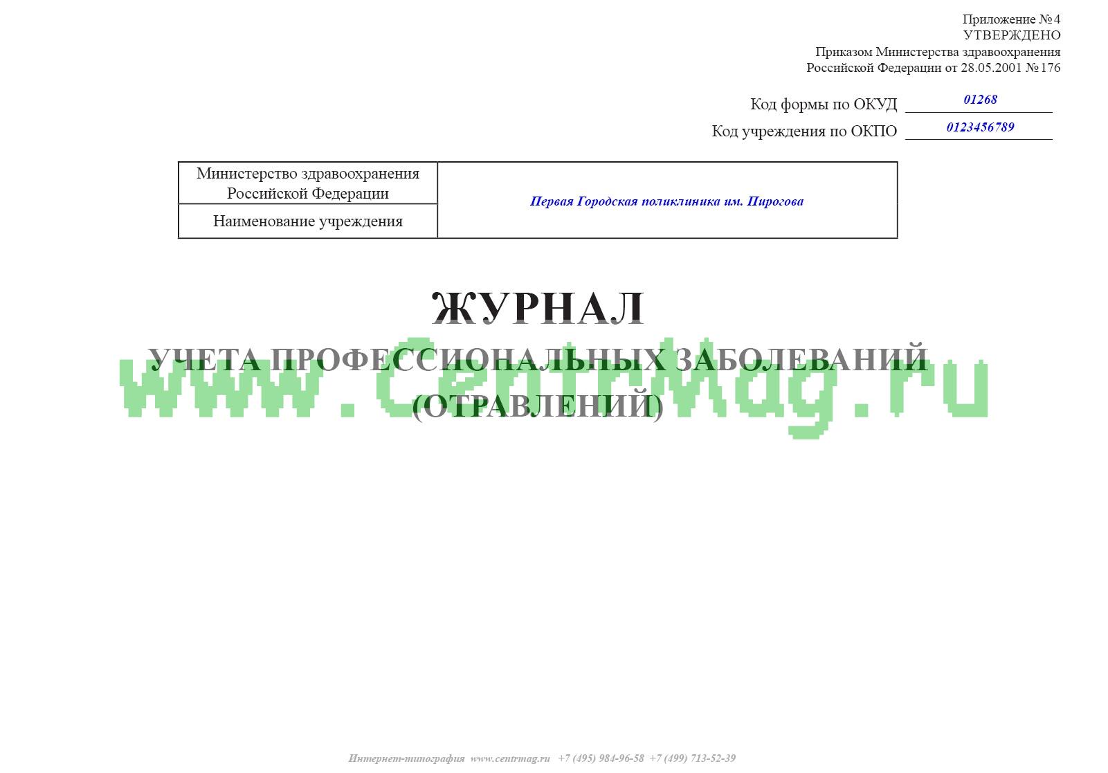 Форма Журнала учета профессиональных заболеваний (отравлений) соответствует Приложению № 4 к Приказу Минздрава РФ от 28.05.2001 № 176 «О совершенствовании системы расследования и учета профессиональных заболеваний в РФ».