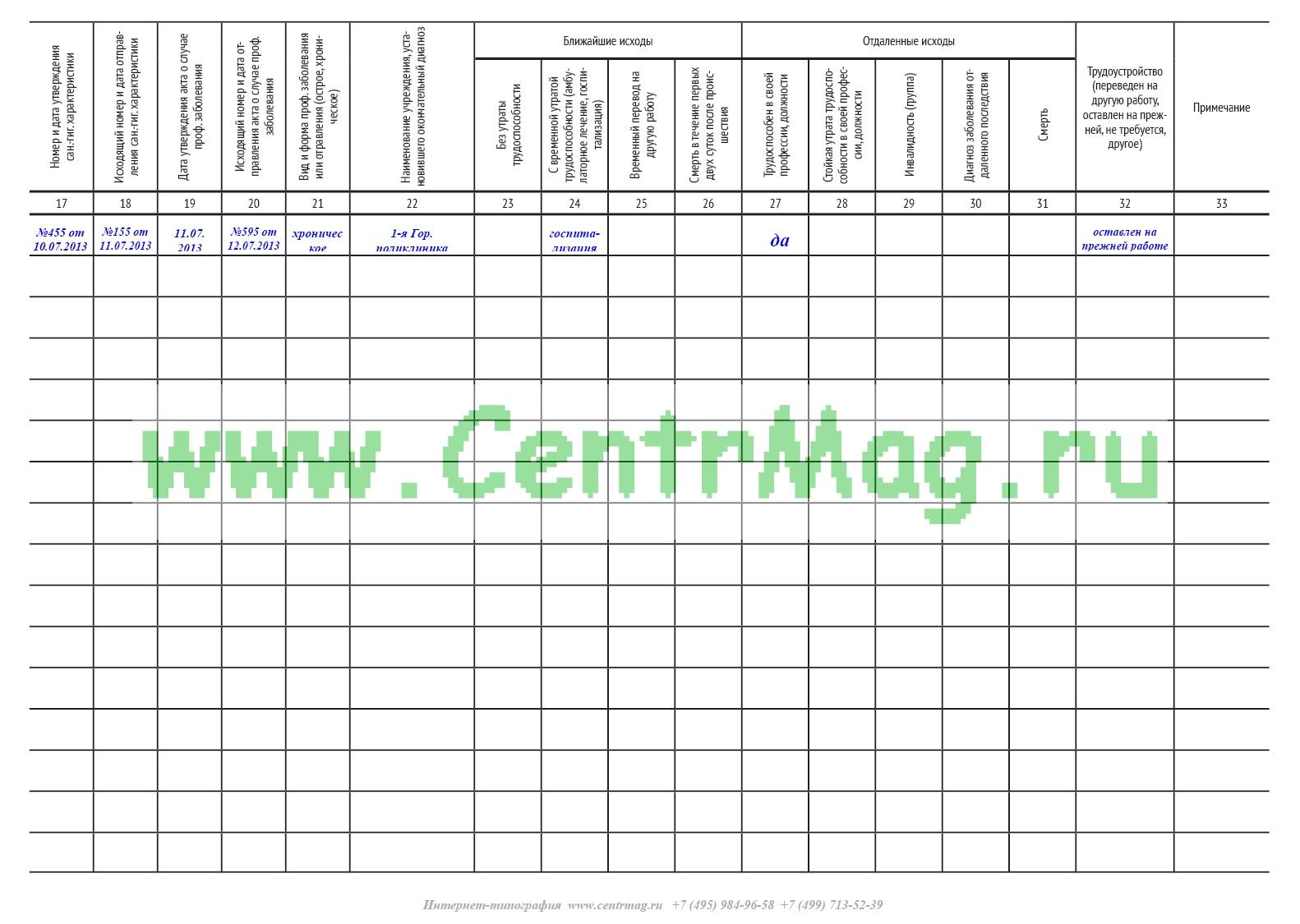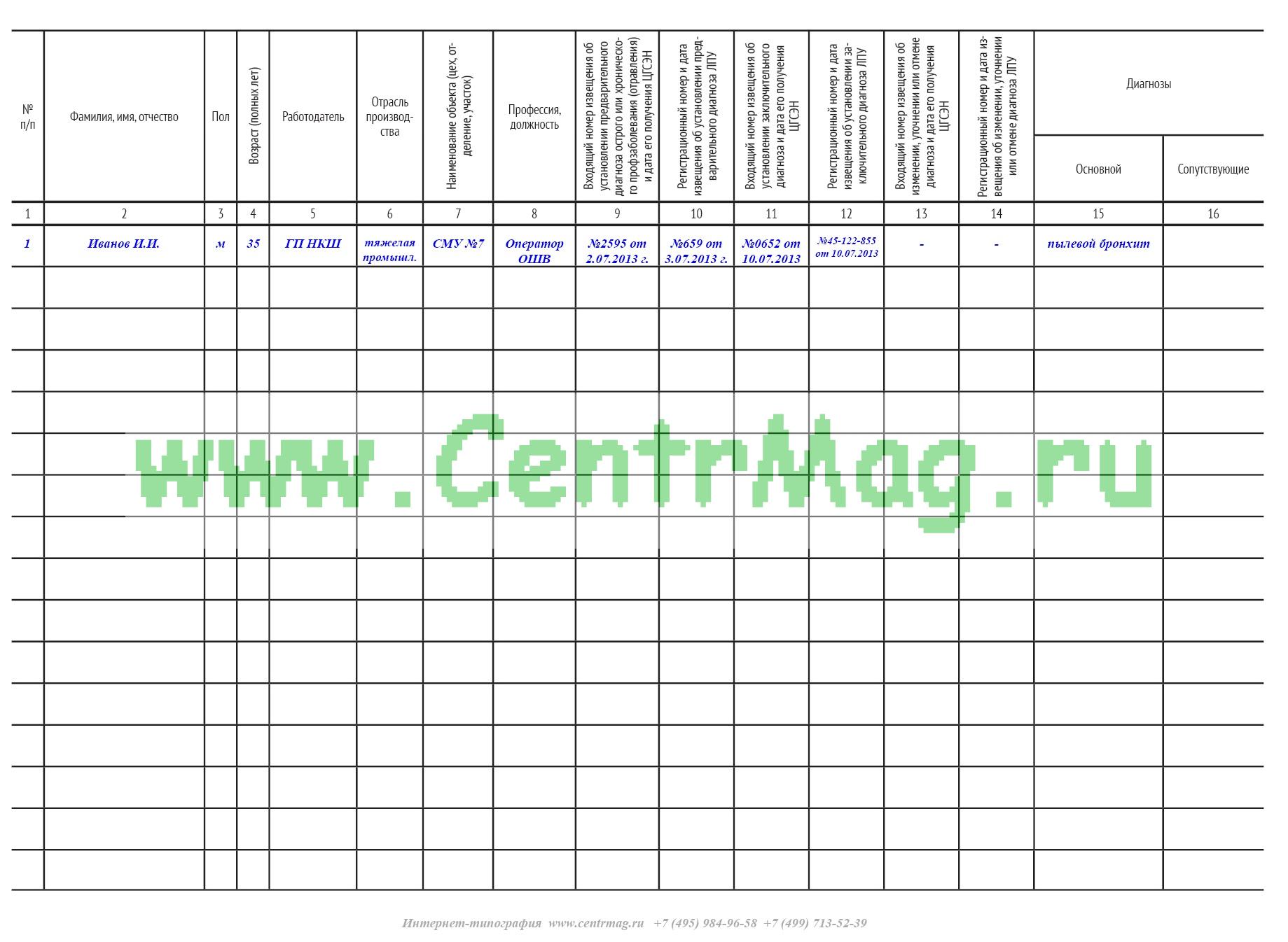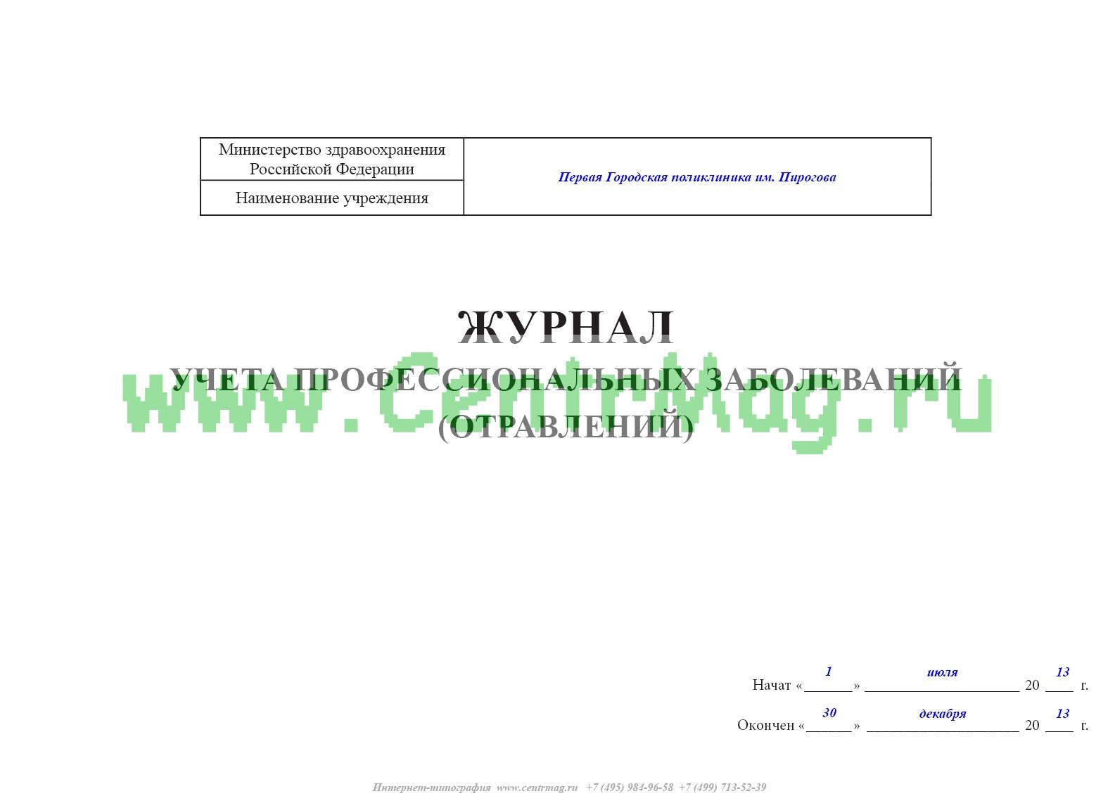 Для регистрации данных о пострадавших от профессиональных заболеваний (отравлений) в центрах госсанэпиднадзора ведется Журнал учета профессиональных заболеваний (отравлений).