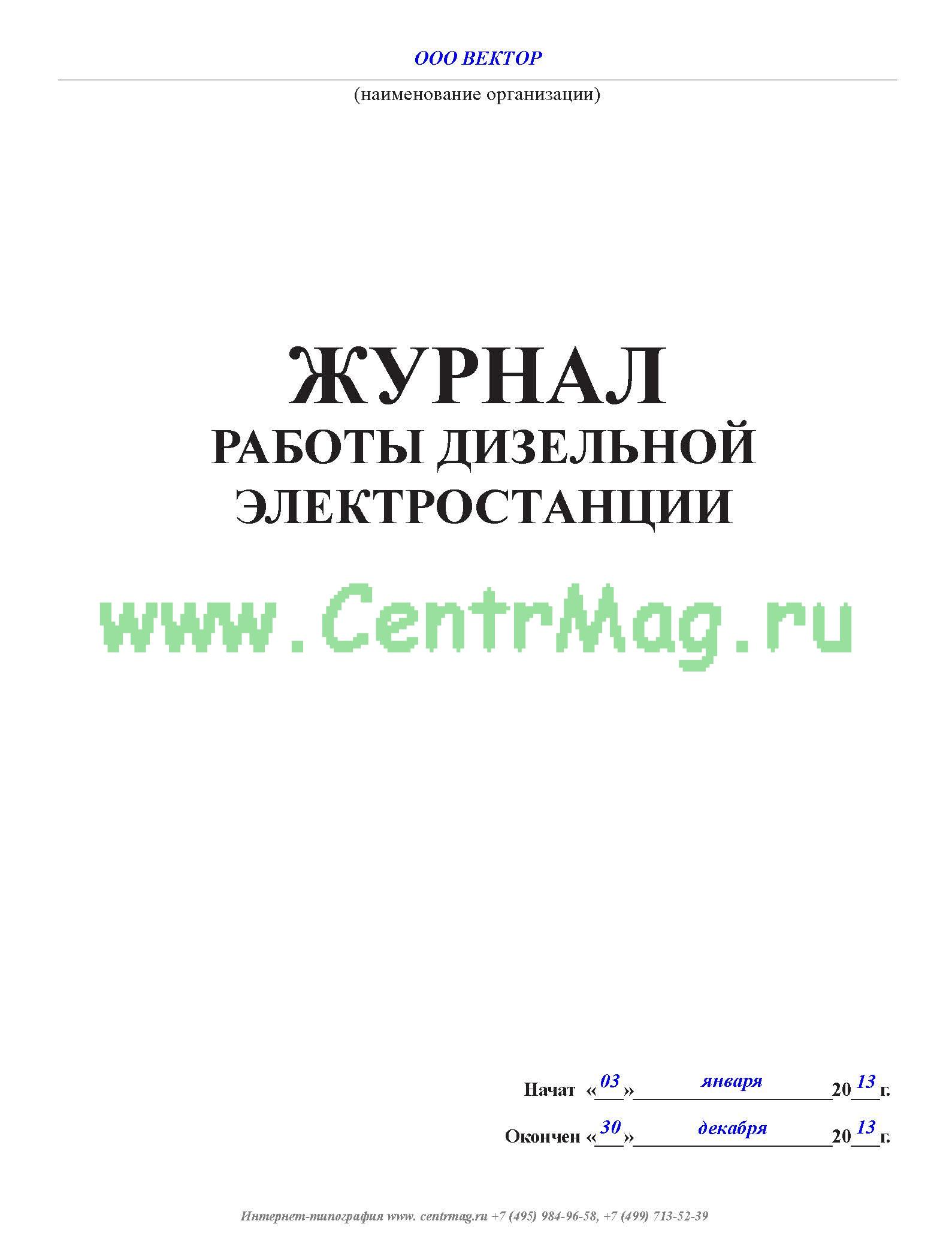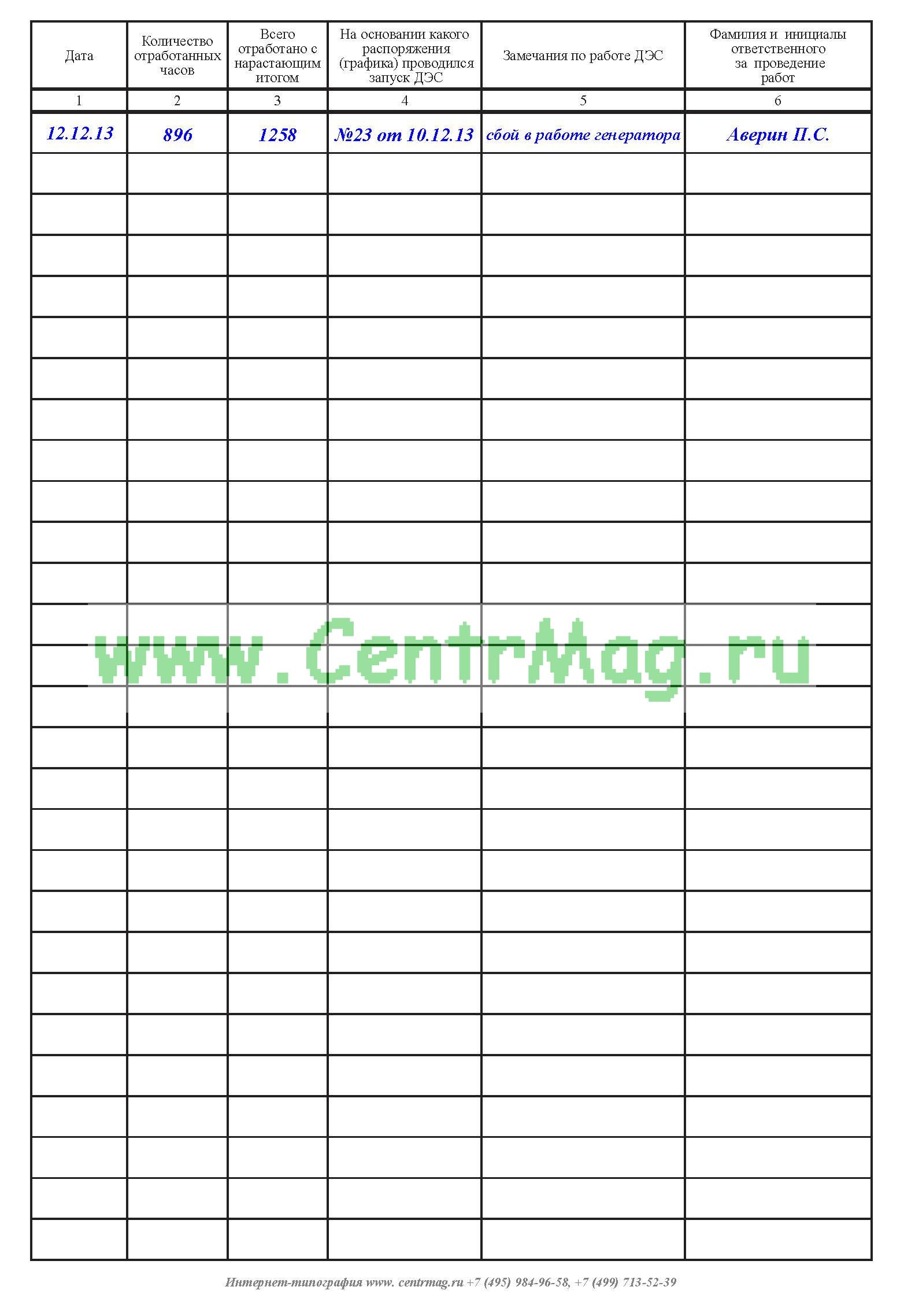 Форма журнала учета работы дизельной электростанции соответствует Приложению 10 к Приказу МЧС России № 583 «Об утверждении и введении в действие Правил эксплуатации защитных сооружений гражданской обороны.