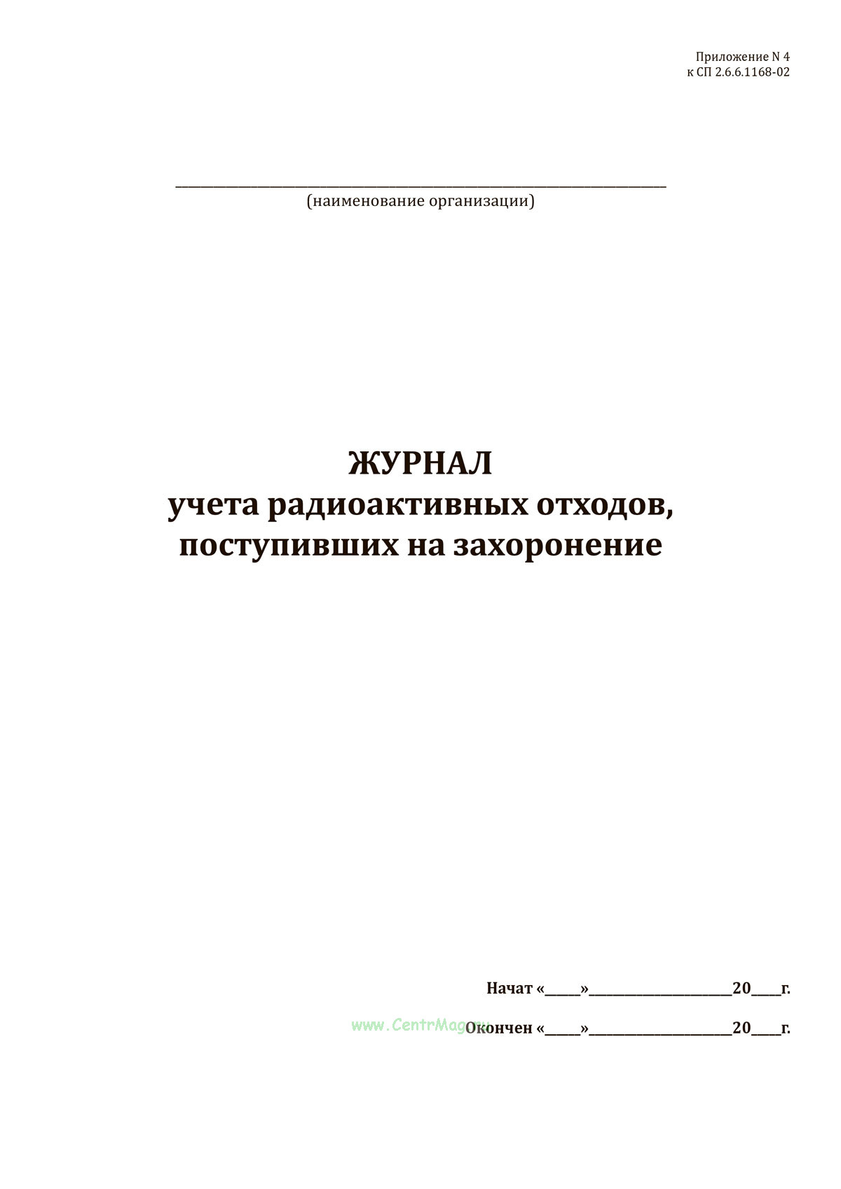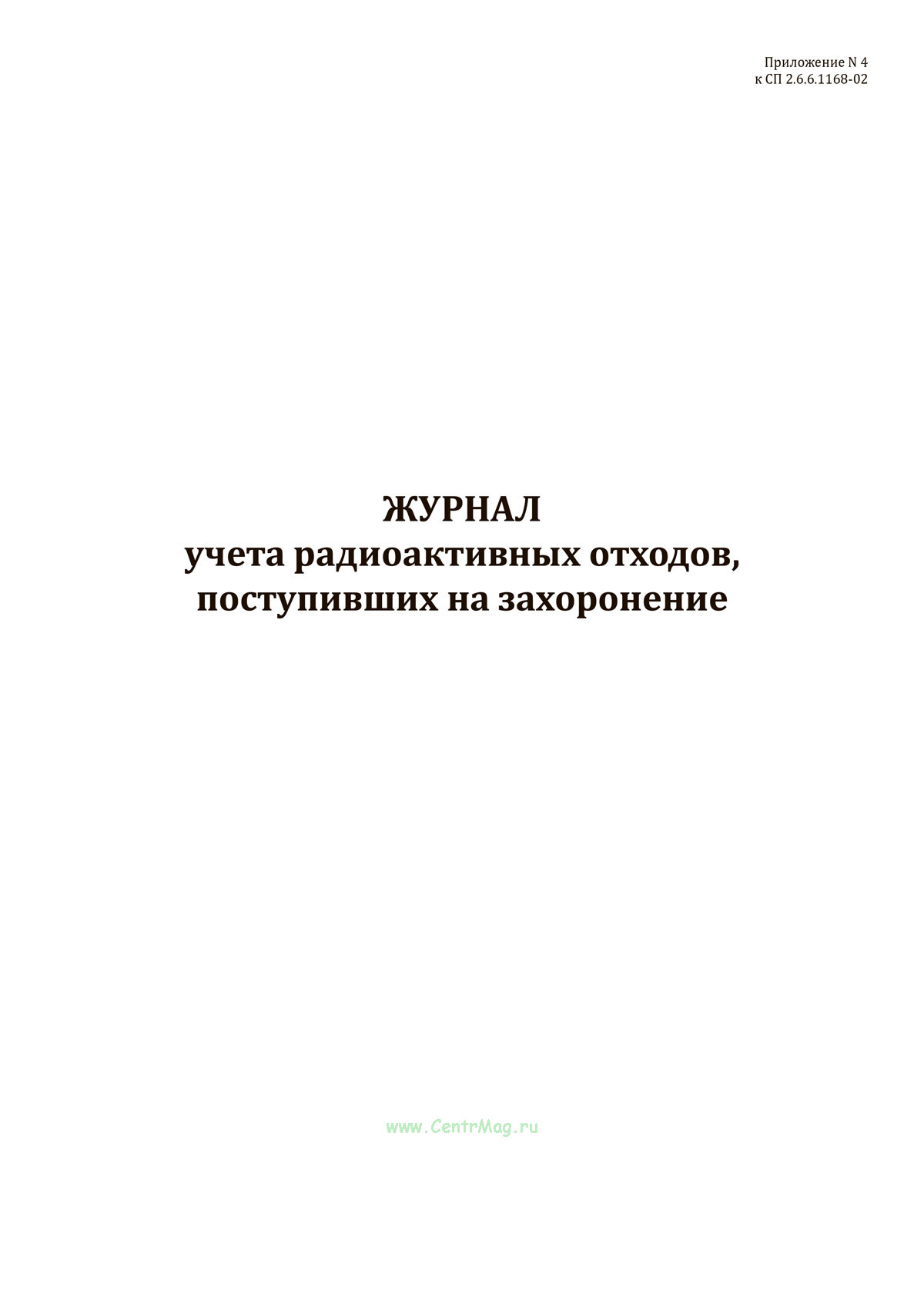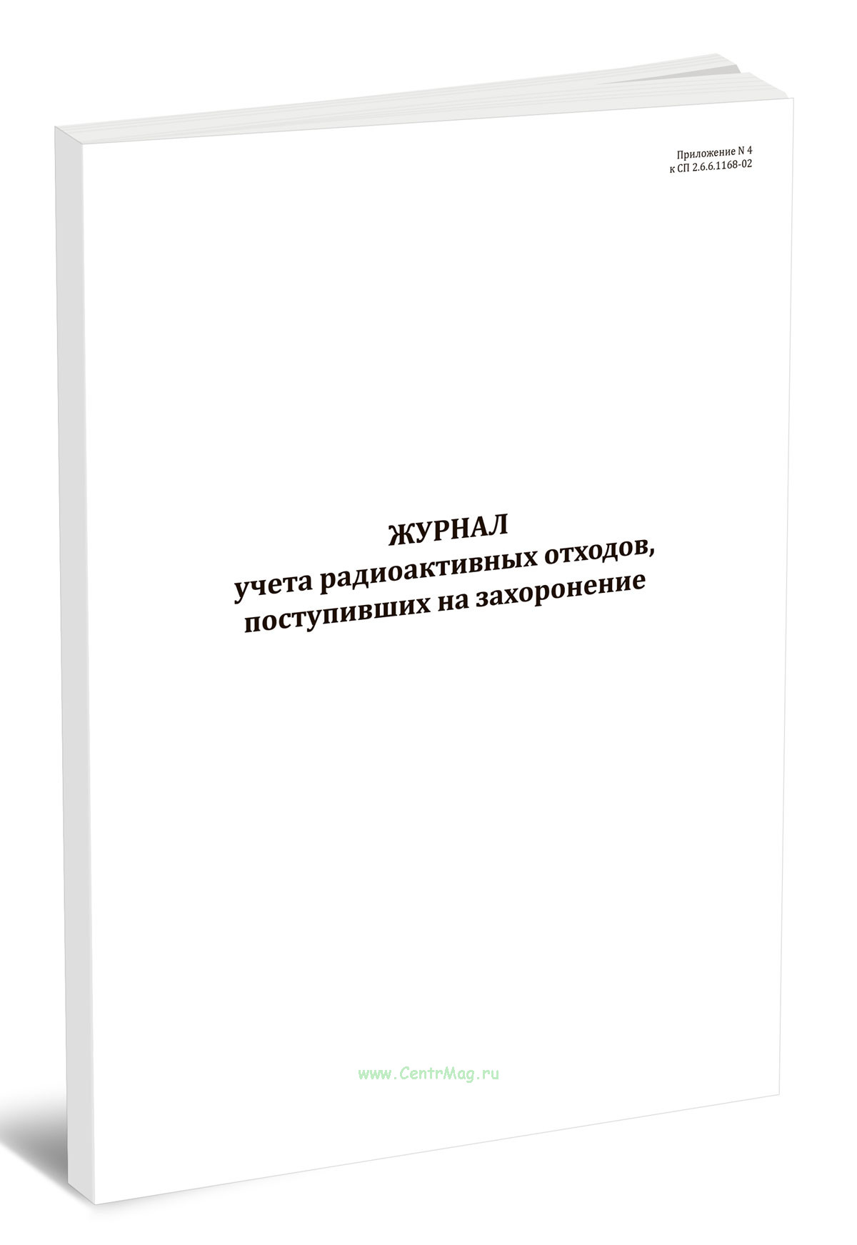Форма журнала учета радиоактивных отходов, поступивших на захоронение соответствует Приложению 4 к СП 2.6.6.1168-02 Санитарные правила обращения с радиоактивными отходами (СПОРО-2002) , которые утратили силу.