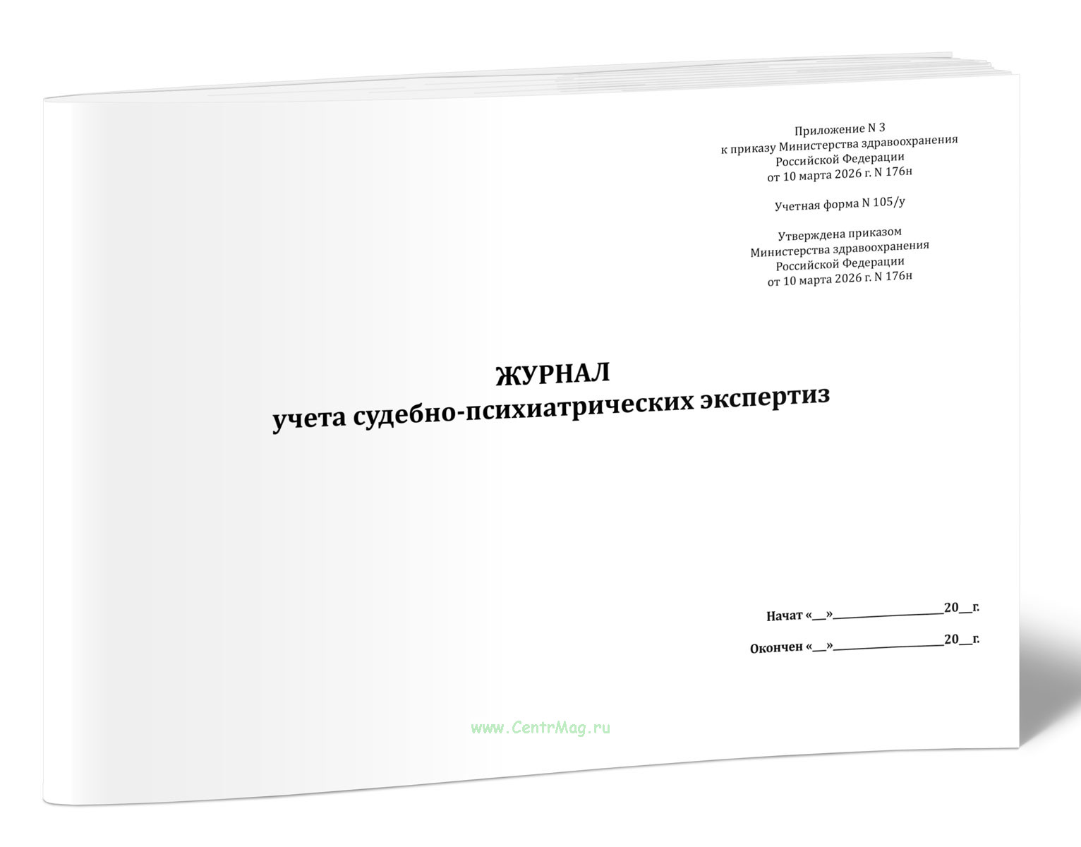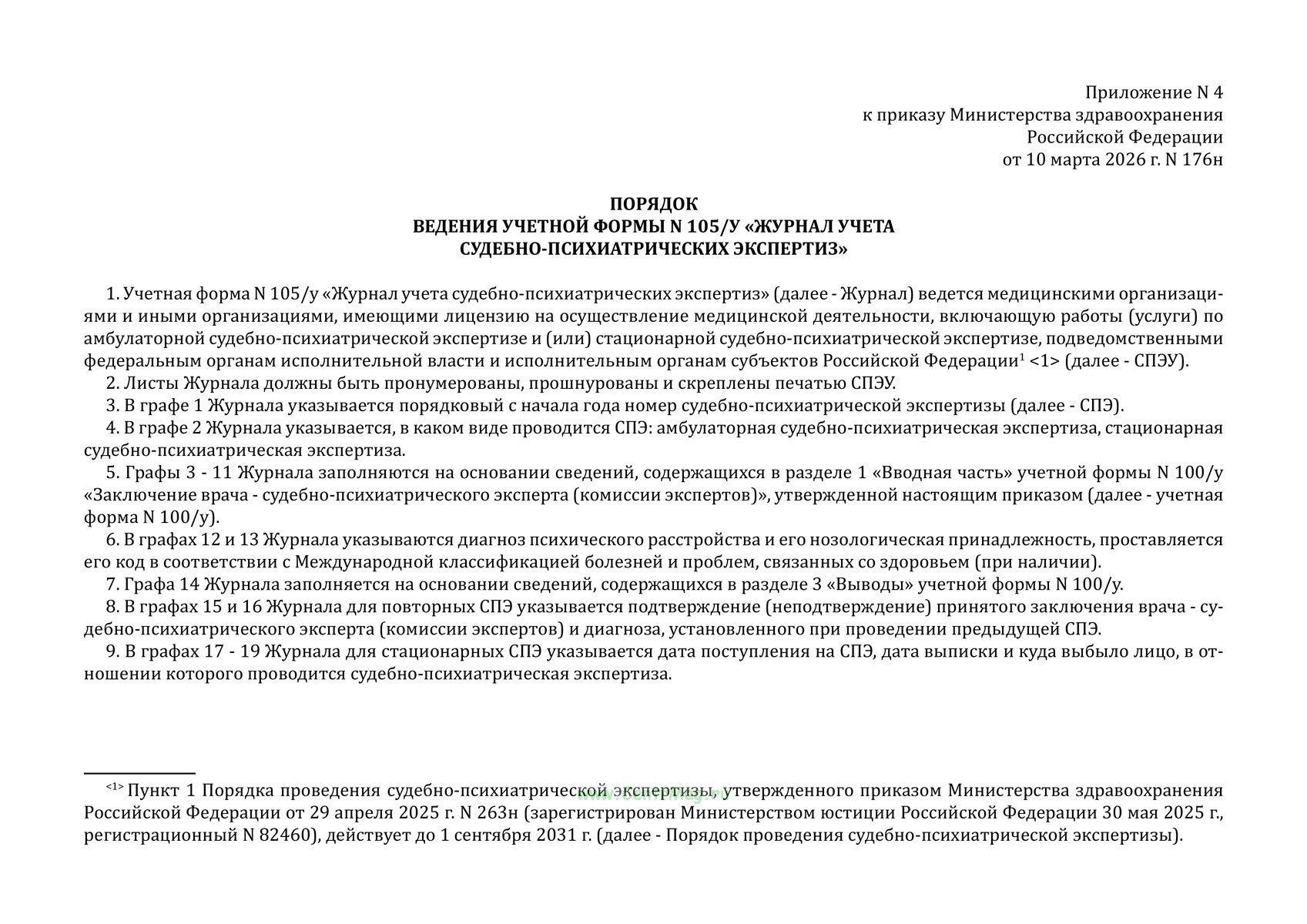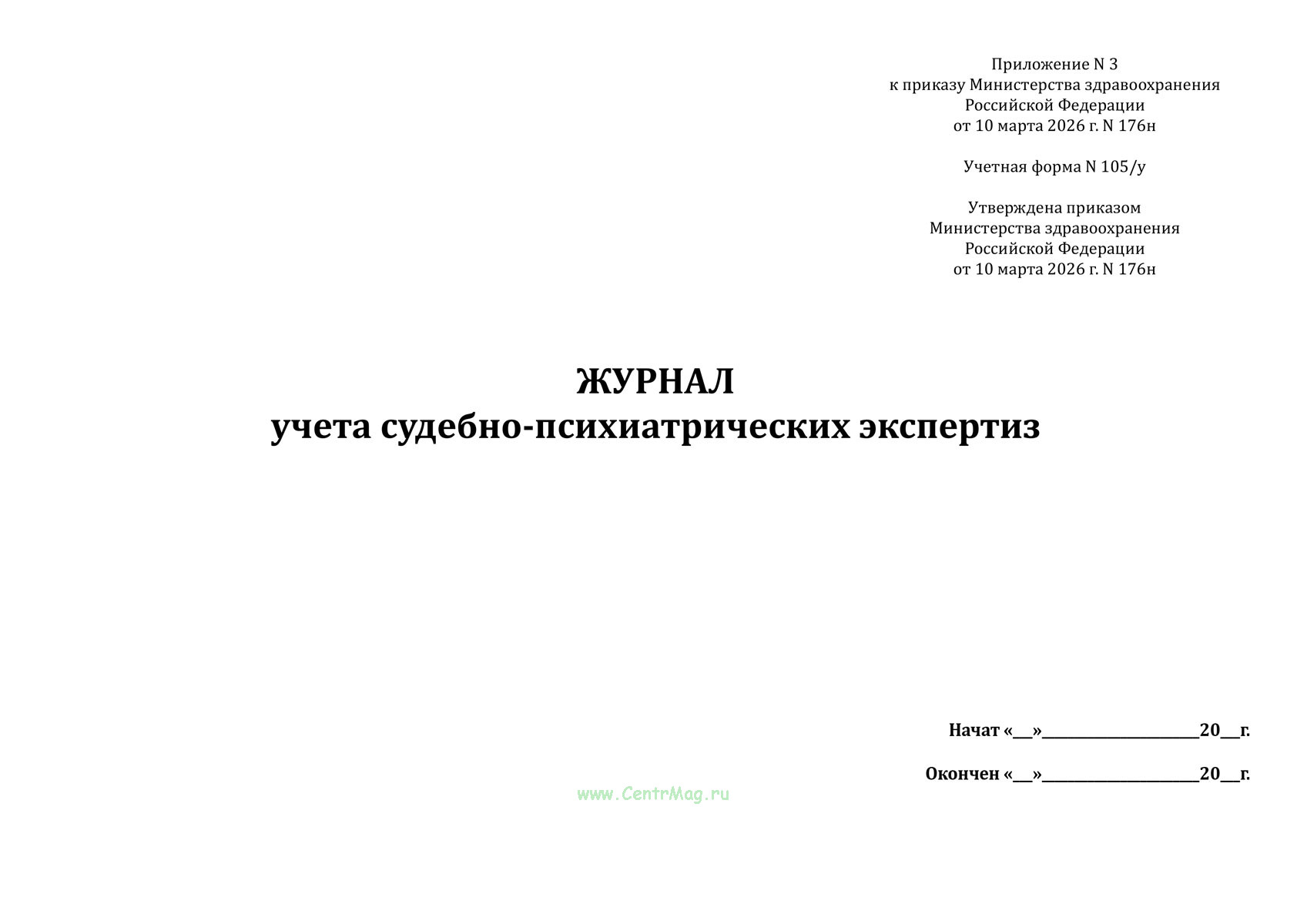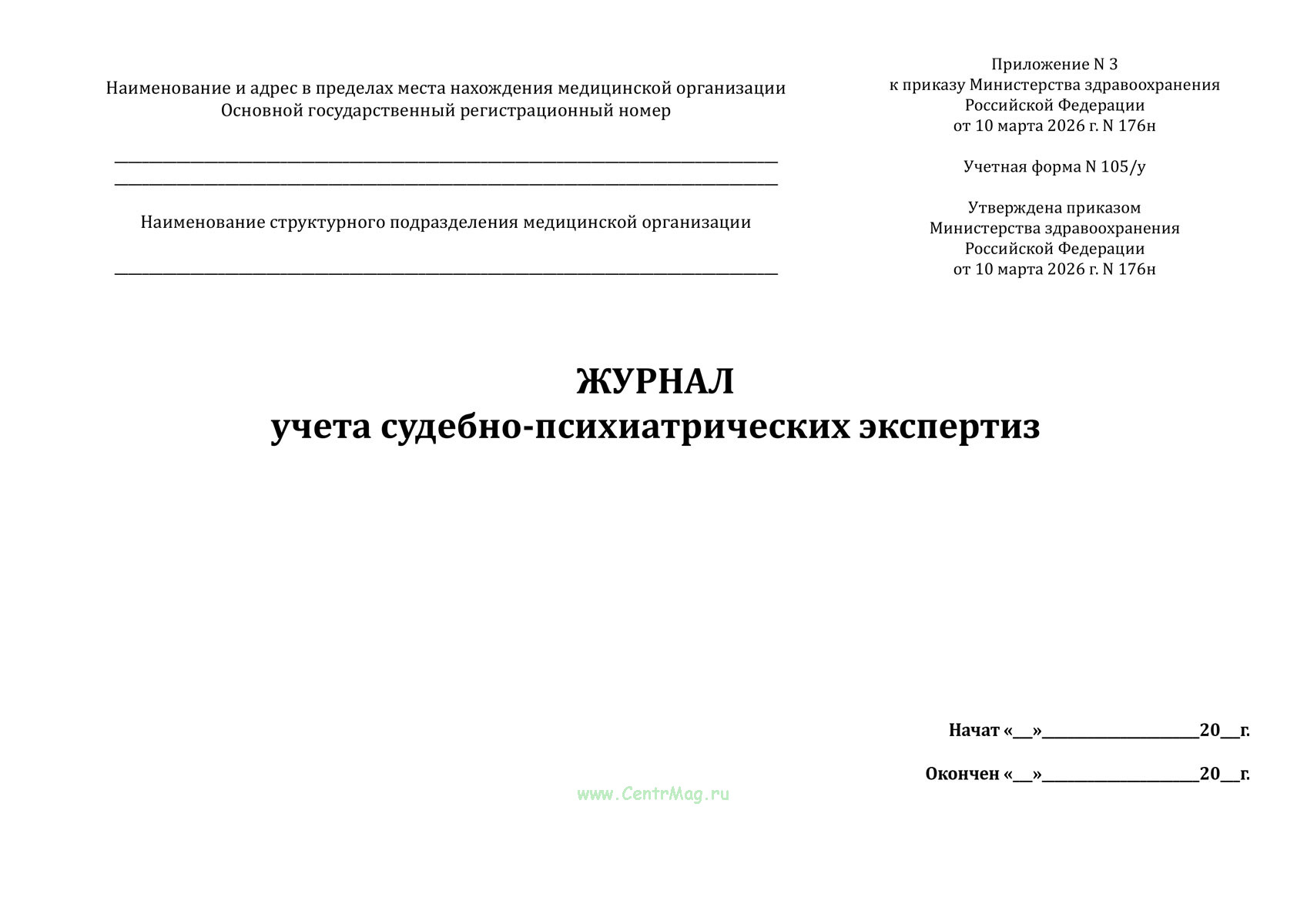 Форма Журнала учета судебно-психиатрических экспертиз (Форма 105/у) соответствует Приложению N 3 к Приказу Минздрава России от 10.03.2026 N 176н