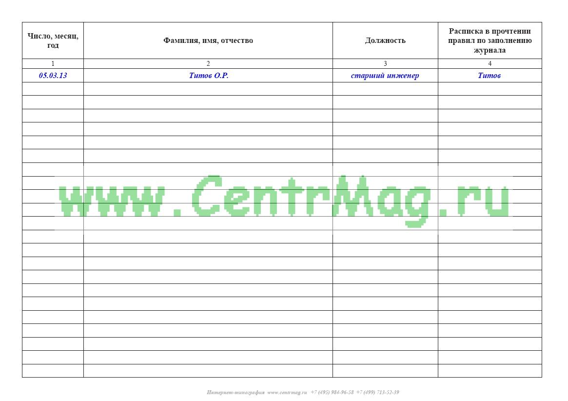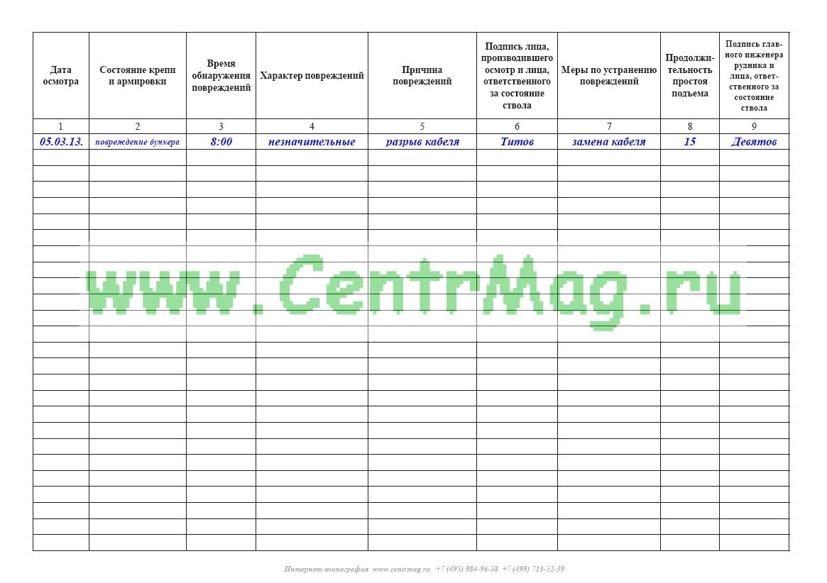 В журнале записываются все замечания, неисправности, повреждения проводников и крепи ствола, а также трубопроводов и нарушения в прокладке кабельных линий, препятствующих нормальной работе подъема. При отсутствии замечаний в графе 2 делается запись «Состояние удовлетворительное». Журнал должен быть прошнурован, пронумерован и скреплен печатью. Лица, заполняющие соответствующие графы, расписываются в прочтении правил заполнения журнала.
