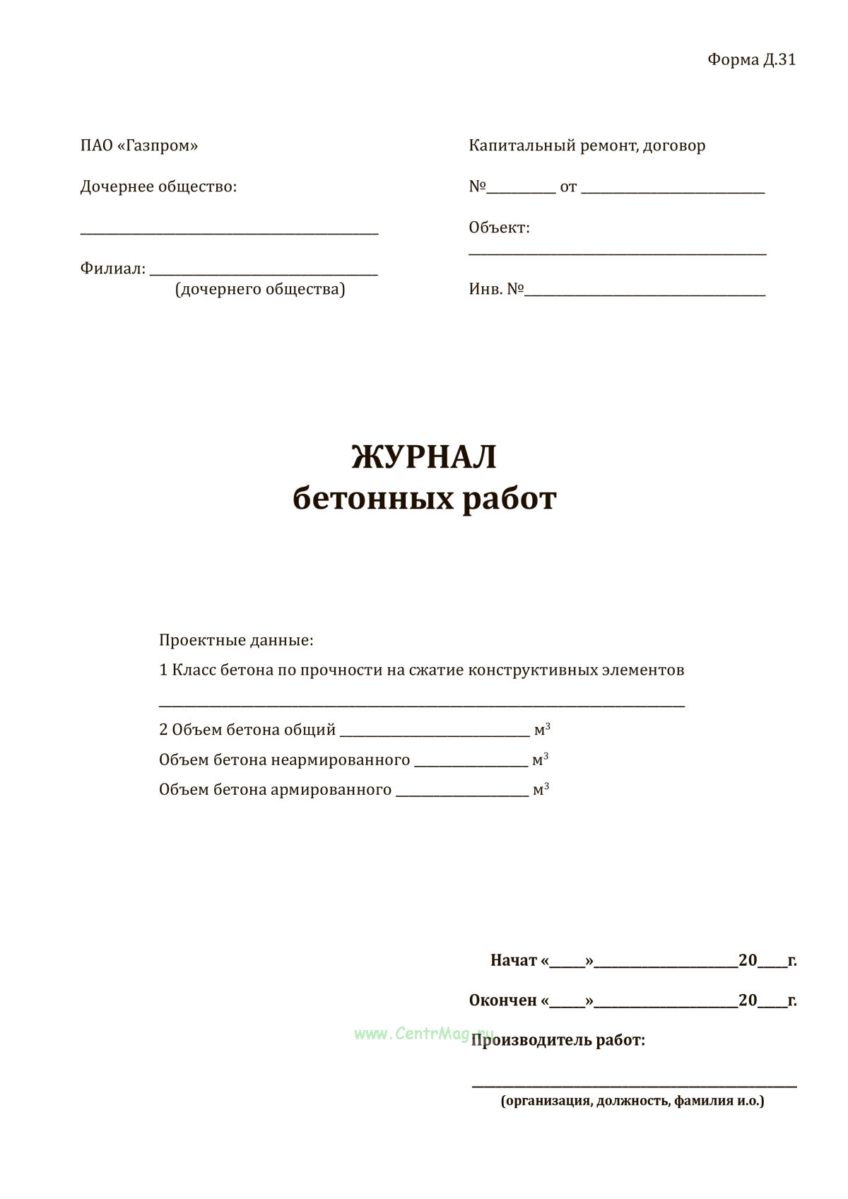 Форма Журнала бетонных работ соответствует Приложению Д. 31 к СТО Газпром 28.5-019-2025 "Исполнительная документация при ремонте"