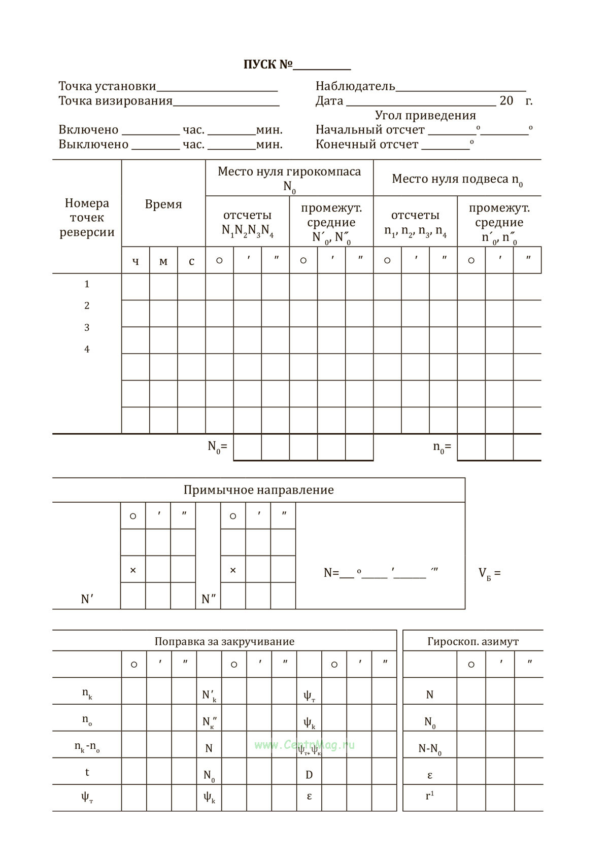 Журнал гироскопического ориентирования имеет графы: