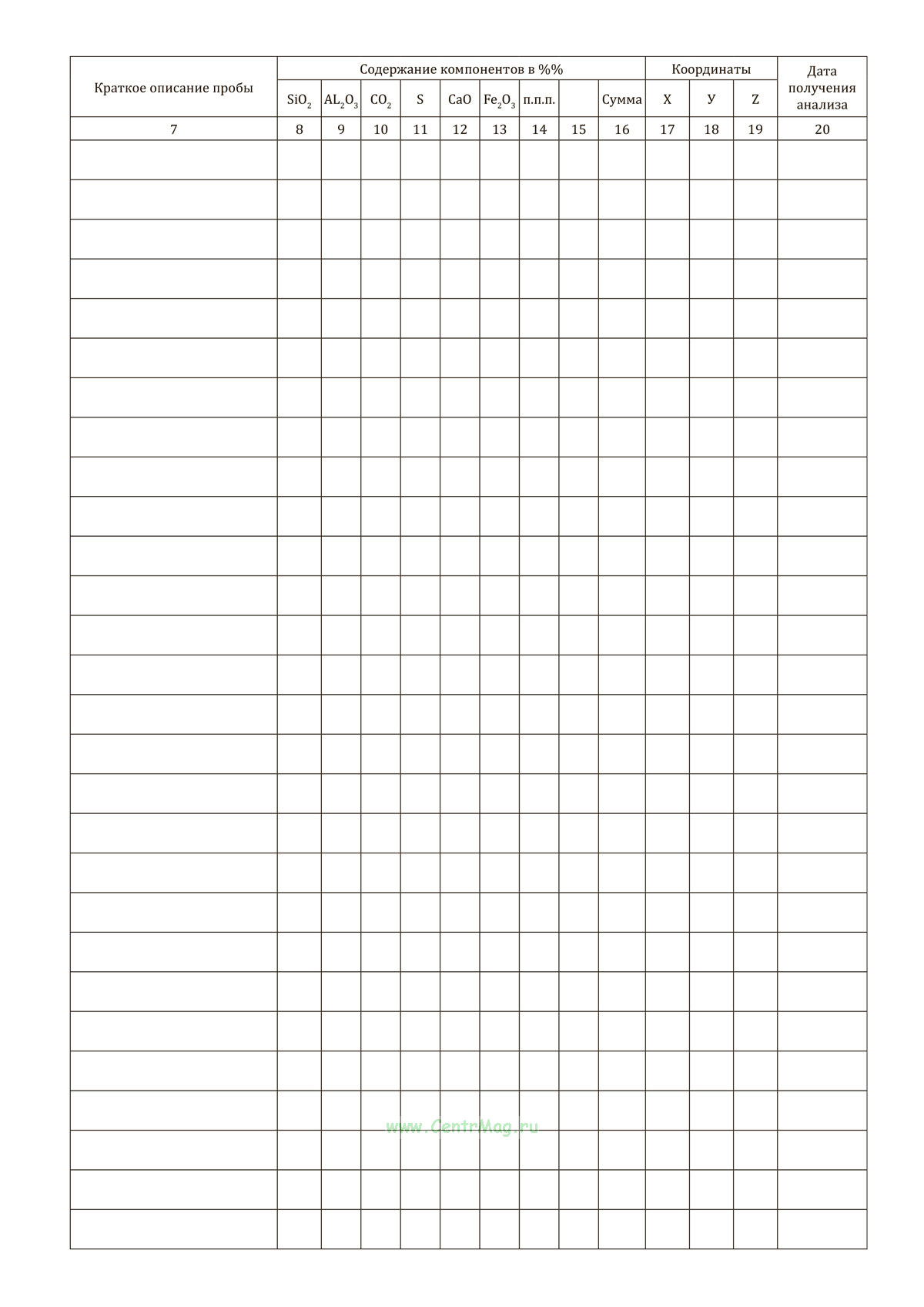 Журнал предназначен для систематической регистрации и контроля результатов химического анализа образцов, что обеспечивает достоверность данных для оценки состава и качества геологического материала.
