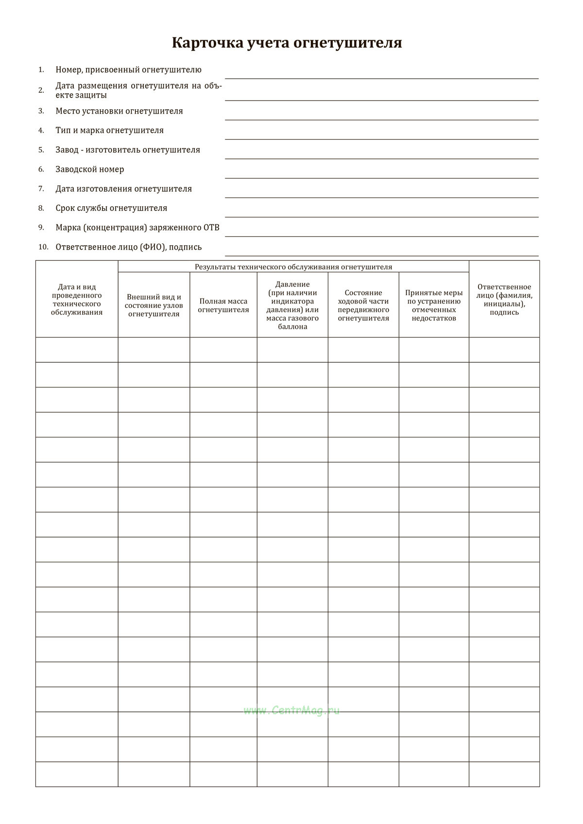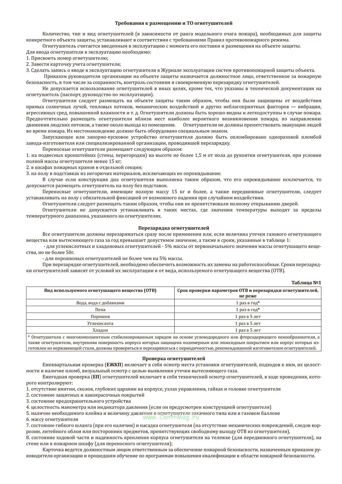 Приказом руководителя организации на объекте защиты назначается должностное лицо, ответственное за пожарную безопасность, в том числе за сохранность, контроль состояния и своевременную перезарядку огнетушителей.
