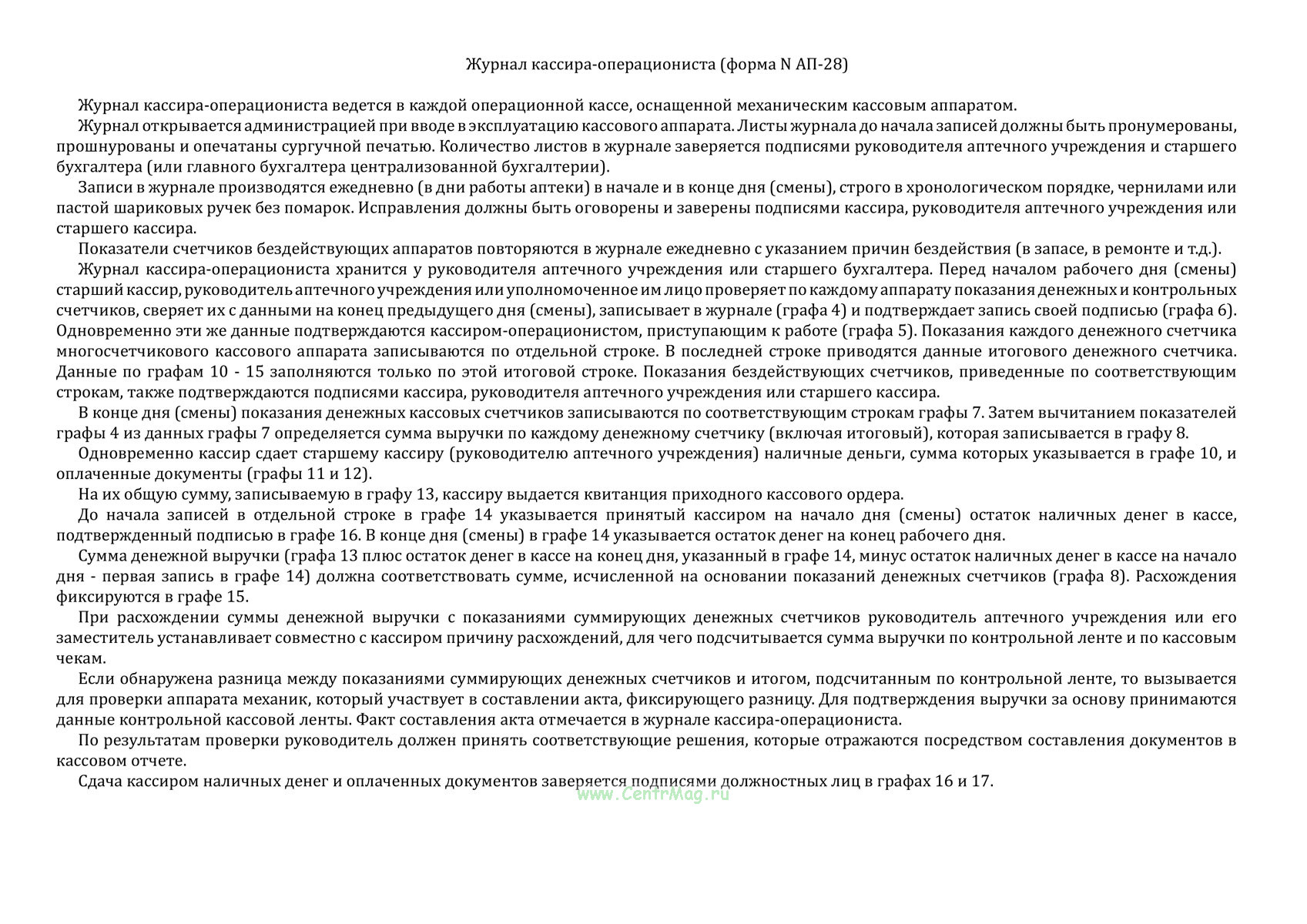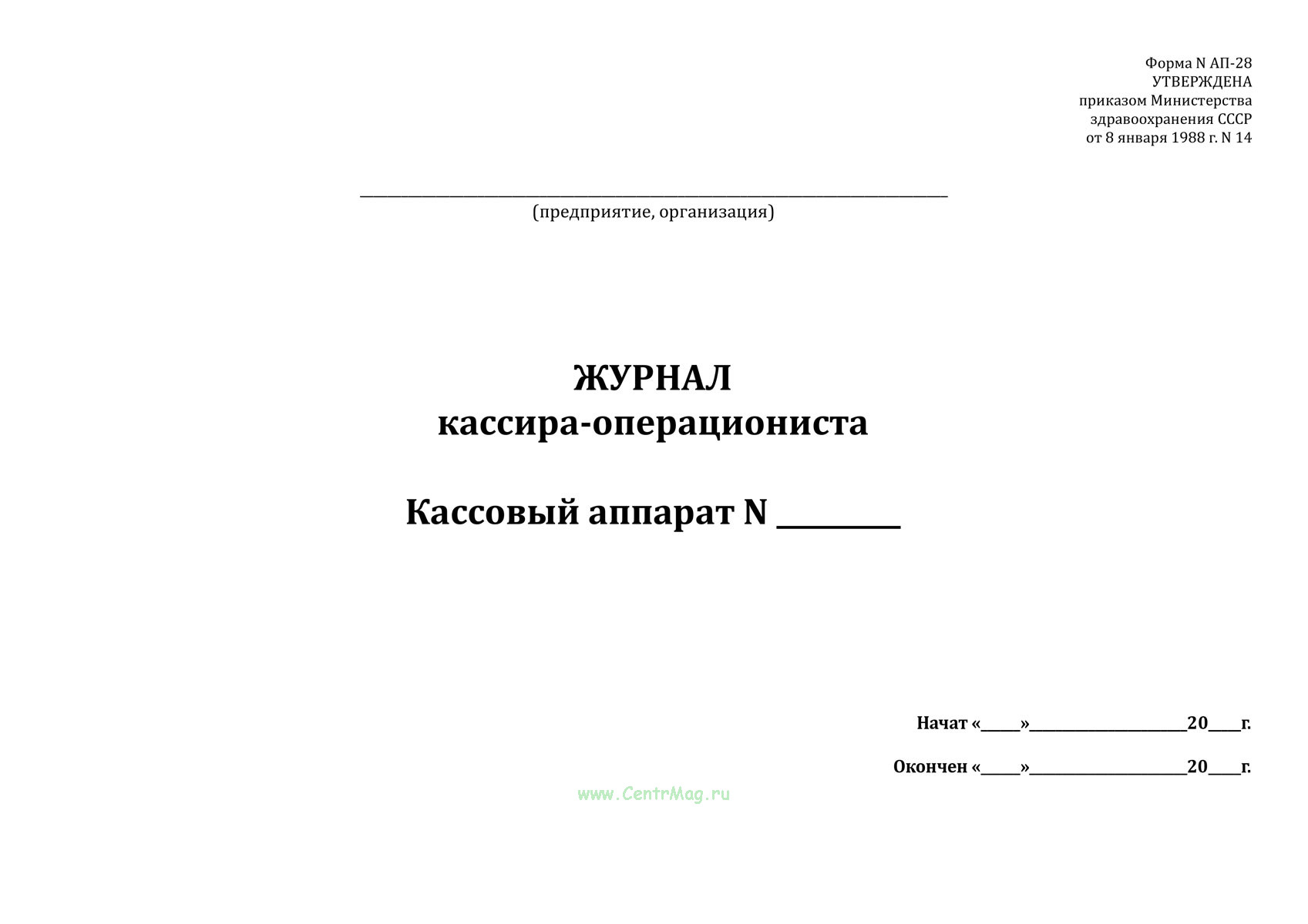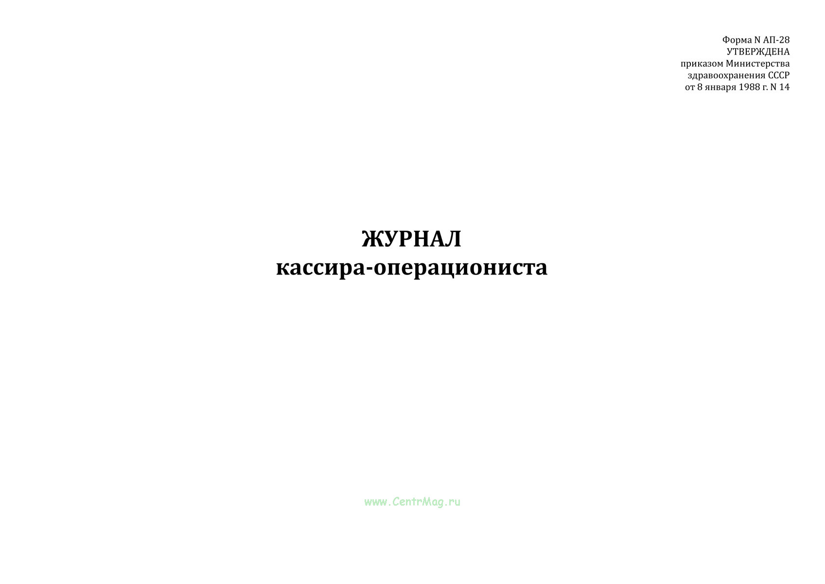 Форма Журнала кассира-операциониста (форма N АП-28) соответствует Приложению к Приказу от 8 января 1988 г. N 14 "Об утверждении специализированных (внутриведомственных) форм первичного бухгалтерского учета для хозрасчетных аптечных учреждений форм первичной учетной документации хозрасчетных аптечных учреждений".