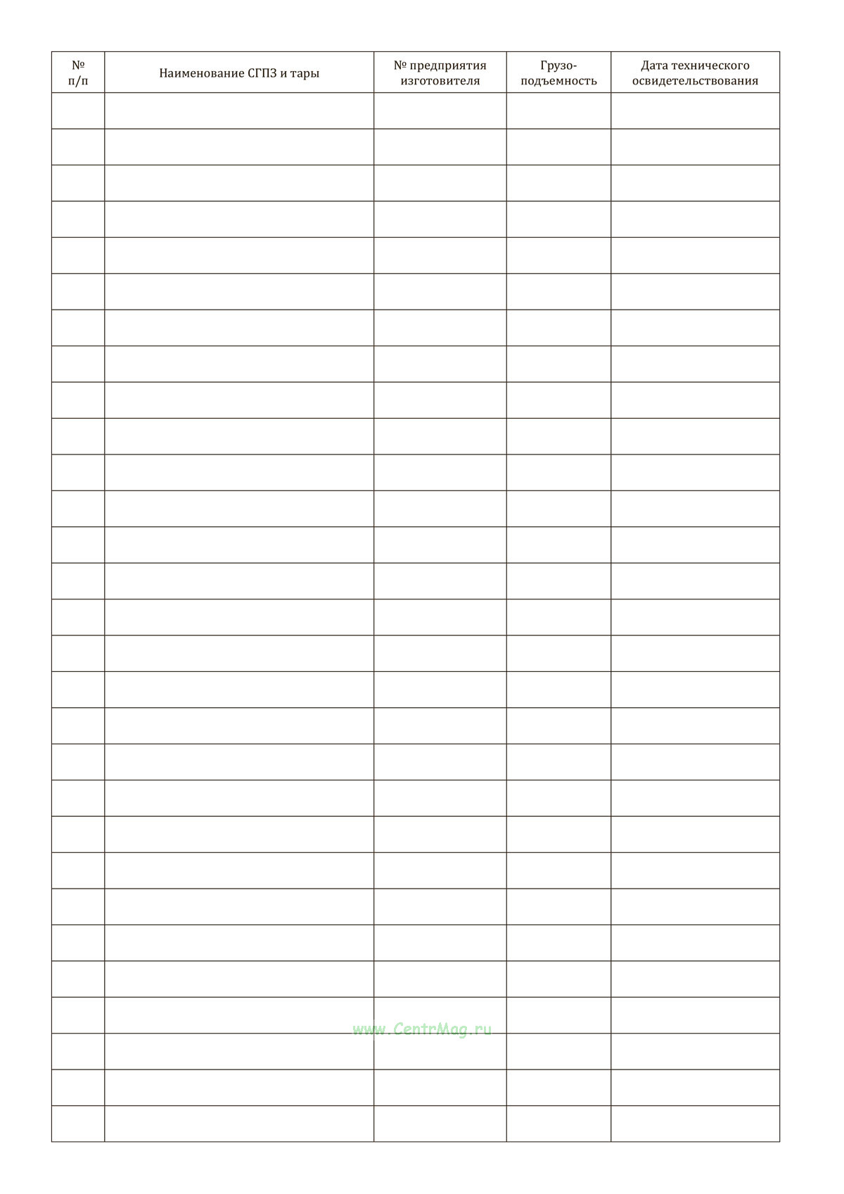 Журнал применяется для документального учёта технического состояния съёмных грузозахватных приспособлений (СГП) и тары, используемых при погрузочно-разгрузочных работах. Обеспечивает регулярную фиксацию осмотров, контроль пригодности к эксплуатации и соблюдение требований охраны труда и промышленной безопасности на предприятии.