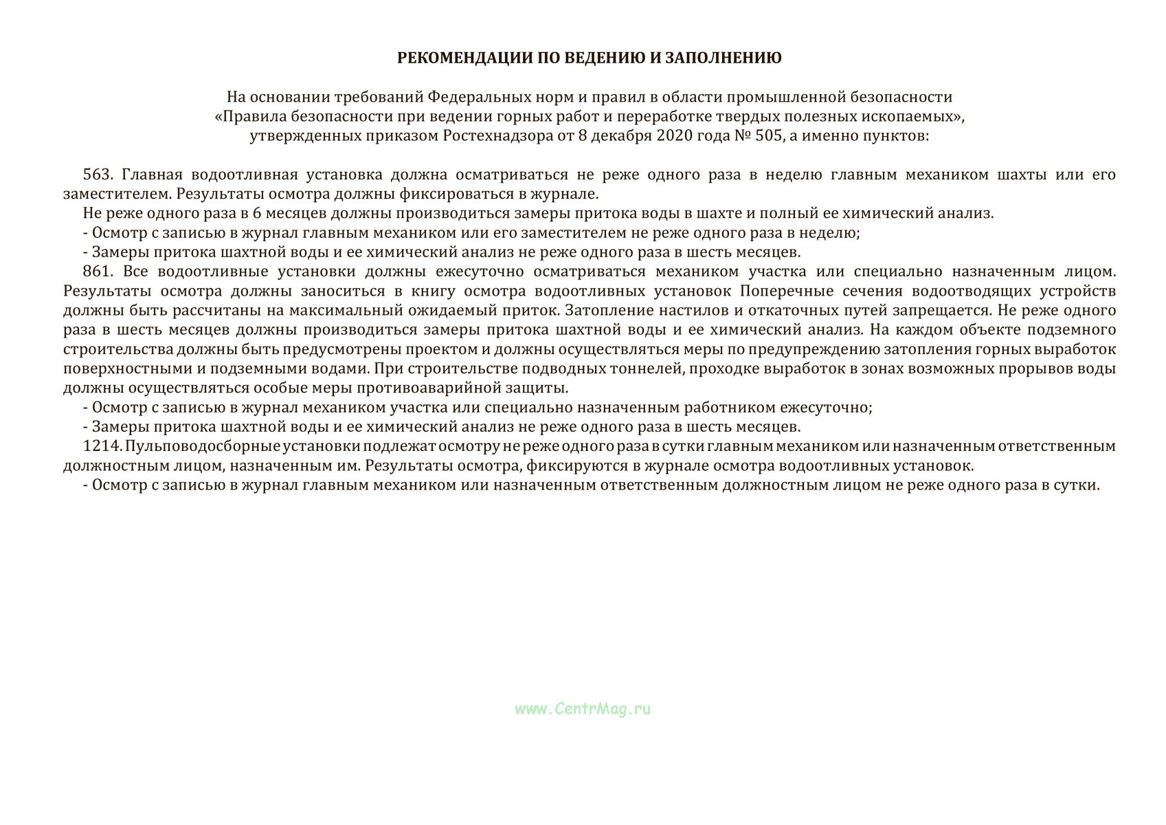 В журнале осмотра водоотливных установок записываются результаты осмотра водоотливных установок в соответствии с Едиными правилами безопасности при разработке рудных, нерудных и россыпных месторождений полезных ископаемых подземным способом, а также в соответствии с Приложением 11 "Правил безопасности при строительстве подземных сооружений". Согласно Федеральных норм и правил в области промышленной безопасности "Правила безопасности при ведении горных работ и переработке твердых полезных ископаемых" п. 772.