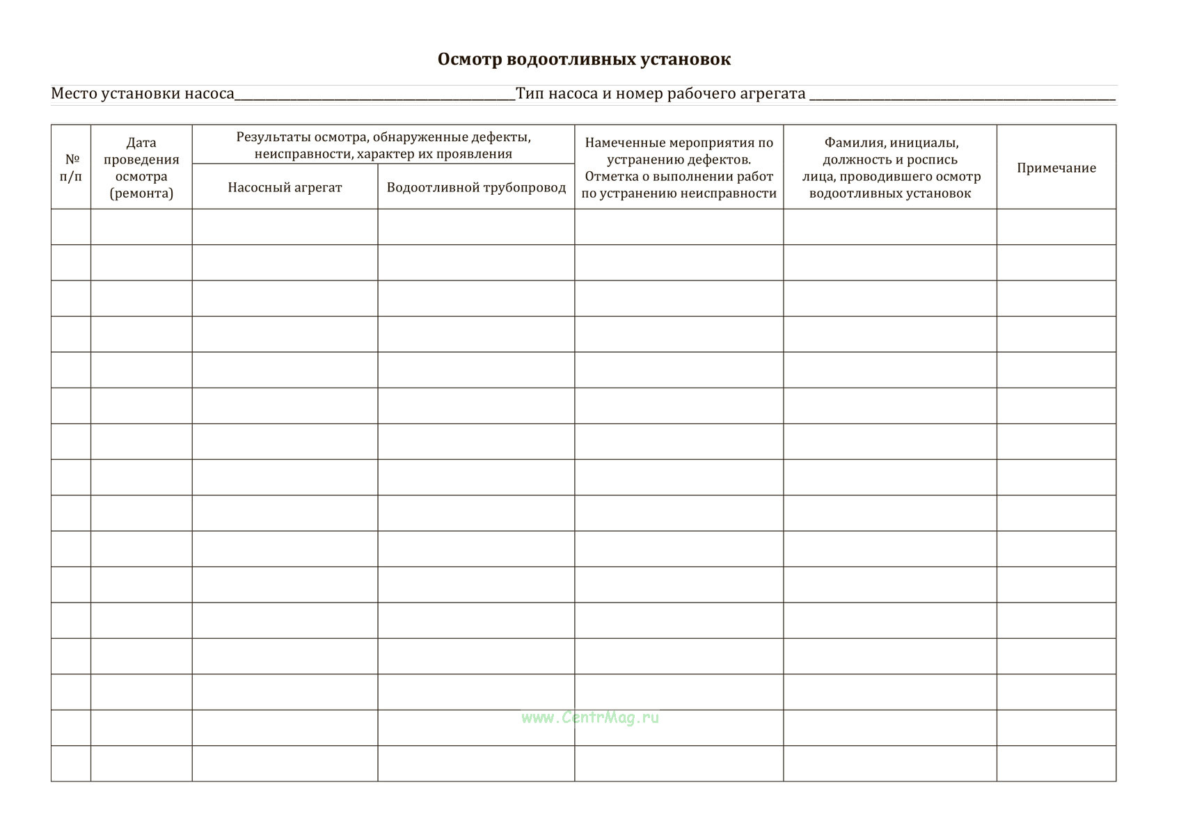- Фамилия, инициалы, должность и роспись лица, проводившего осмотр водоотливных установок