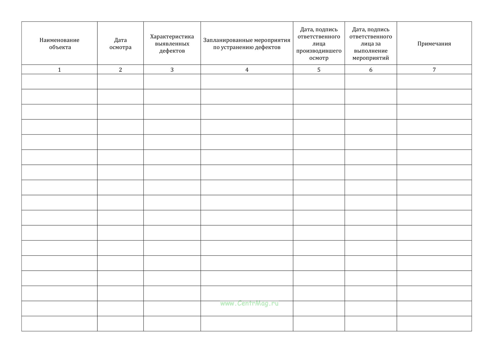 Журнал используется для учета результатов осмотра зданий и сооружений, фиксации выявленных дефектов, планирования мероприятий по их устранению и документального контроля выполнения работ по обеспечению безопасной эксплуатации объектов.