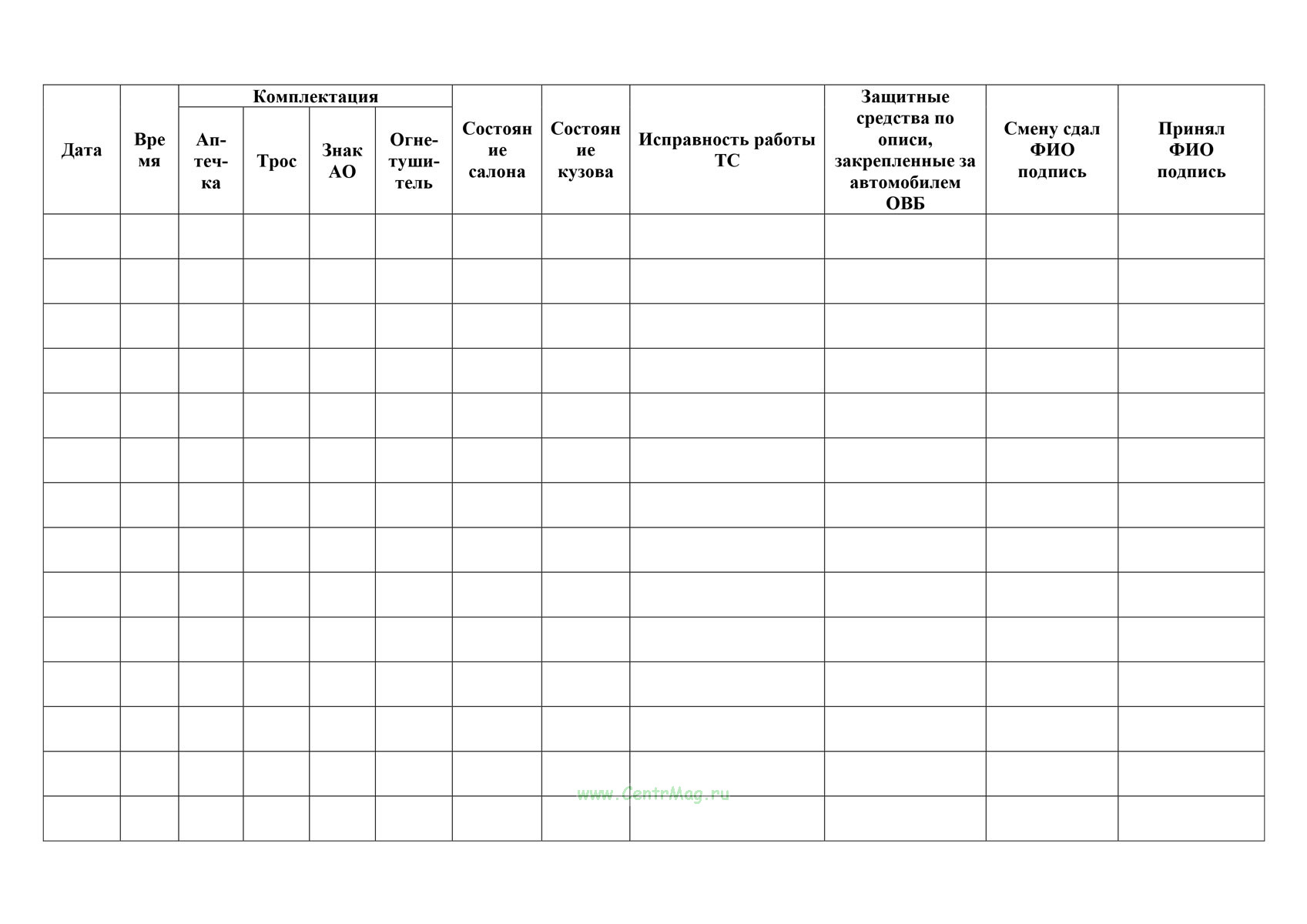 Журнал применяется для фиксации передачи автомобиля между сменами, контроля его технического состояния, комплектности и наличия защитных средств, а также для обеспечения ответственности водителей и непрерывной безопасной эксплуатации транспортного средства.