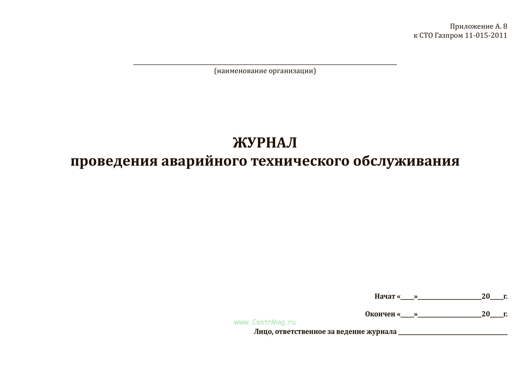 Форма журнала проведения аварийного технического обслуживания соответствует Приложению А.8 к распоряжению ОАО "Газпром" от 29 марта 2011 г. № 167