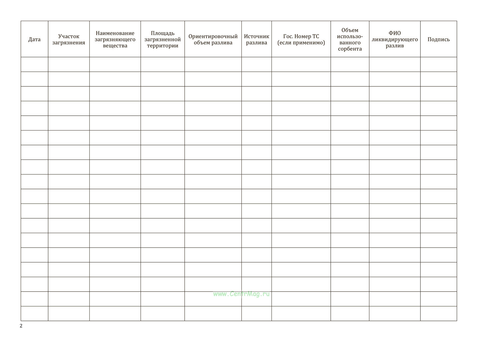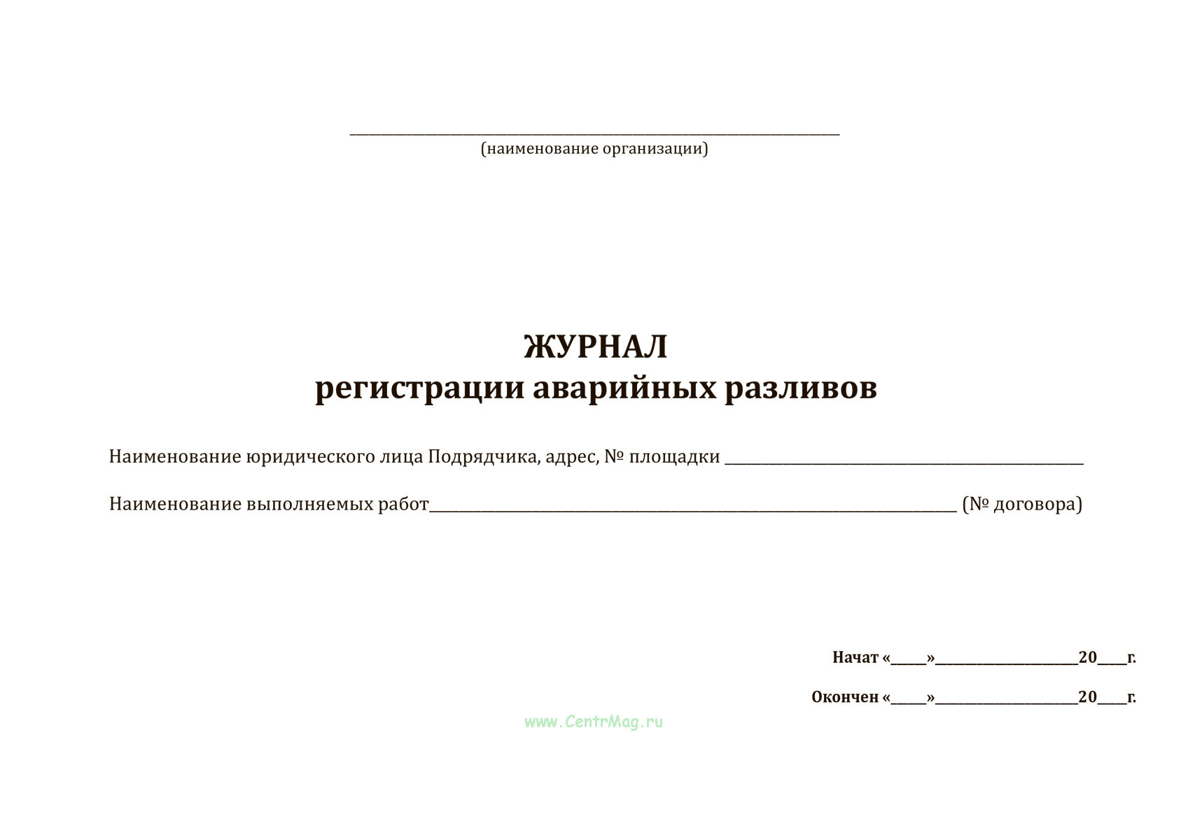 Журнал регистрации аварийных разливов применяется для фиксации фактов утечек или разливов загрязняющих веществ на объектах производства или строительства. Он предназначен для оперативного учета инцидентов, связанных с загрязнением территории, с указанием даты, места, источника разлива, типа загрязняющего вещества, объема загрязнения и мер по ликвидации. Также вносятся данные об использованных сорбентах и лице, ликвидировавшем разлив.