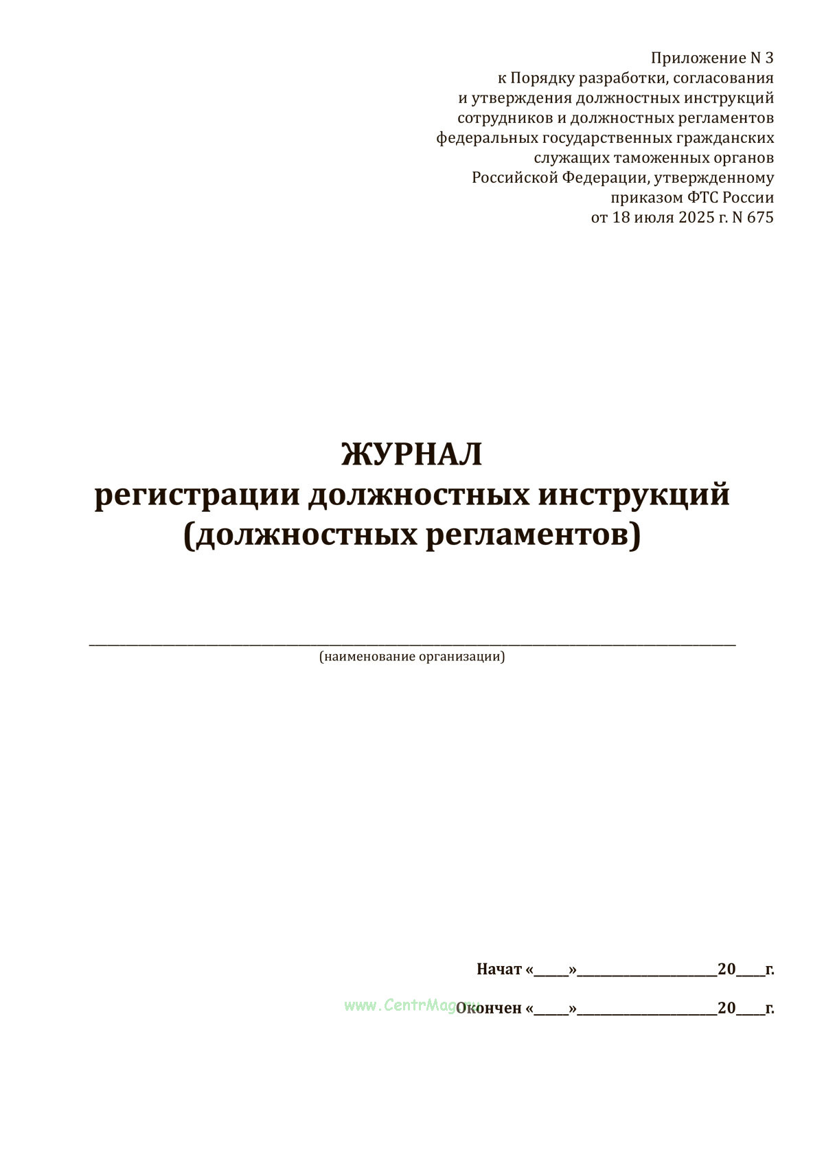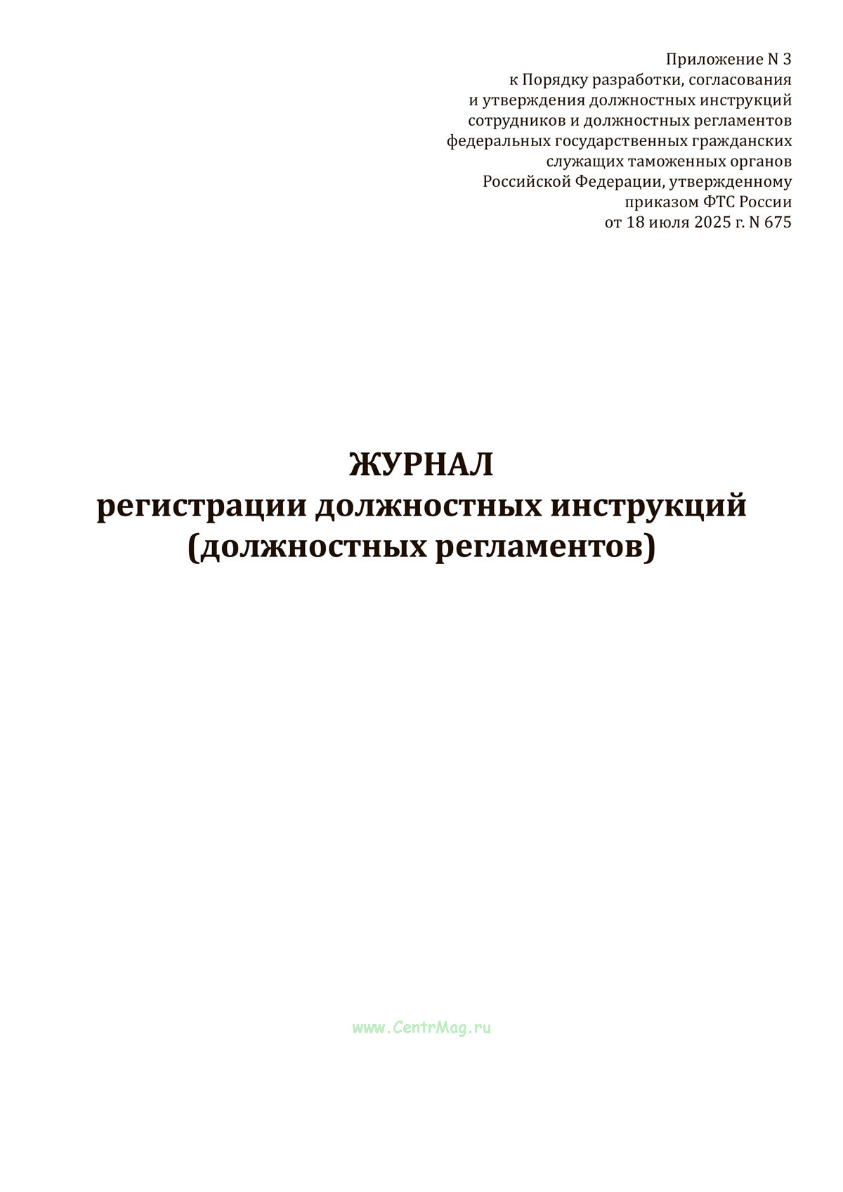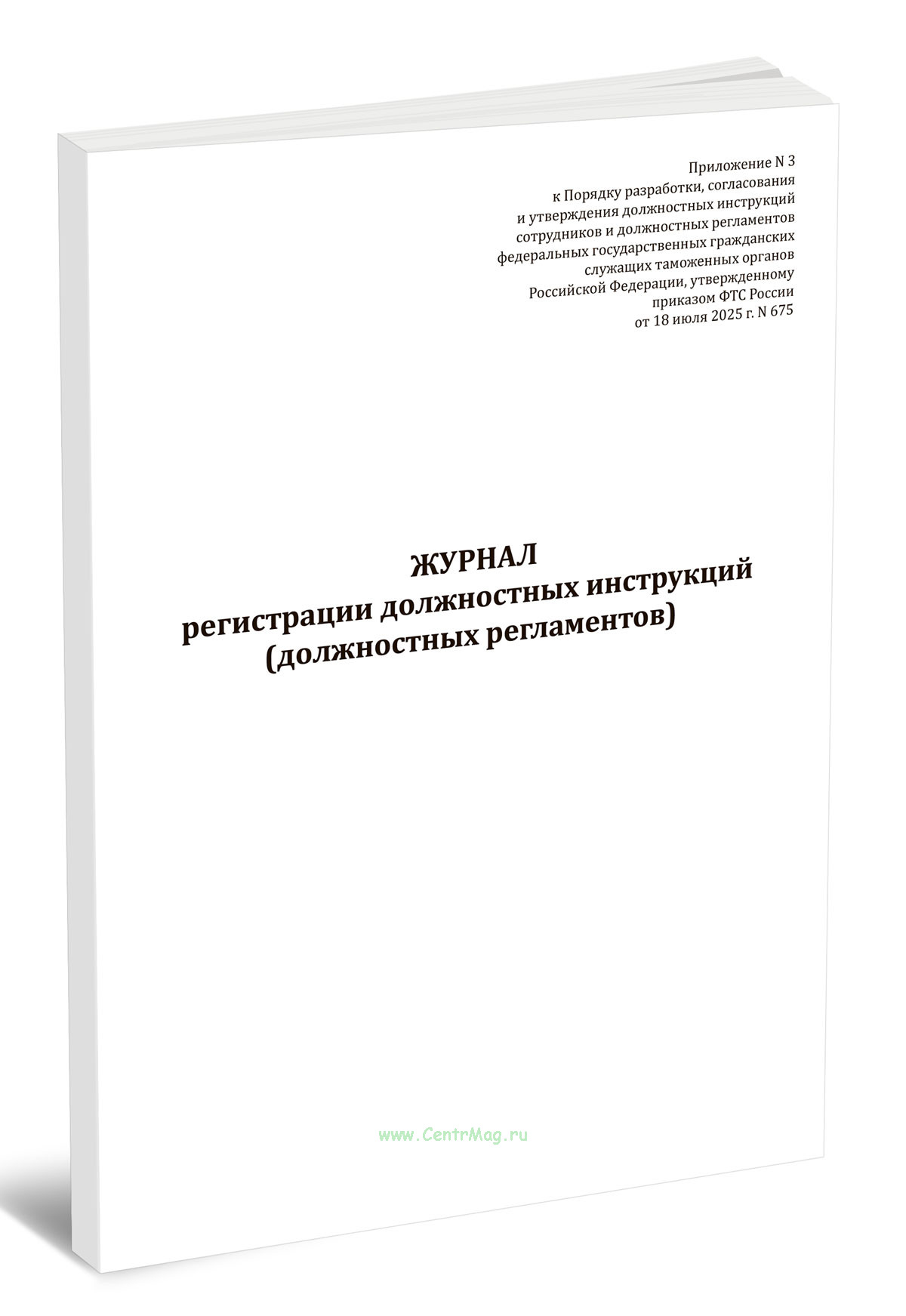 Форма Журнала регистрации должностных инструкций (должностных регламентов) соответствует Приложению N 3 к Приказу ФТС России от 18.07.2025 N 675