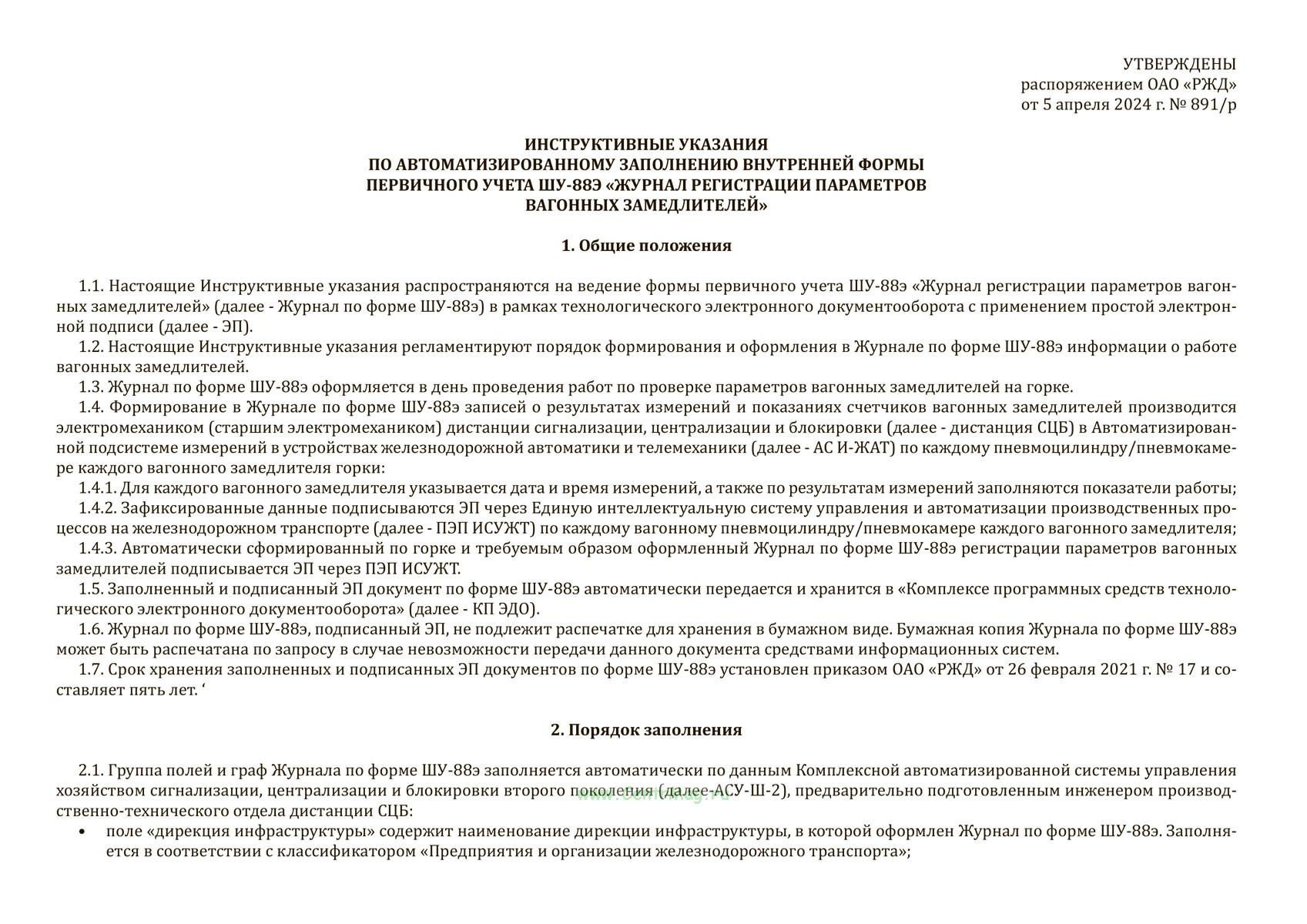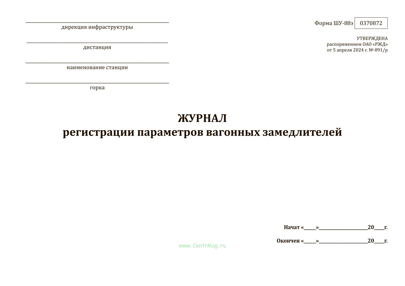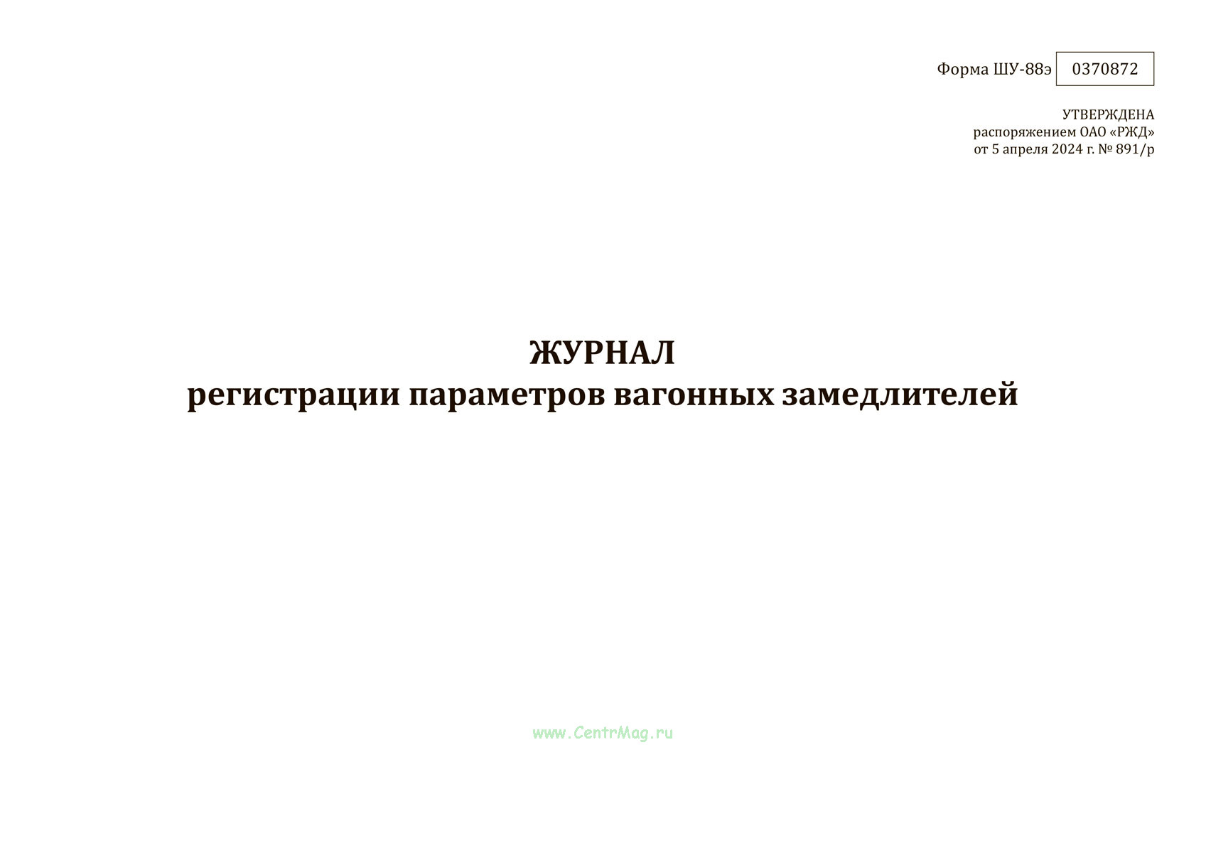 Форма журнала регистрации параметров вагонных замедлителей (ШУ-88э) утверждена распоряжением ОАО "РЖД" от 5 апреля 2024 г. № 891/р "Об утверждении форм внутреннего первичного учета ОАО "РЖД" в хозяйстве автоматики и телемеханики"