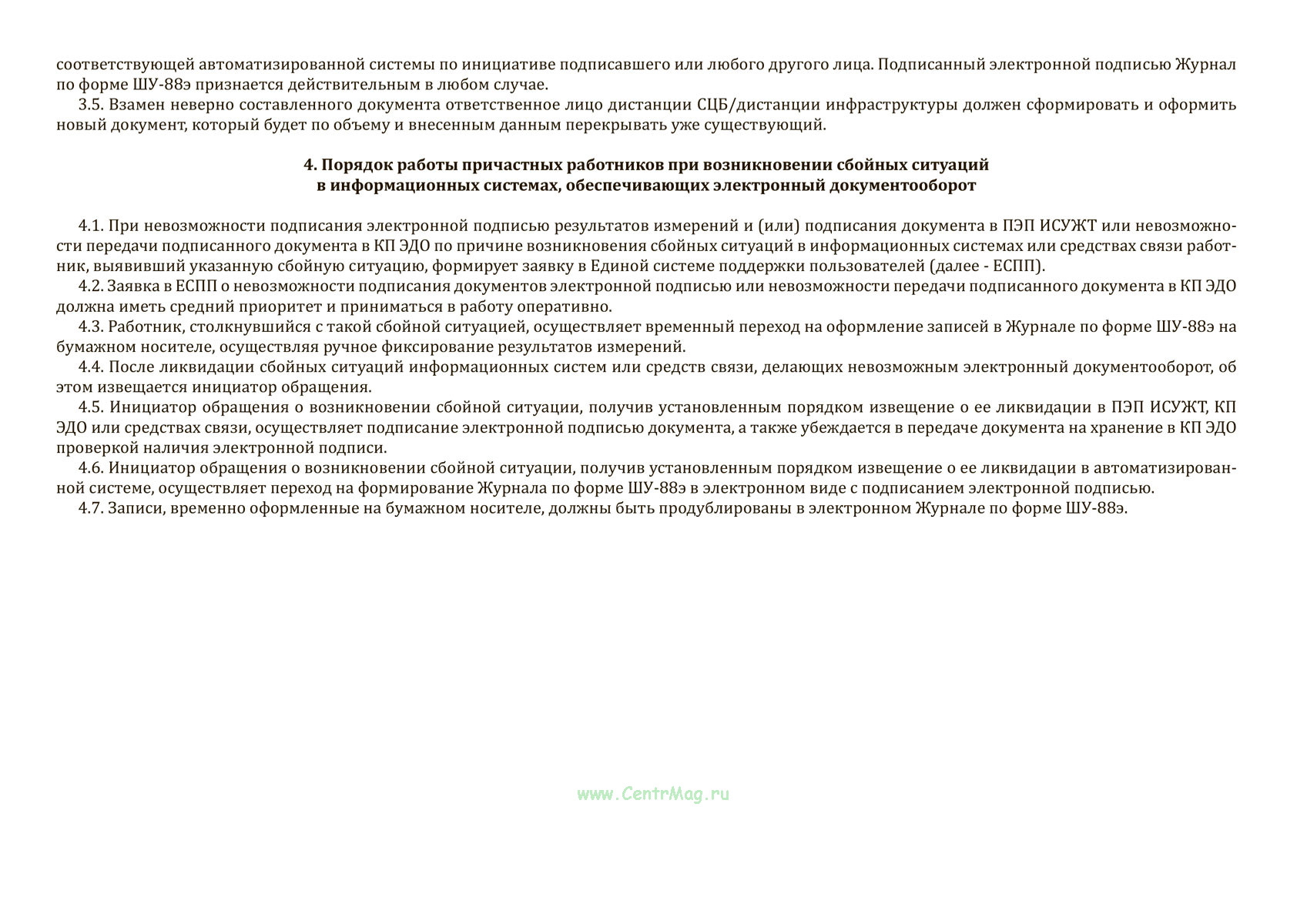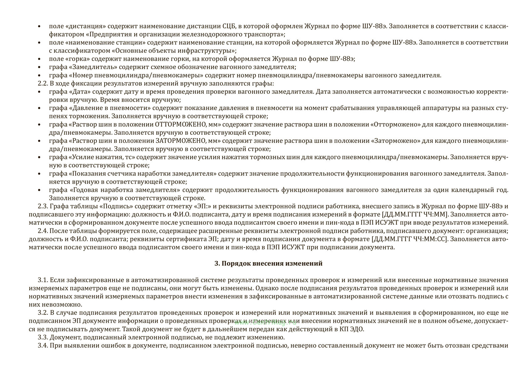 Журнал по форме ШУ-88э предназначен для регистрации параметров вагонных замедлителей в процессе технического обслуживания на железнодорожном транспорте. Документ формируется в электронном виде с использованием электронной подписи, автоматически передается и хранится в системе электронного документооборота. Внесенные данные о результатах измерений и показаниях счетчиков фиксируются специалистами в АС И-ЖАТ, подтверждаются подписью через ПЭП ИСУЖТ и автоматически сохраняются в системе. Распечатка бумажной копии допускается только по необходимости при невозможности передачи данных электронными средствами.