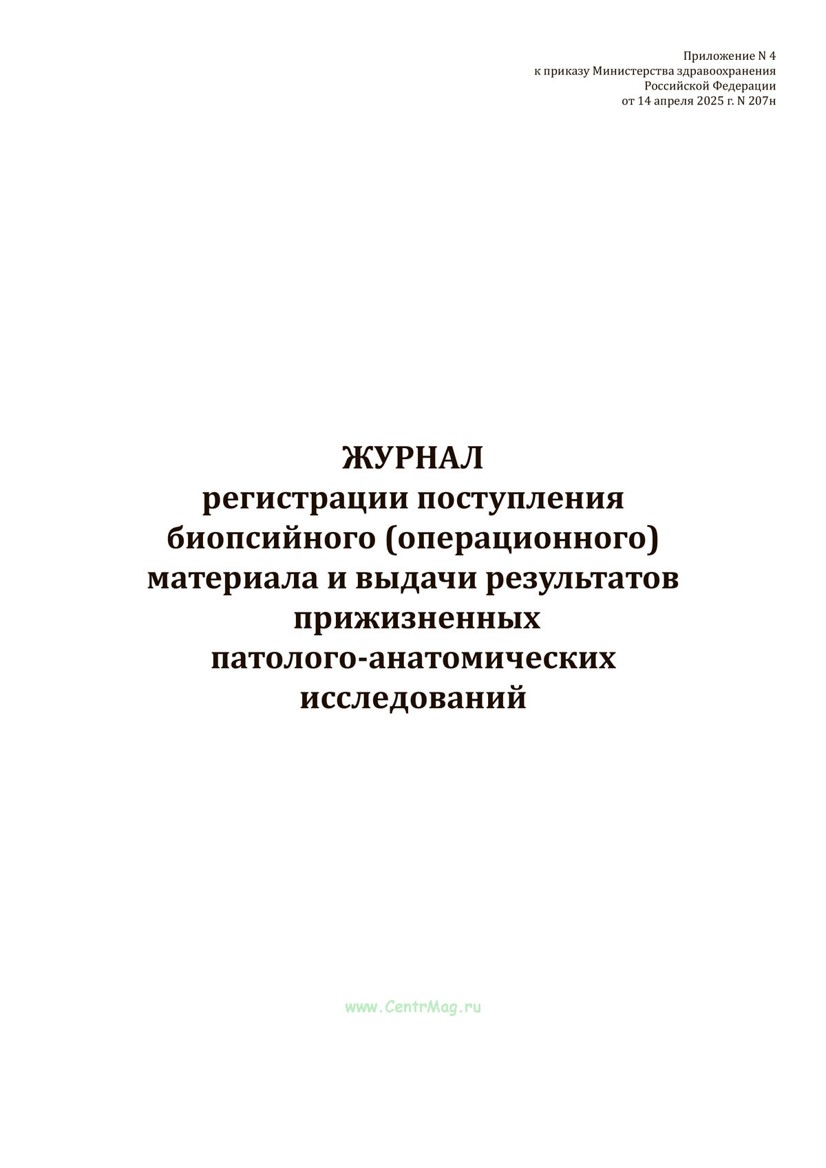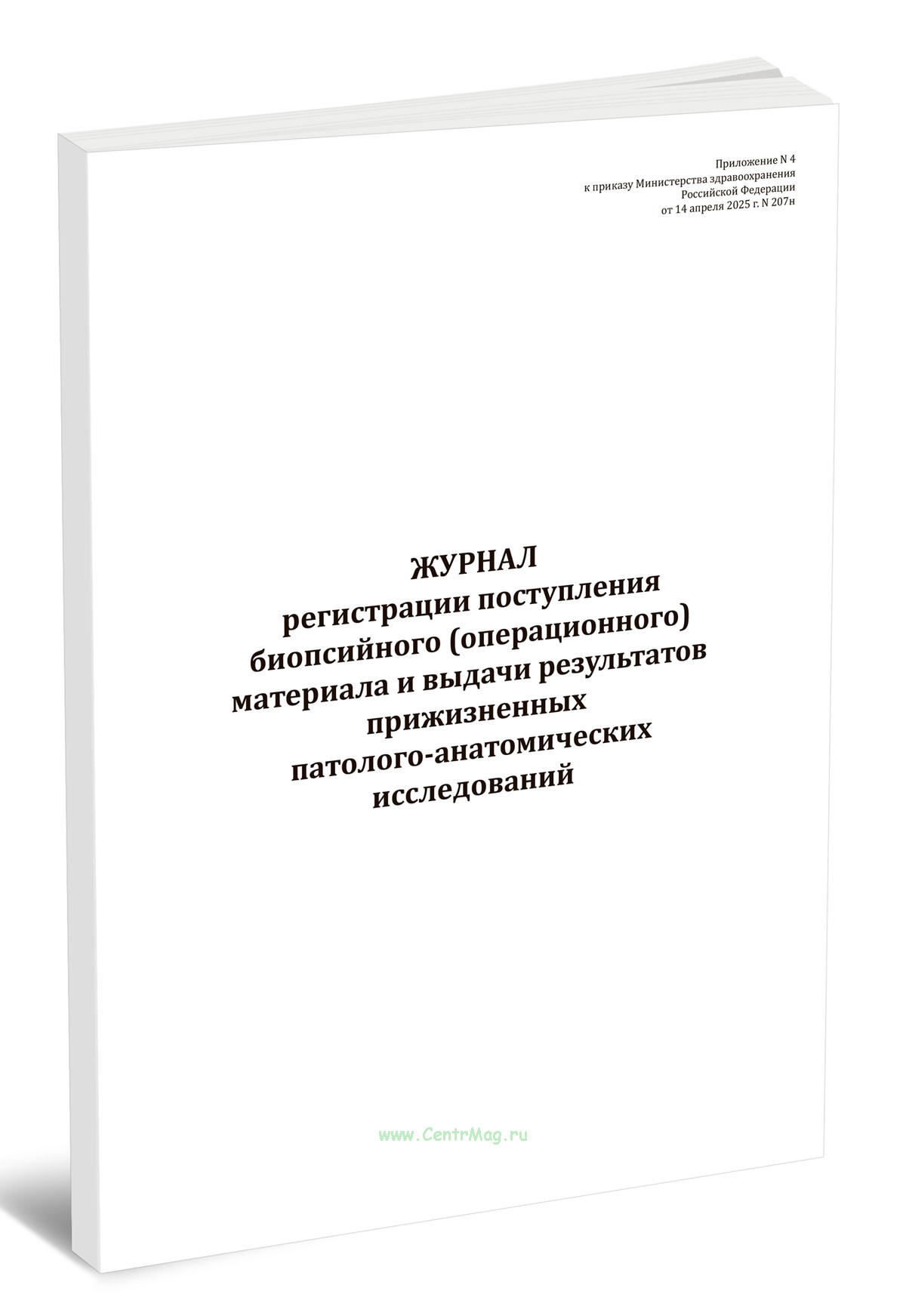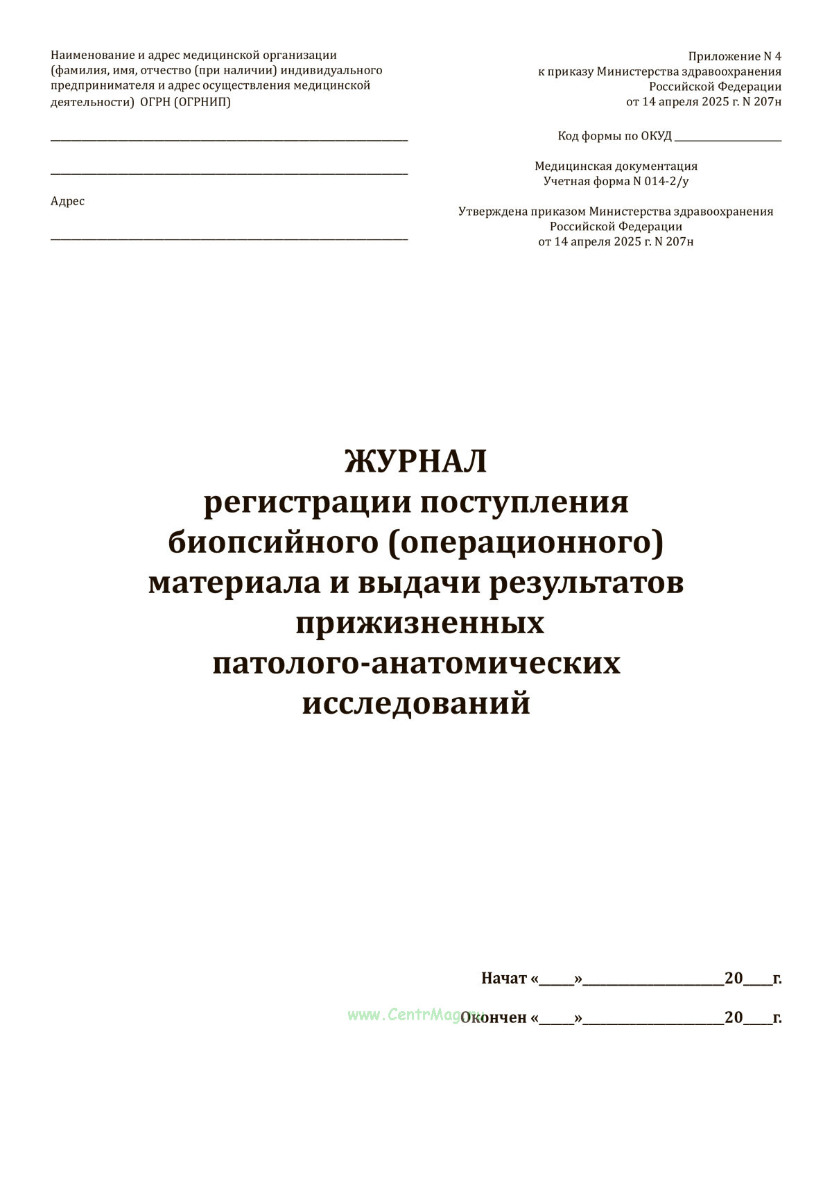 Форма Журнала регистрации поступления биопсийного (операционного) материала и выдачи результатов прижизненных патолого-анатомических исследований (N 014-2/у) соответствует Приложению N 4 к Приказу Минздрава России от 14.04.2025 N 207н "Об утверждении Правил проведения патолого-анатомических исследований и унифицированных форм медицинской документации, используемых при проведении прижизненных патолого-анатомических исследований"