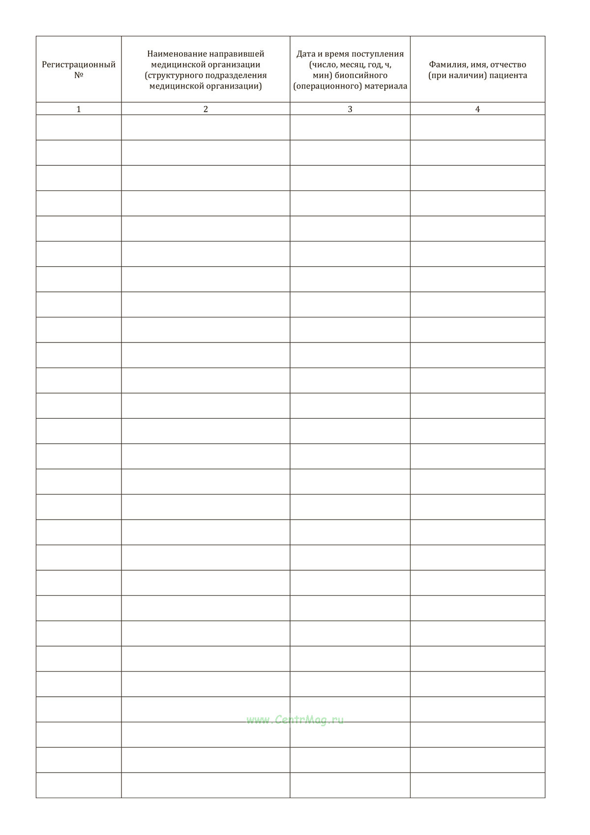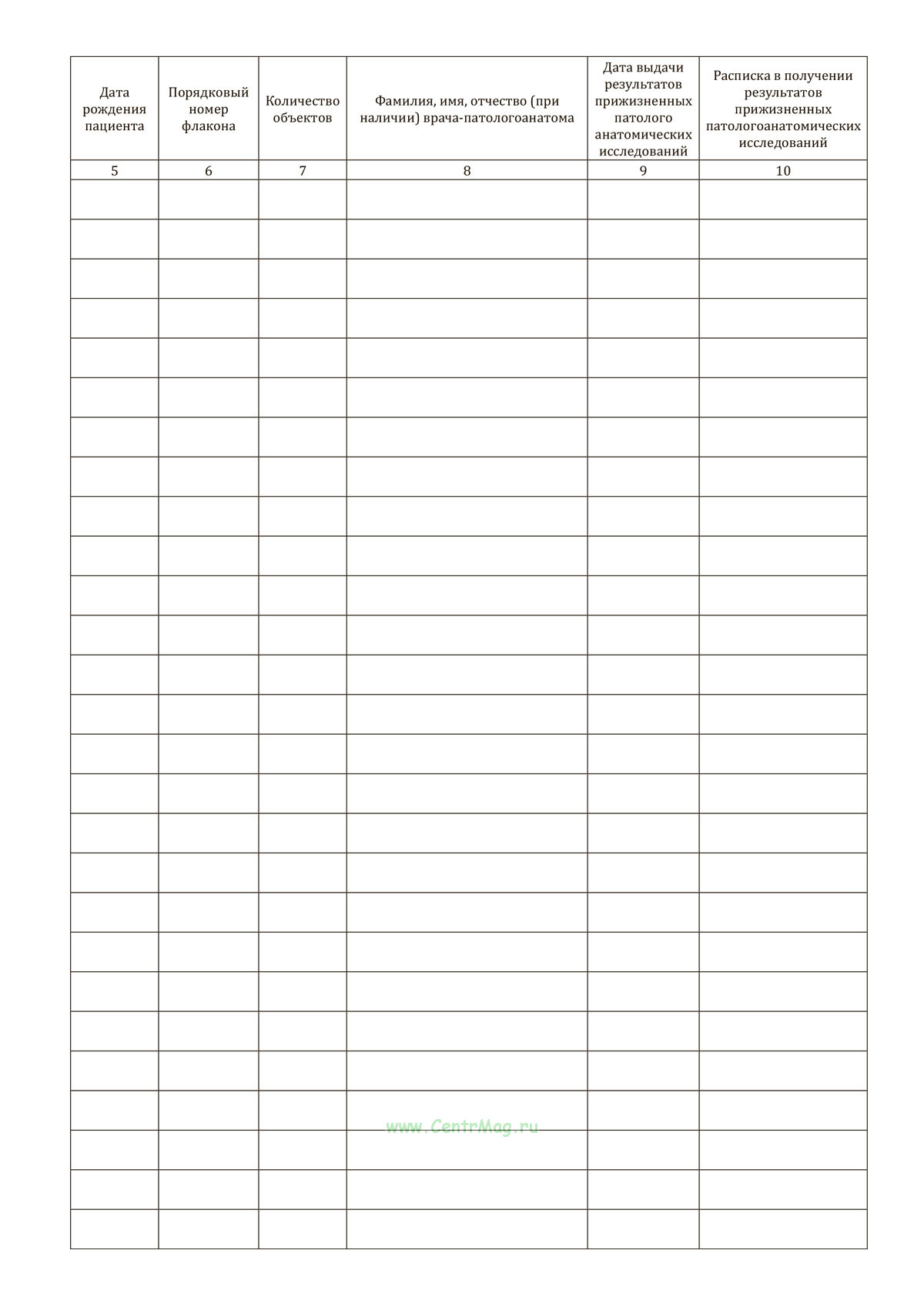 Сведения о поступлении в патолого-анатомическое бюро (отделение) биопсийного (операционного) материала на прижизненное патолого-анатомическое исследование вносятся в журнал регистрации поступления биопсийного (операционного) материала и выдачи результатов прижизненных патолого-анатомических исследований, и в пункты 1 - 16 протокола прижизненного патолого-анатомического исследования биопсийного (операционного) материала .