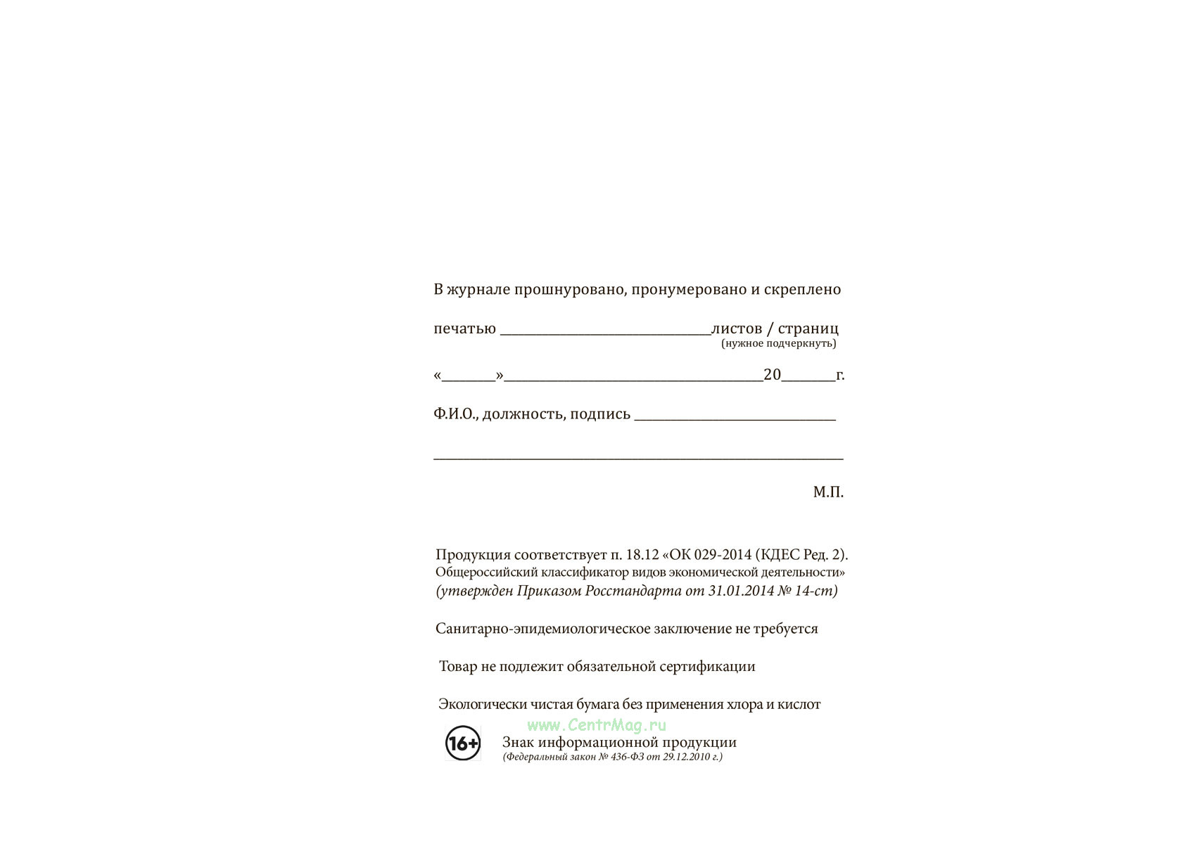 Вы получаете печатную продукцию прошнурованной и c местом для вашей печати в соответствии с действующими нормативными документами: