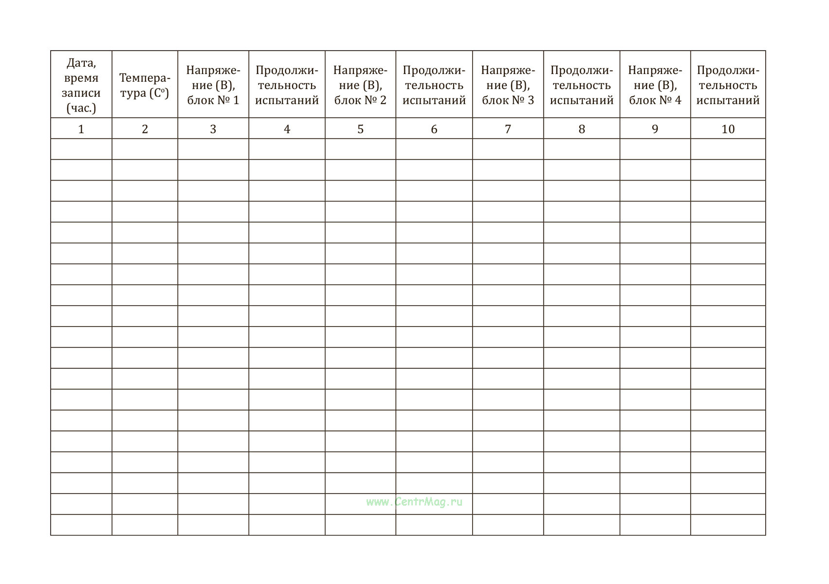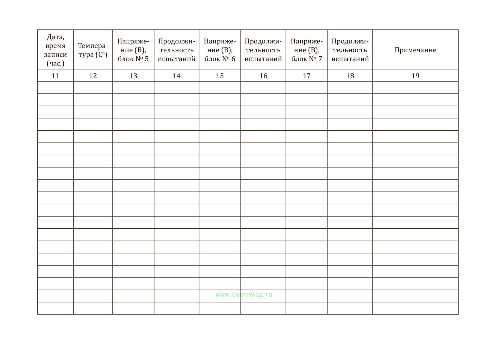 Журнал применяется для документирования параметров работы испытательной или климатической камеры. В нём фиксируются дата и время записи, температура, напряжение по каждому блоку и продолжительность испытаний. Такой учёт обеспечивает контроль условий проведения экспериментов или испытаний и позволяет в дальнейшем подтвердить корректность полученных результатов.