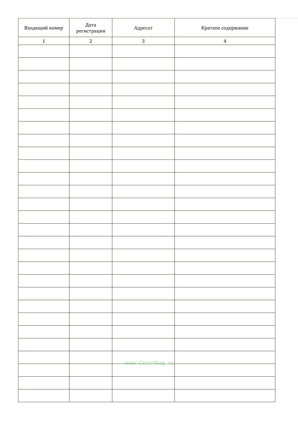 Журнал регистрации входящих документов имеет графы:
