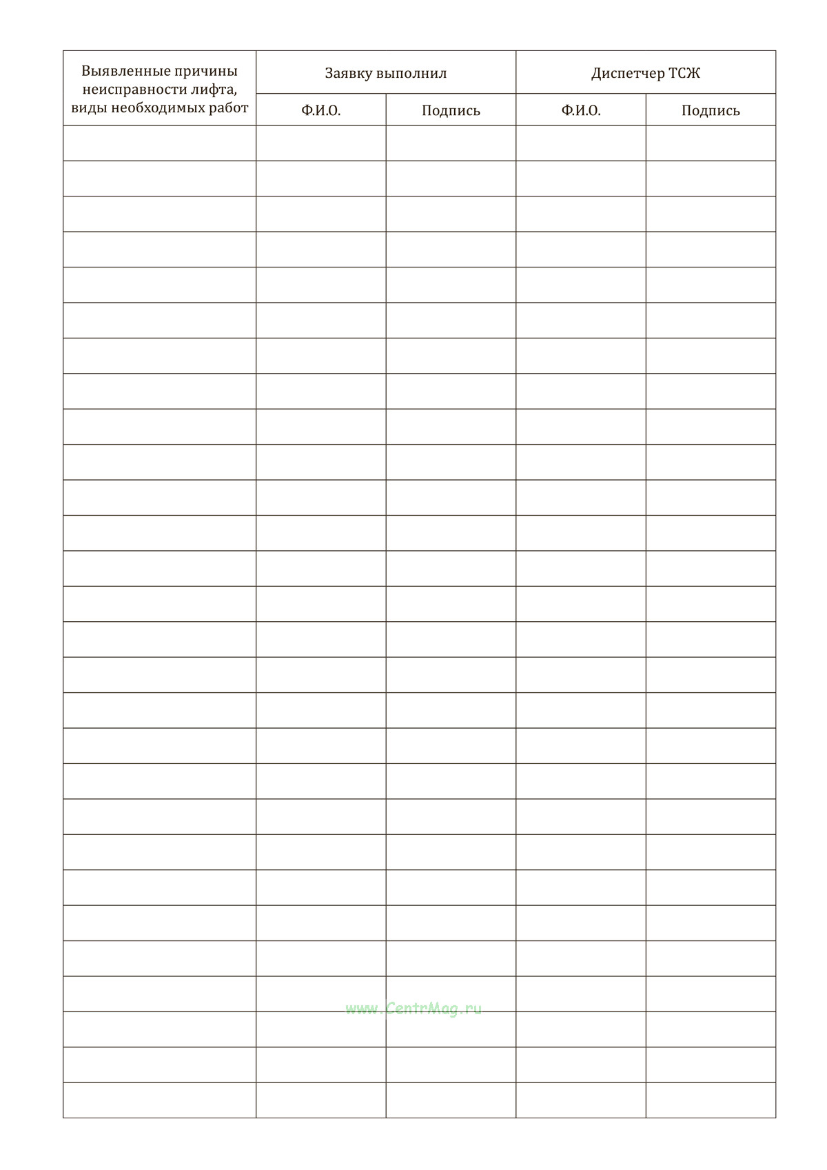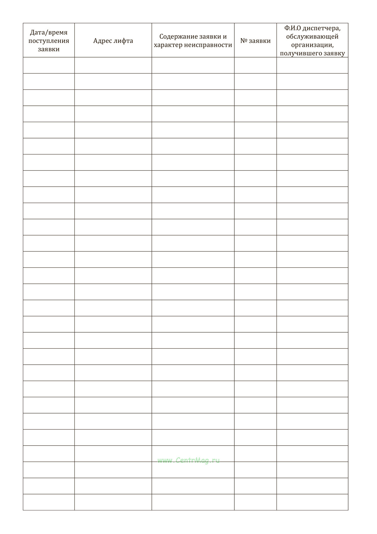 Журнал регистрации заявок о неисправностях лифтов МКД имеет графы: