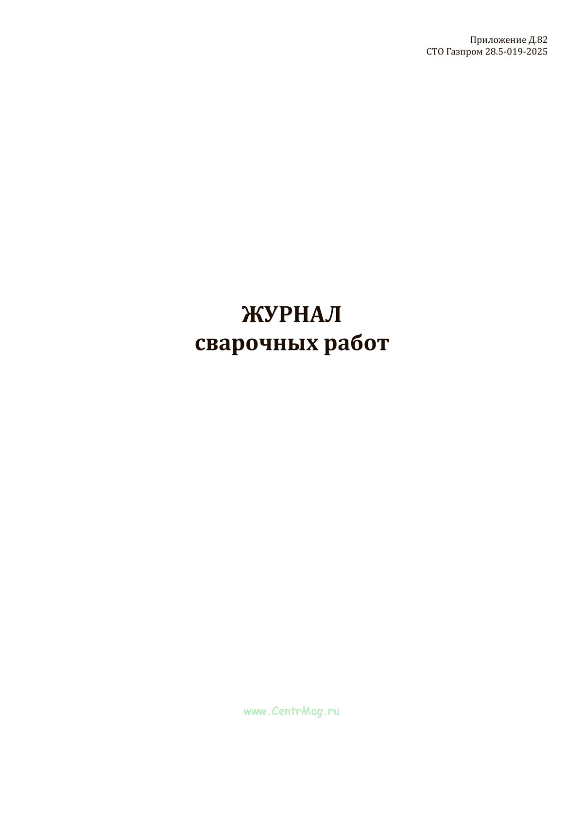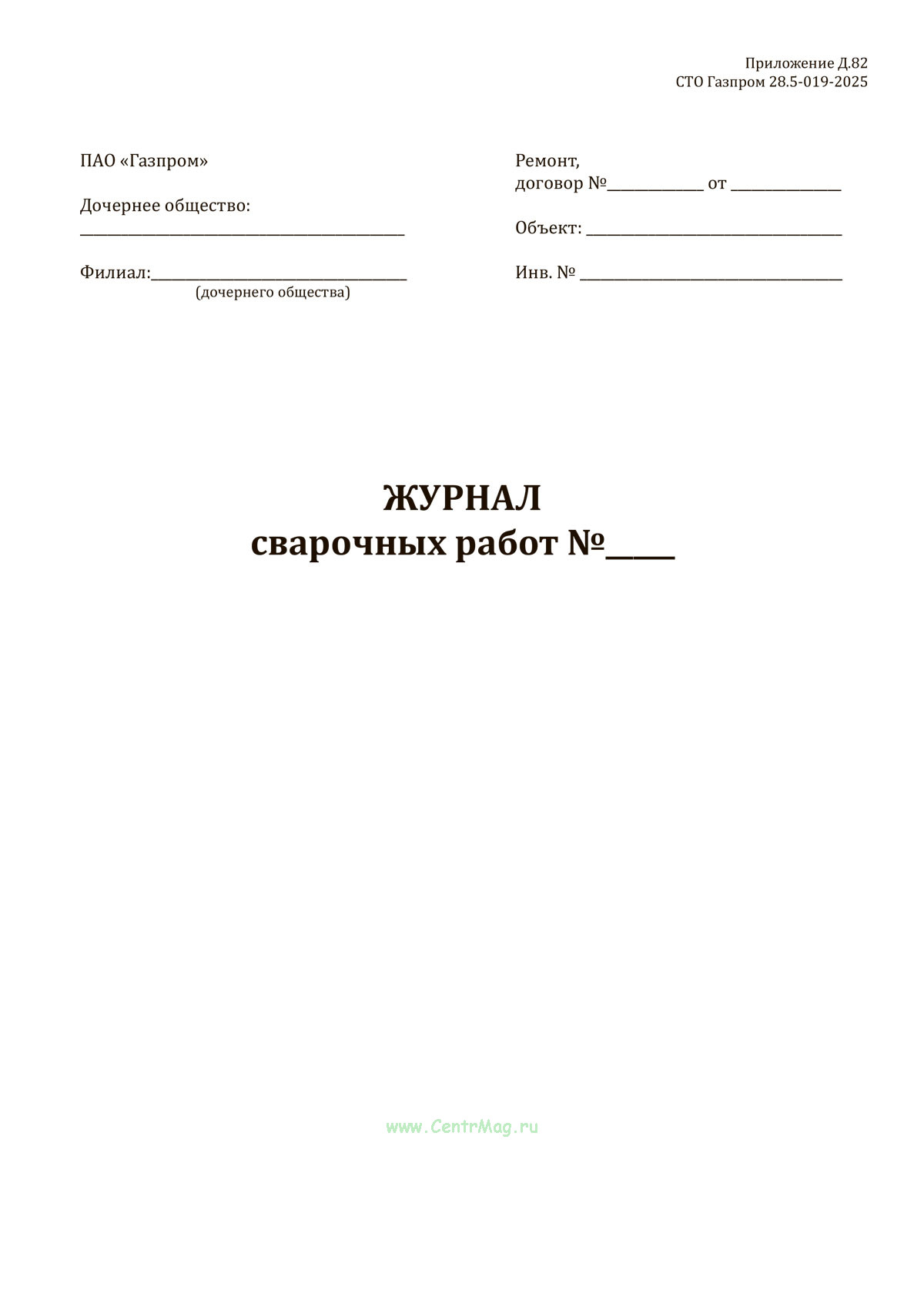 Форма Журнала сварочных работ соответствует Приложению Д. 82 к СТО Газпром 28.5-019-2025 "Исполнительная документация при ремонте"