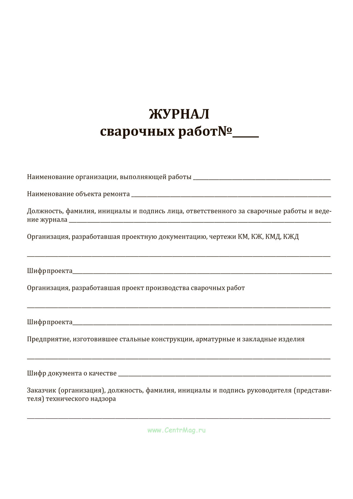 Журнал сварочных работ применяется для документального учета и контроля качества выполнения сварочных операций на объектах строительства, реконструкции и ремонта. Он содержит сведения об организациях, участвующих в проектировании и производстве работ, данных о проектной и исполнительной документации, составе инженерно-технического персонала и сварщиков, их квалификации и допусках. В журнале фиксируются даты выполнения работ, марки и характеристики сварочных материалов, погодные условия, схемы сварки, данные о визуальном и контролирующем осмотре швов. Журнал обеспечивает прослеживаемость всех этапов сварки, позволяет вести контроль над соблюдением технологических требований и служит подтверждением соответствия выполненных работ нормативной документации.