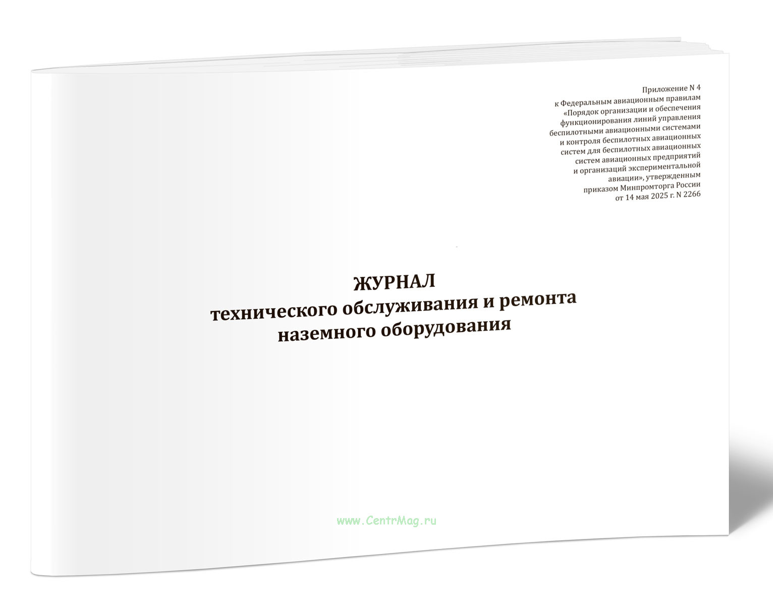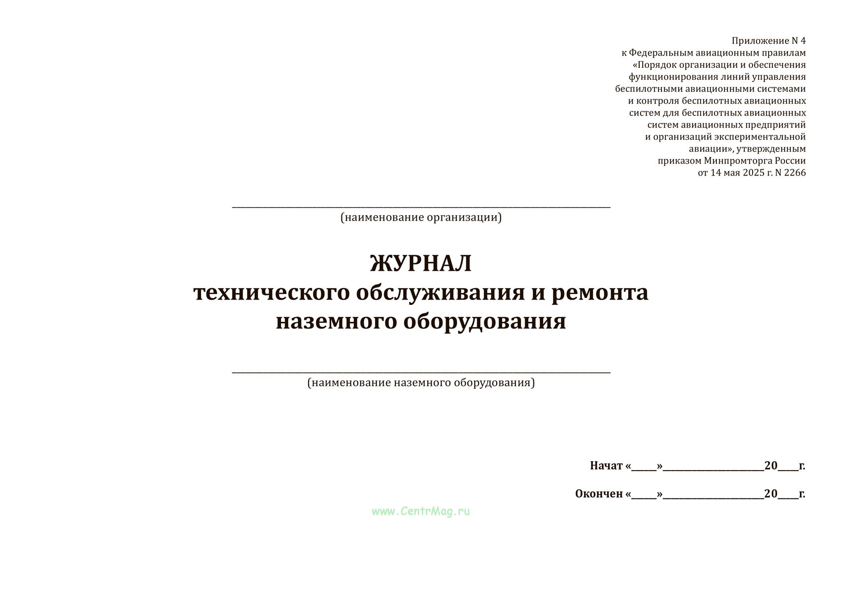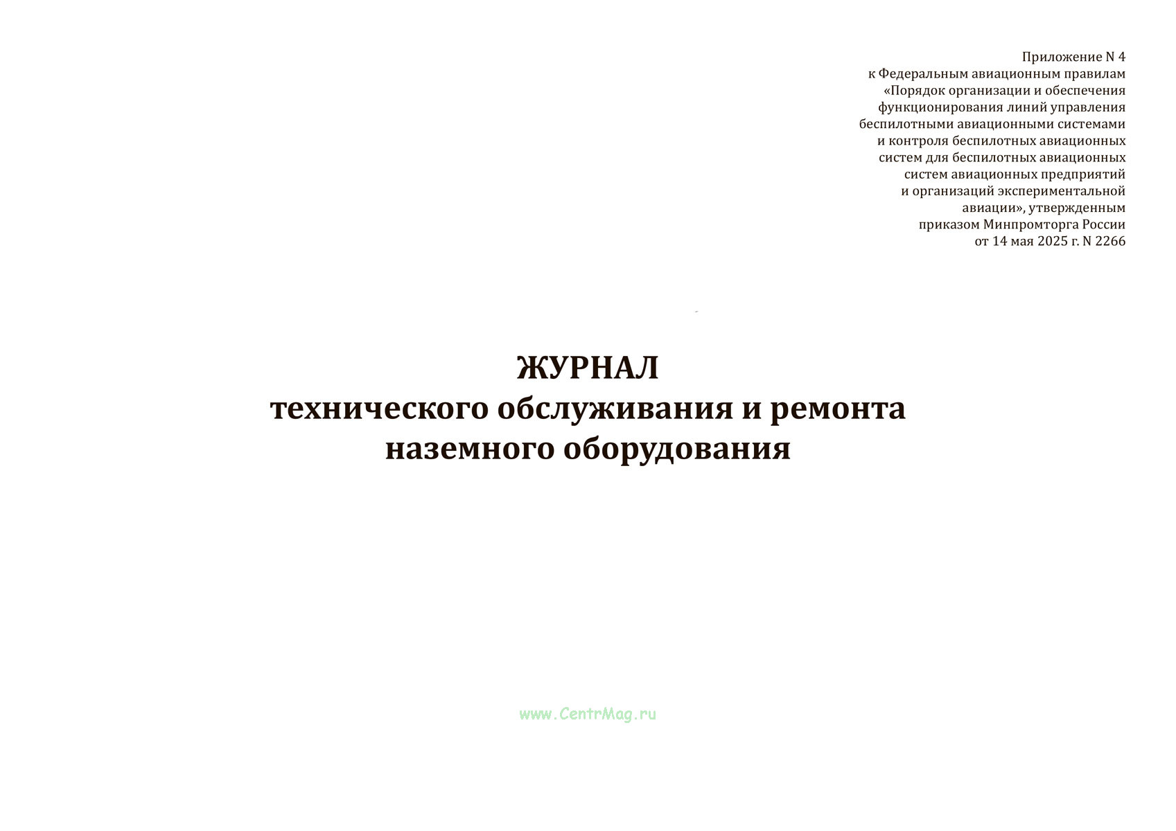Форма Журнала технического обслуживания и ремонта наземного оборудования соответствует Приложению N 4 к Приказу Минпромторга России от 14.05.2025 N 2266 "Об утверждении Федеральных авиационных правил "Порядок организации и обеспечения функционирования линий управления беспилотными авиационными системами и контроля беспилотных авиационных систем для беспилотных авиационных систем авиационных предприятий и организаций экспериментальной авиации"