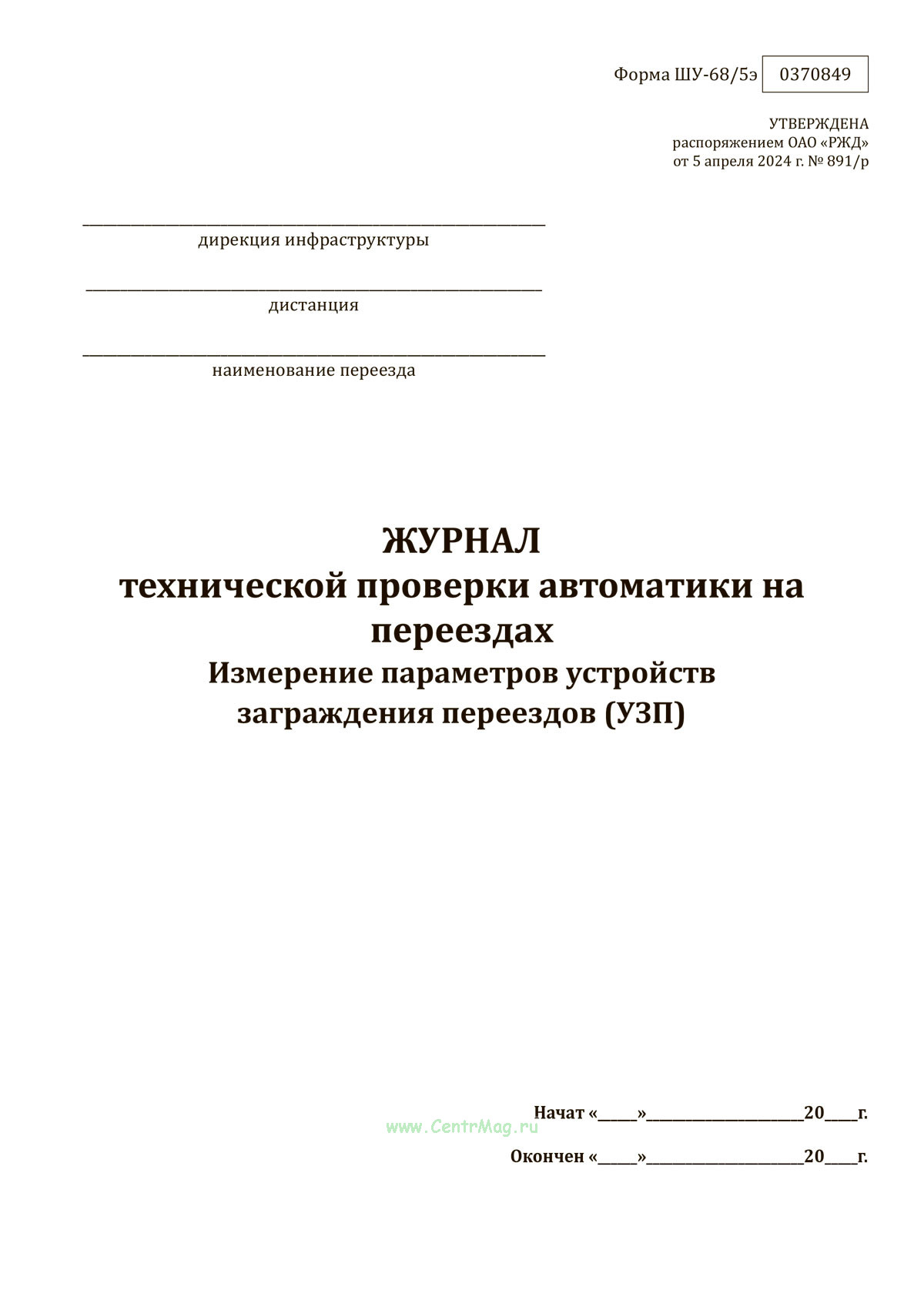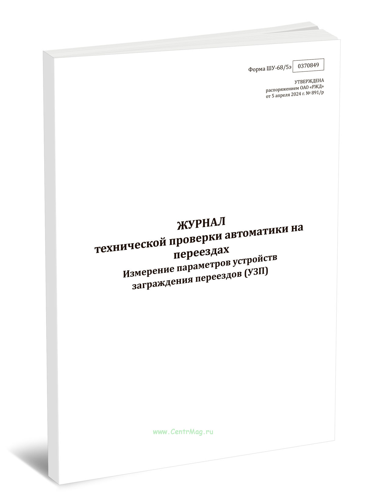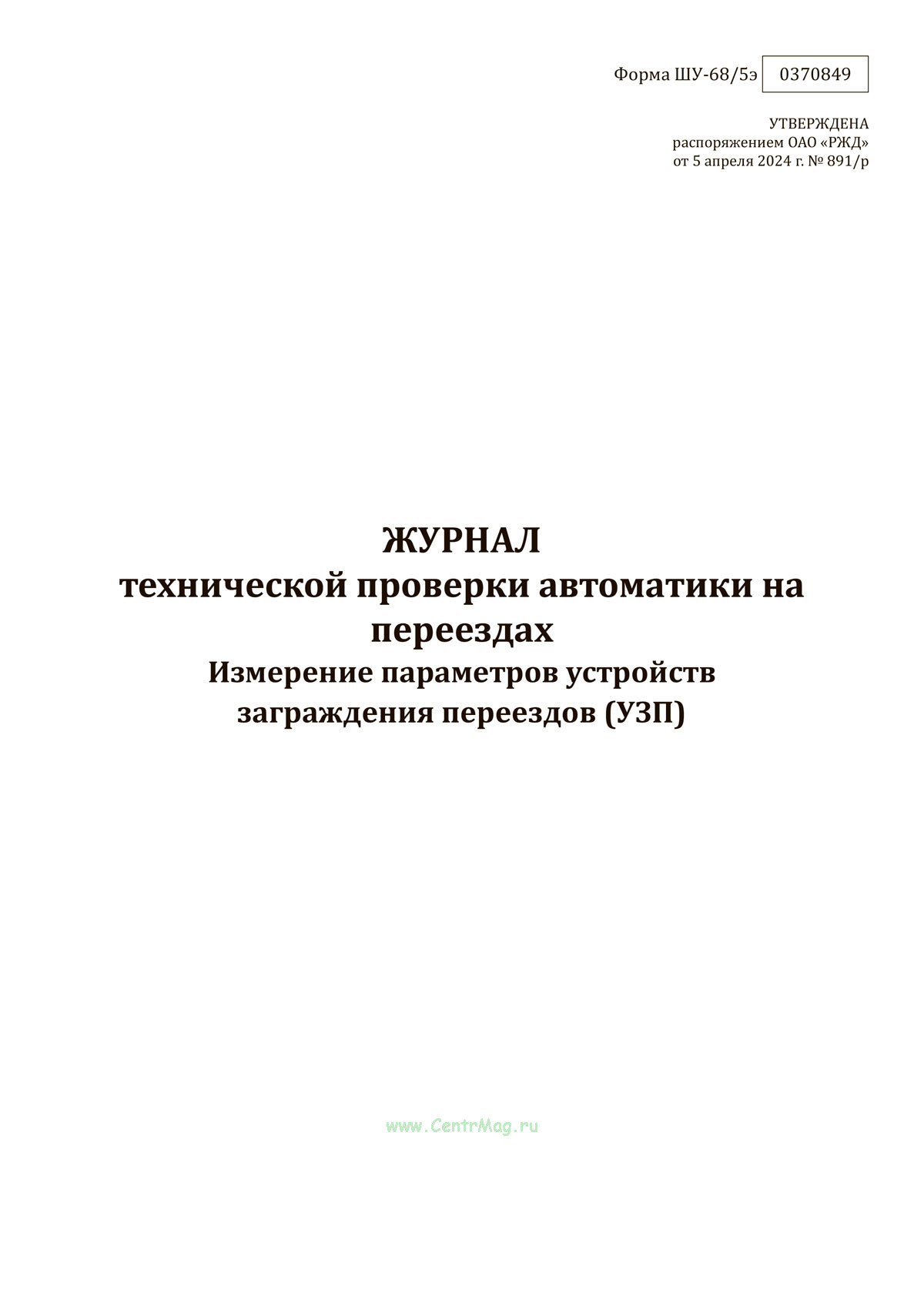 Форма журнала технической проверки автоматики на переездах. Измерение параметров устройств заграждения переездов (УЗП) (ШУ-68/5э) утверждена распоряжением ОАО "РЖД" от 5 апреля 2024 г. № 891/р "Об утверждении форм внутреннего первичного учета ОАО "РЖД" в хозяйстве автоматики и телемеханики"