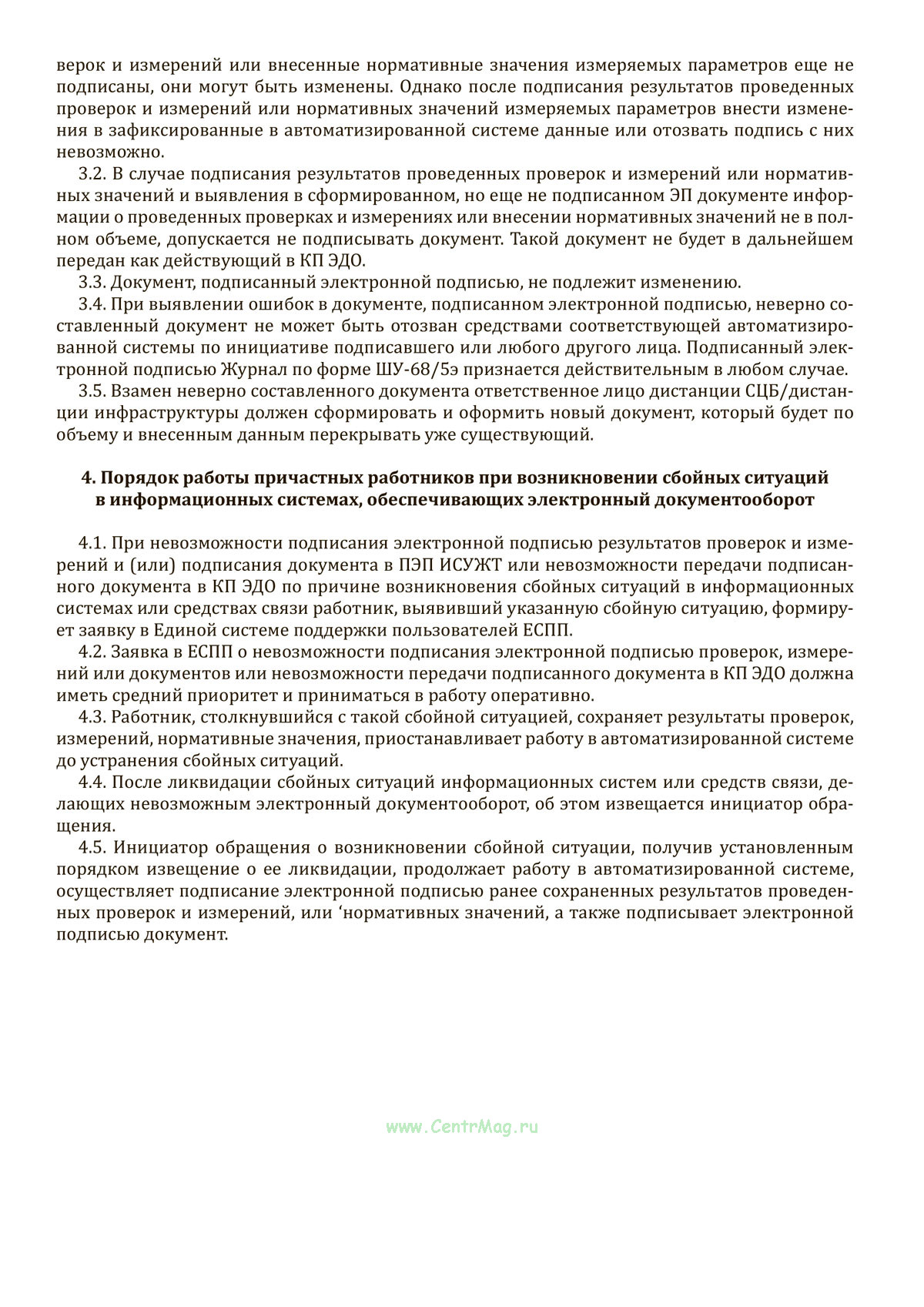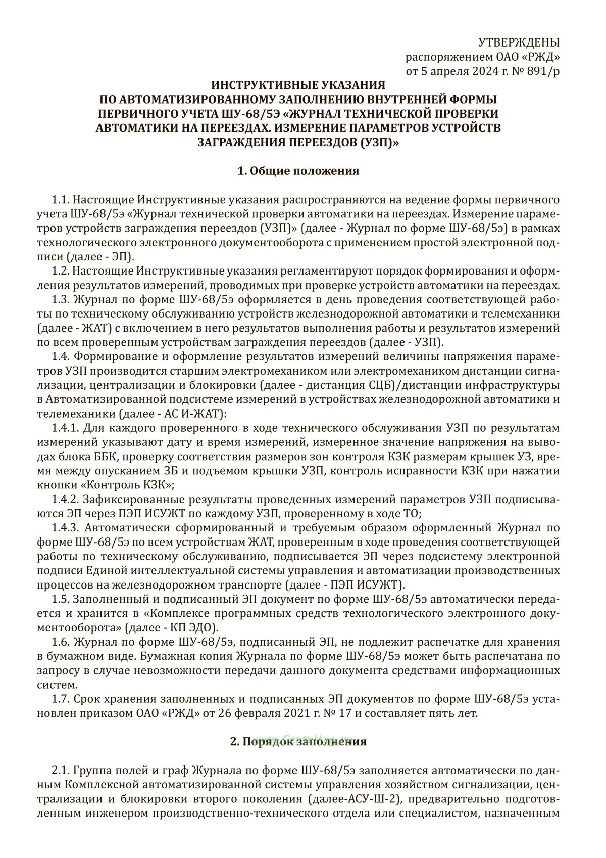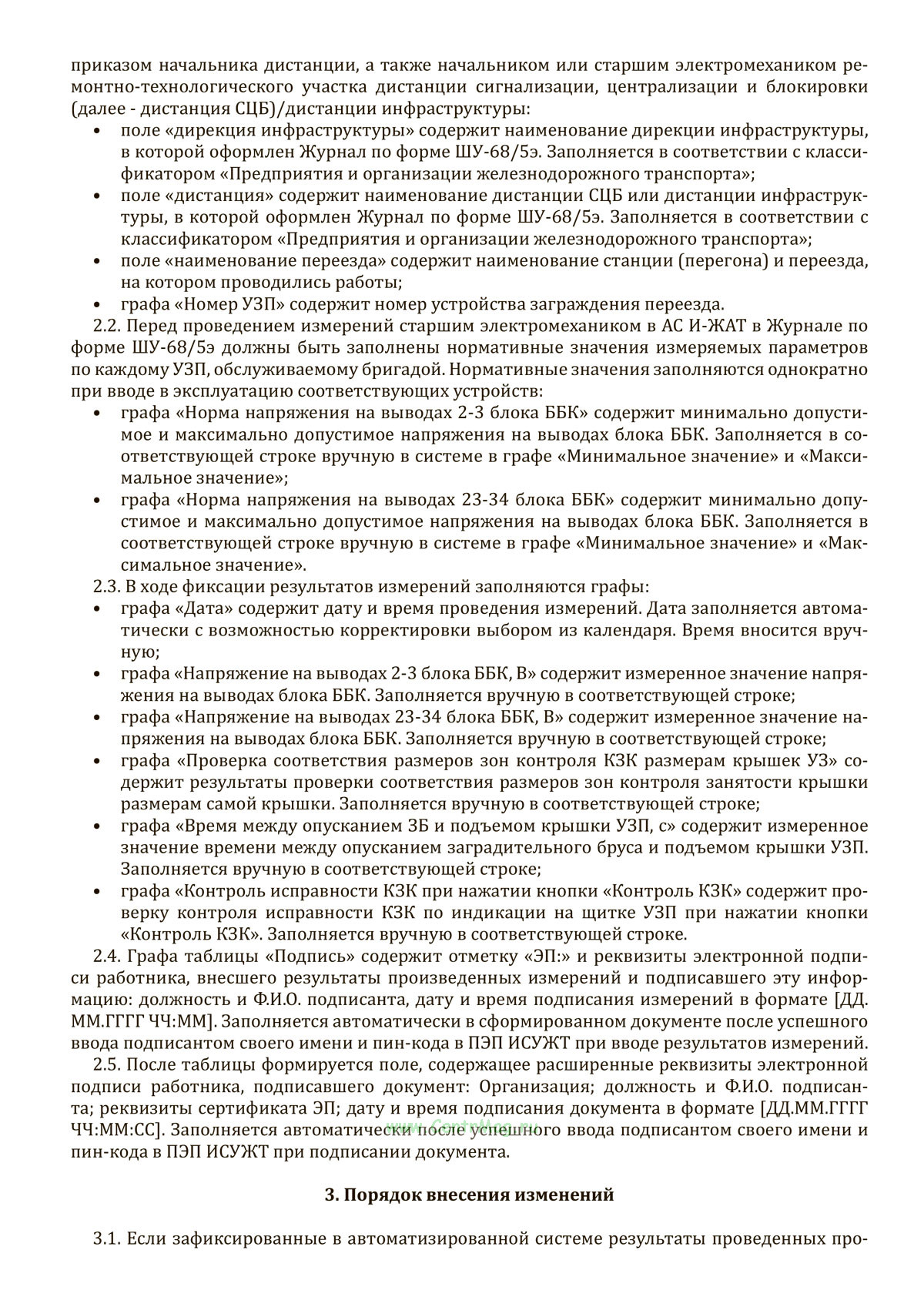 Журнал по форме ШУ-68/5э предназначен для первичного учета результатов проверки устройств автоматики на переездах и измерения параметров заграждений переездов. Он используется в рамках автоматизированного электронного документооборота с применением простой электронной подписи и регламентирует порядок оформления данных о напряжениях, зонах контроля и исправности устройств. Журнал заполняется в день проведения технического обслуживания, фиксируя дату, время, измеренные значения и состояние оборудования. Все результаты подписываются электронной подписью через систему ПЭП ИСУЖТ и автоматически сохраняются в системе электронного документооборота. Документ не подлежит обязательной печати, за исключением случаев невозможности передачи по системам. Срок хранения подписанных электронных документов составляет пять лет согласно установленным нормативам.