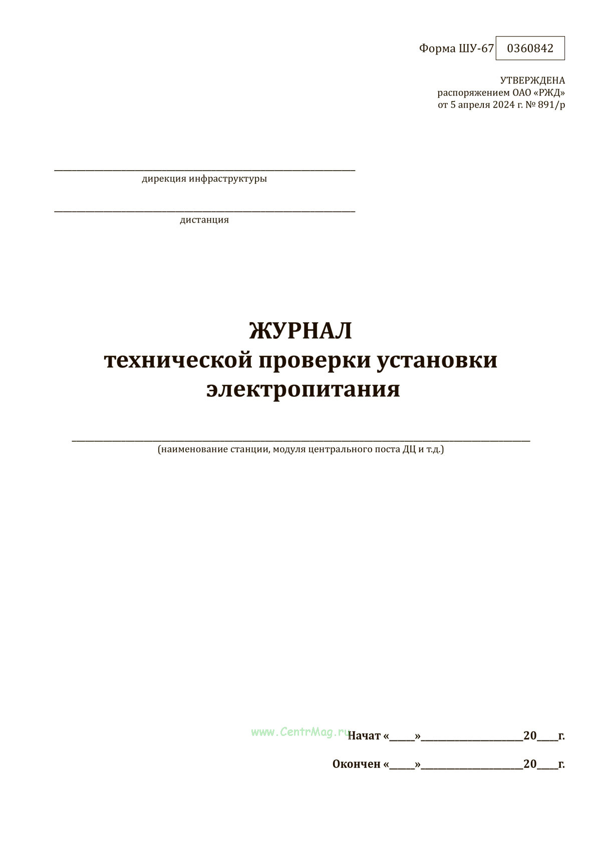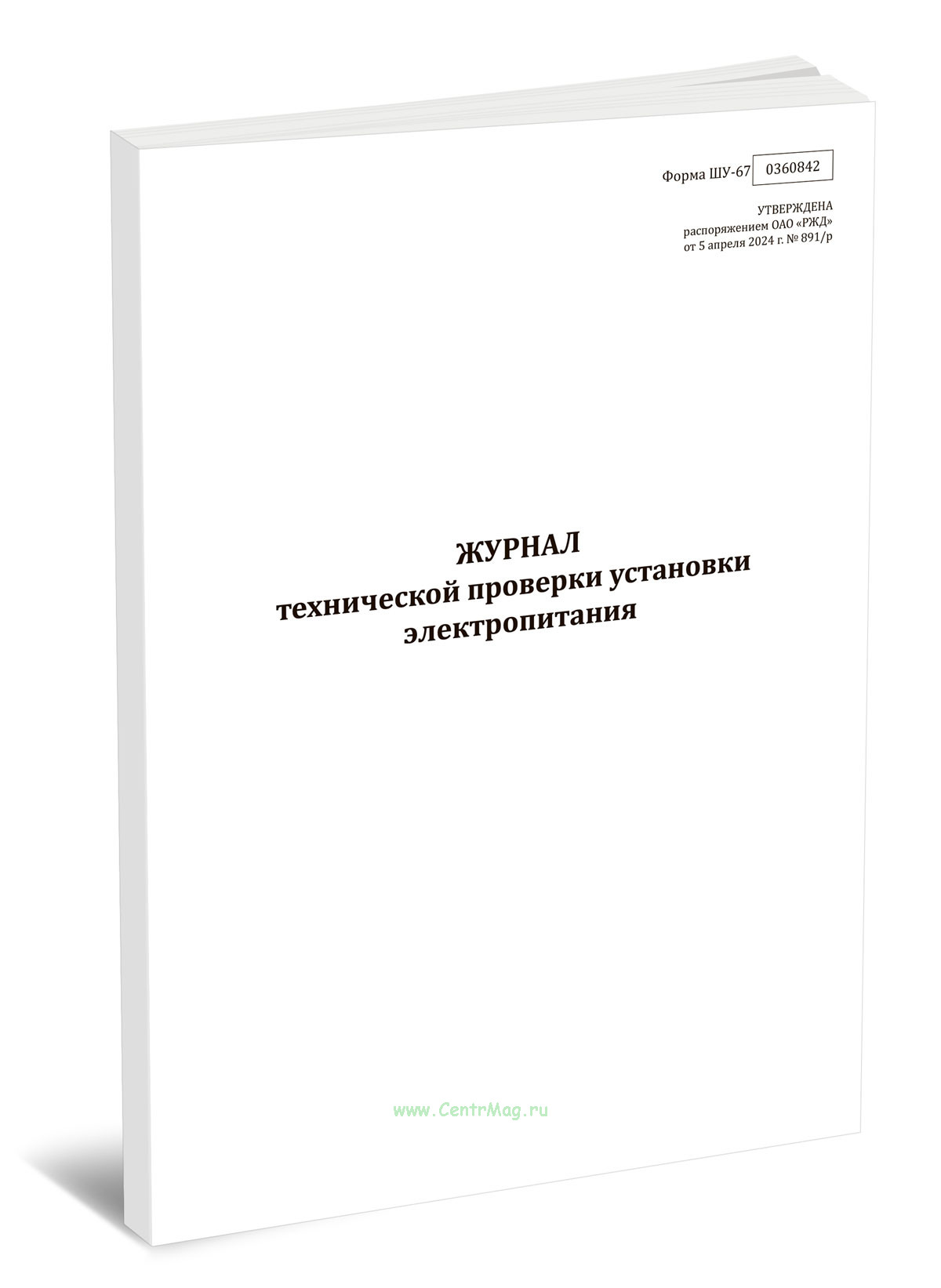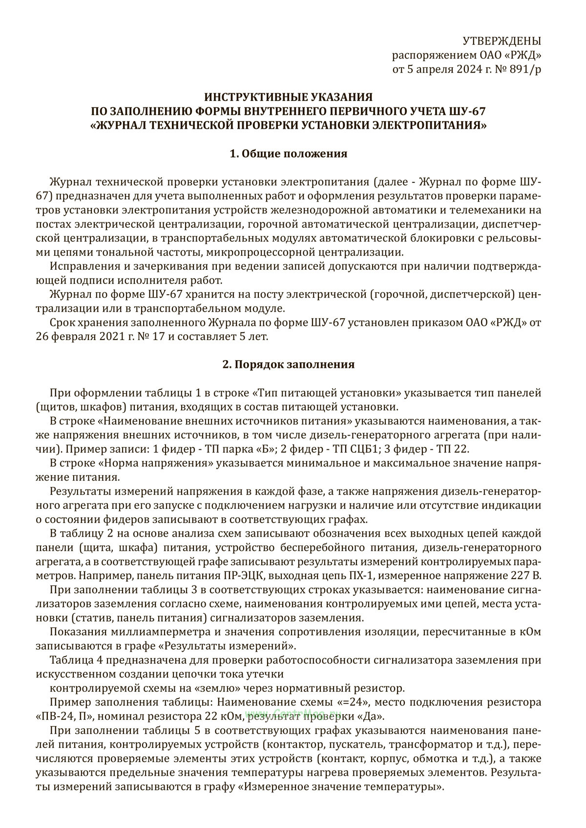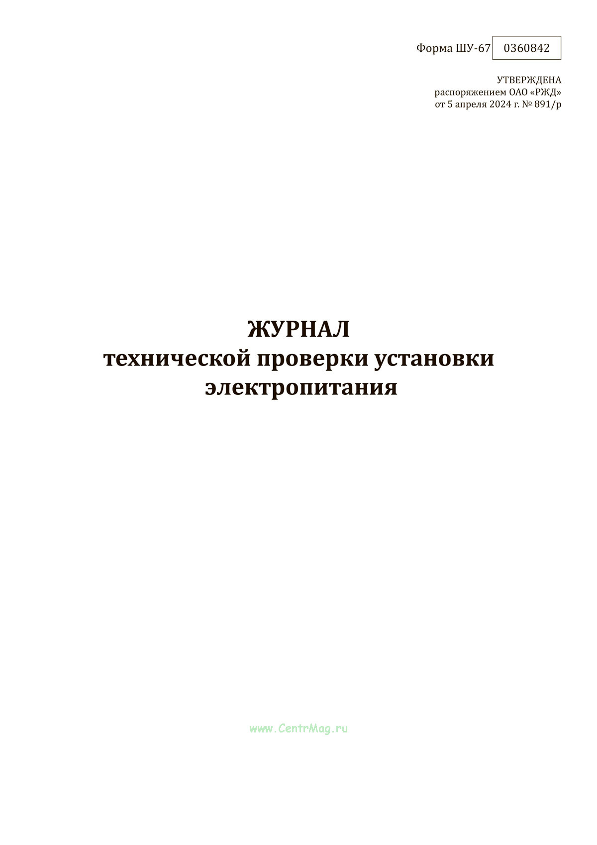Форма Журнала технической проверки установки электропитания (ШУ-67) утверждена распоряжением ОАО "РЖД" от 5 апреля 2024 г. № 891/р "Об утверждении форм внутреннего первичного учета ОАО "РЖД" в хозяйстве автоматики и телемеханики"