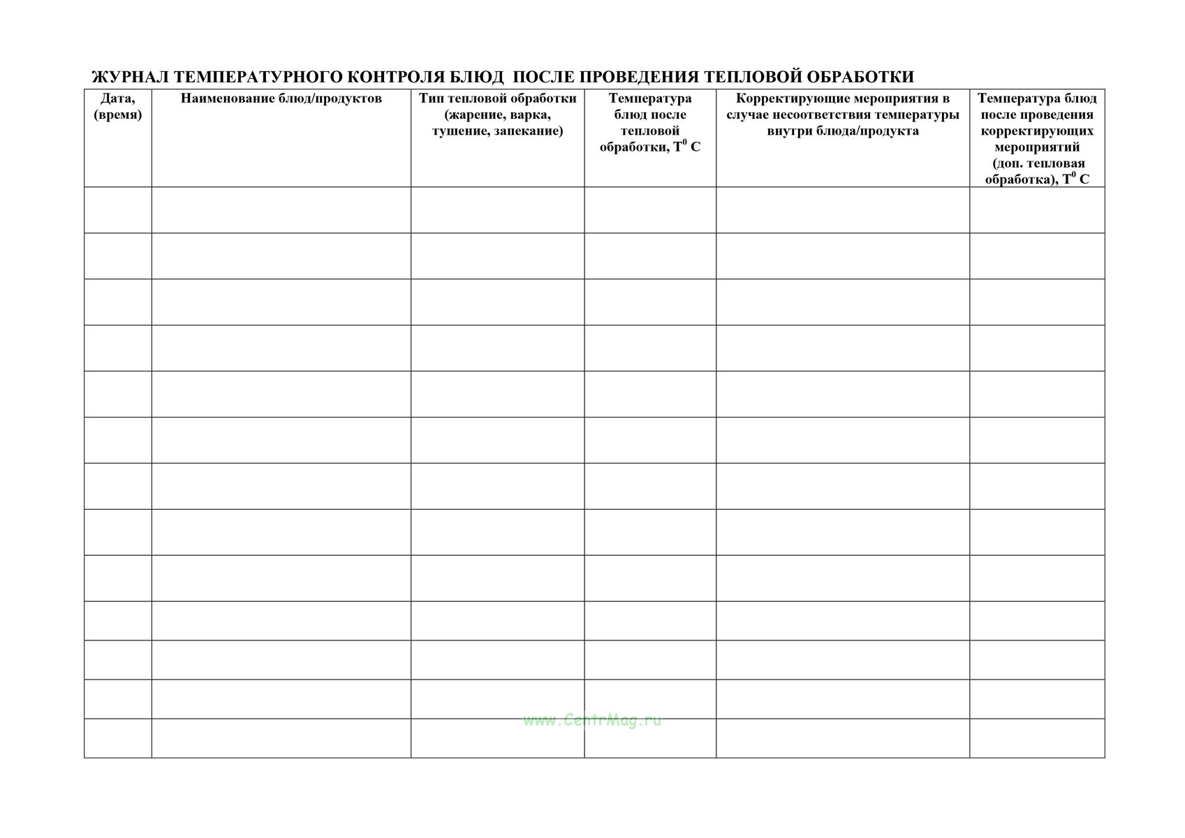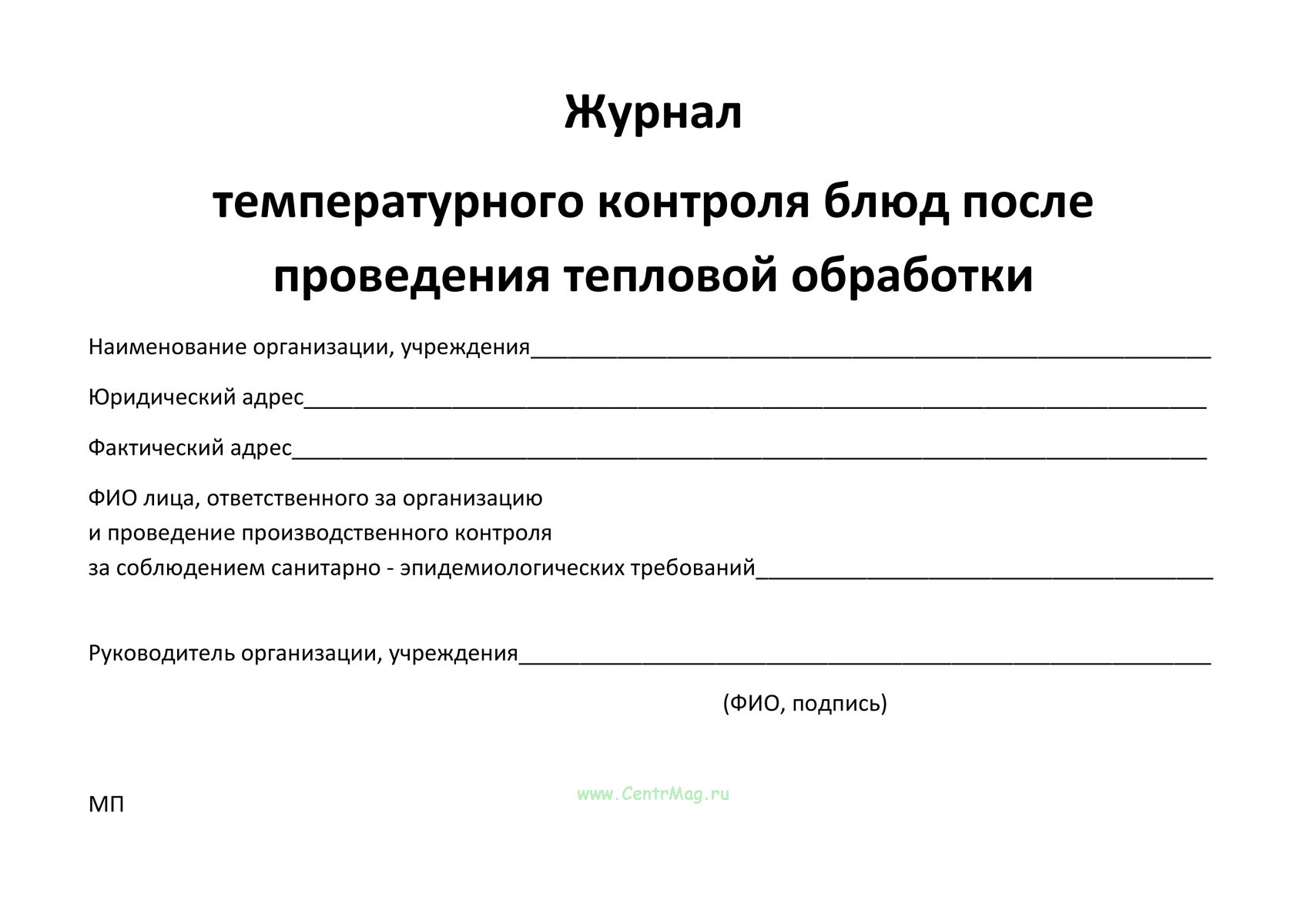 Журнал применяется для фиксации и контроля температуры блюд после тепловой обработки с целью обеспечения санитарно-эпидемиологической безопасности, подтверждения соблюдения технологических режимов приготовления пищи и предотвращения выпуска небезопасной продукции в организации общественного питания.