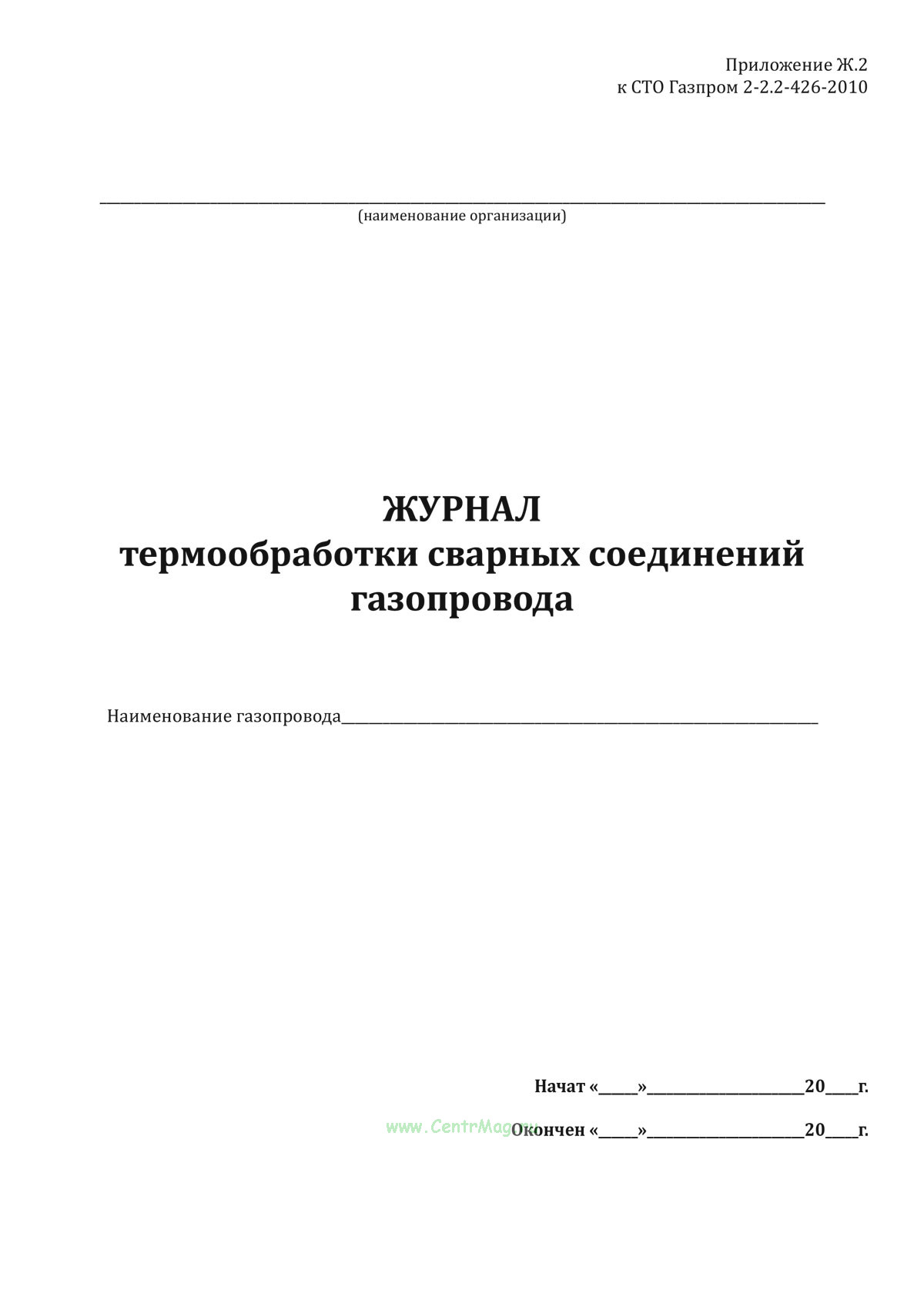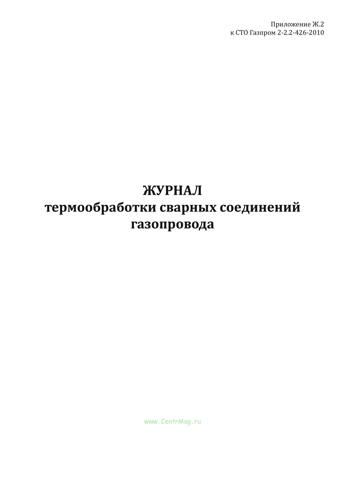 Форма Журнала термообработки сварных соединений газопровода соответствует Приложению Ж.2 к СТО Газпром 2-2.2-426-2010 "Инструкция по газопламенной обработке металлов при строительстве и ремонте промысловых и магистральных газопроводов, газопроводов систем газораспределения на объектах ОАО "Газпром"" утв. и введен распоряжением ОАО "Газпром" от 21 сентября 2009 г. № 296