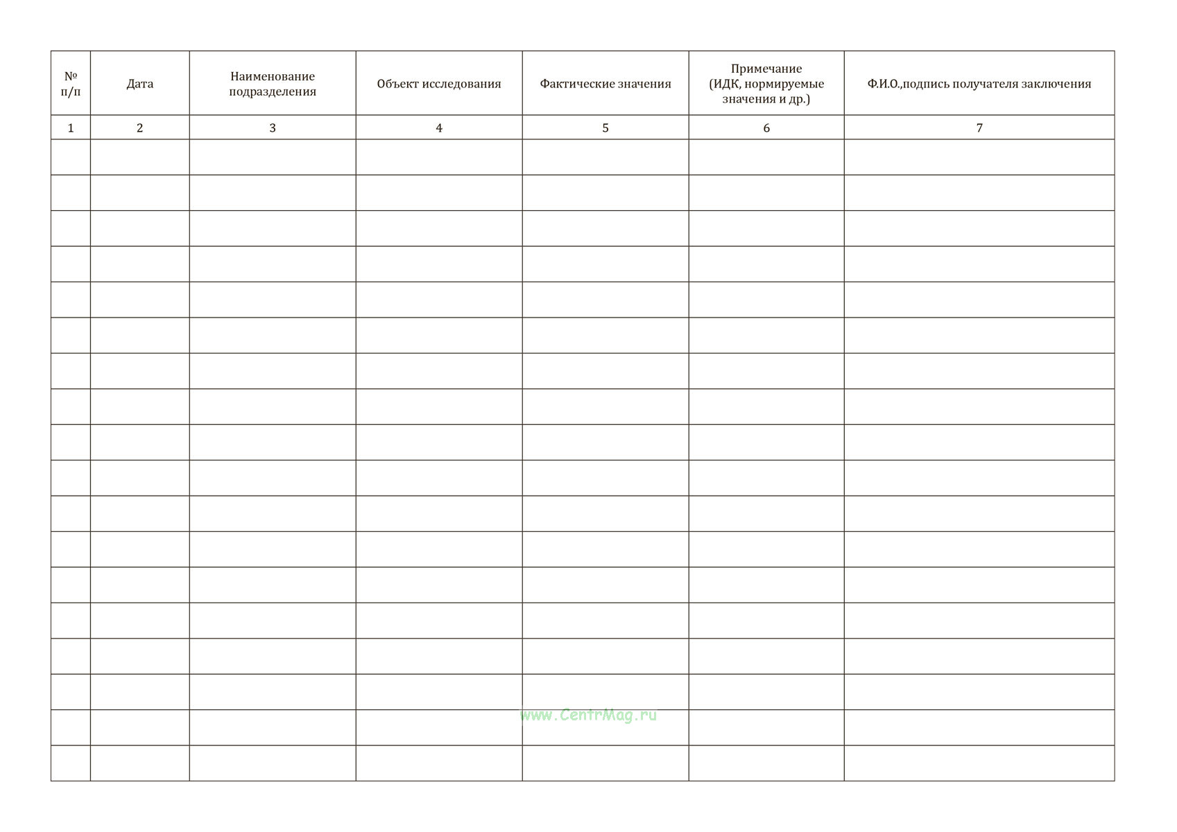 Журнал предназначен для регистрации выданных заключений с указанием даты, подразделения, объекта исследования, фактических значений показателей и подписи получателя, что обеспечивает учет и контроль выдачи результатов анализов.